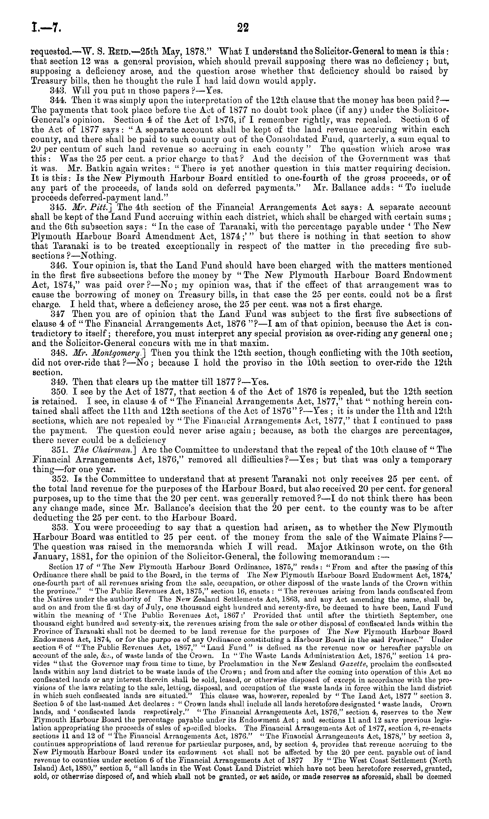requested.—W. S. Eeid. —25th May, 1878." What I understand the Solicitor-General to mean is this: that section 12 was a general provision, which should prevail supposing there was no deficiency ; but, supposing a deficiency arose, and the question arose whether that deficiency should be raised by Treasury bills, then he thought the rule I had laid down would apply. 343. Will you put in those papers ? —Tes. 344. Then it was simply upon the interpretation of the 12th clause that the money has been paid ?— The payments that took place before the Act of 1877 no doubt took place (if any) under the SolicitorGeneral's opinion. Section 4of the Act of 1«76, if I remember rightly, was repealed. Section 6of the Act of 1877 says : " A separate account shall be kept of the land revenue accruing within each county, and there shall be paid to such county out of the Consolidated Fund, quarterly, a sum equal to 20 per centum of such laud revenue so accruing in each county " The question which arose was this : Was the 25 per cent, a prior charge to that ? And the decision of the Government was that it was. Mr. Batkin again writes: " There is yet another question in this matter requiring decision. It is this: Is the New Plymouth Harbour Board entitled to one-fourth of the gross proceeds, or of any part of the proceeds, of lands sold on deferred payments." Mr. Ballance adds: "To include proceeds deferred-payment land." 345. Mr. Pitt.] The 4th section of the Financial Arrangements Act says: A separate account shall be kept of the Land Fund accruing within each district, which shall be charged with certain sums ; and the 6th subsection says: "In the case of Taranaki, with the percentage payable under ' The New Plymouth Harbour Board Amendment Act, 1874;' " but there is nothing in that section to show that Taranaki is to be treated exceptionally in respect of the matter in the preceding five subsections ? —Nothing. 346. Tour opinion is, that the Land Fund should have been charged with the matters mentioned in the first five subsections before the money by " The New Plymouth Harbour Board Endowment Act, 1874," was paid over ?—No; my opinion was, that if the effect of that arrangement was to cause the borrowing of money on Treasury bills, in that case the 25 per cents, could not be a first charge. I held that, where a deficiency arose, the 25 per cent, was not a first charge. 347 Then you are of opinion that the Land Fund was subject to the first five subsections of clause 4of "The Financial Arrangements Act, 1876 "? —I am of that opinion, because the Act is contradictory to itself; therefore, you must interpret any special provision as over-riding any general one ; and the Solicitor-General concurs with me in that maxim. 348. Mr. Montgomery .] Then you think the 12th section, though conflicting with the 10th section, did not over-ride that ?—No; because I hold the proviso in the 10th section to over-ride the 12th section. 349. Then that clears up the matter till 1877 ?—Tes. 350. I see by the Act of 1877, that section 4 of the Act of 1876 is repealed, but the 12th section is retained. I see, in clause 4of " The Financial Arrangements Act, 1877," that " nothing herein contained shall affect the 11th and 12th sections of the Act of 1876" ? —Yes ; it is under the 11th and 12th sections, which are not repealed by "The Financial Arrangements Act, 1877," that I continued to pass the payment. The question could never arise again; because, as both the charges are percentages, there never could be a deficiency 351. The Chairman.] Are the Committee to understand that the repeal of the 10th clause of " The Financial Arrangements Act, 1876," removed all difficulties ?—Yes; but that was only a temporary thing—for one year. 352. Is the Committee to understand that at present Taranaki not only receives 25 per cent, of the total land revenue for the purposes of the Harbour Board, but also received 20 per cent, for general purposes, up to the time that the 20 per cent, was generally removed ?—I do not think there has been any change made, since Mr. Ballance's decision that the 20 per cent, to the county was to be after deducting the 25 per cent, to the Harbour Board. 353. Tou were proceeding to say that a question had arisen, as to whether the New Plymouth Harbour Board was entitled to 25 per cent, of the money from the sale of the Waimate Plains ? — The question was raised in the memoranda which I will read. Major Atkinson wrote, on the 6th January, 1881, for the opinion of the Solicitor-General, the following memorandum :-— Section 17 of "The New Plymouth Harbour Board Ordinance, 1875," reads: "From and after the passing of this Ordinance there shall be paid to the Board, in the terms of The New Plymouth Harbour Board Endowment Act, 1874,' one-fourth part of all revenues arising from the sale, occupation, or other disposal of the waste lands of the Crown within the province." " The Public Revenues Act, 1875," section 16, enacts : " The revenues arising from lands confiscated from the Natives under the authority of The New Zealand Settlements Act, 1863, and any Act amending the same, shall be, and on and from the fi-st day of July, one thousand eight hundred and seventy-five, be deemed to have been, Land Fund within the meaning of 'The Public Revenues Act, 1867:' Provided that until after the thirtieth September, one thousand eight hundred and seventy-six, the revenues arising from the sale or other disposal of confiscated lands within the Province of Taranaki shall not be deemed to be land revenue for the purposes of The New Plymouth Harbour Board Endowment Act, 1874, or for the purpoes of any Ordinance constituting a Harbour Board in the said Province." Tinder section 6 of "The Public Revenues Act, 1867," "Land Fund" is defined as the revenue now or hereafter payable on account of the sale, &c, of waste lands of the Crown. In "The Waste Lands Administration Act, 1876," section 14 provides " that
