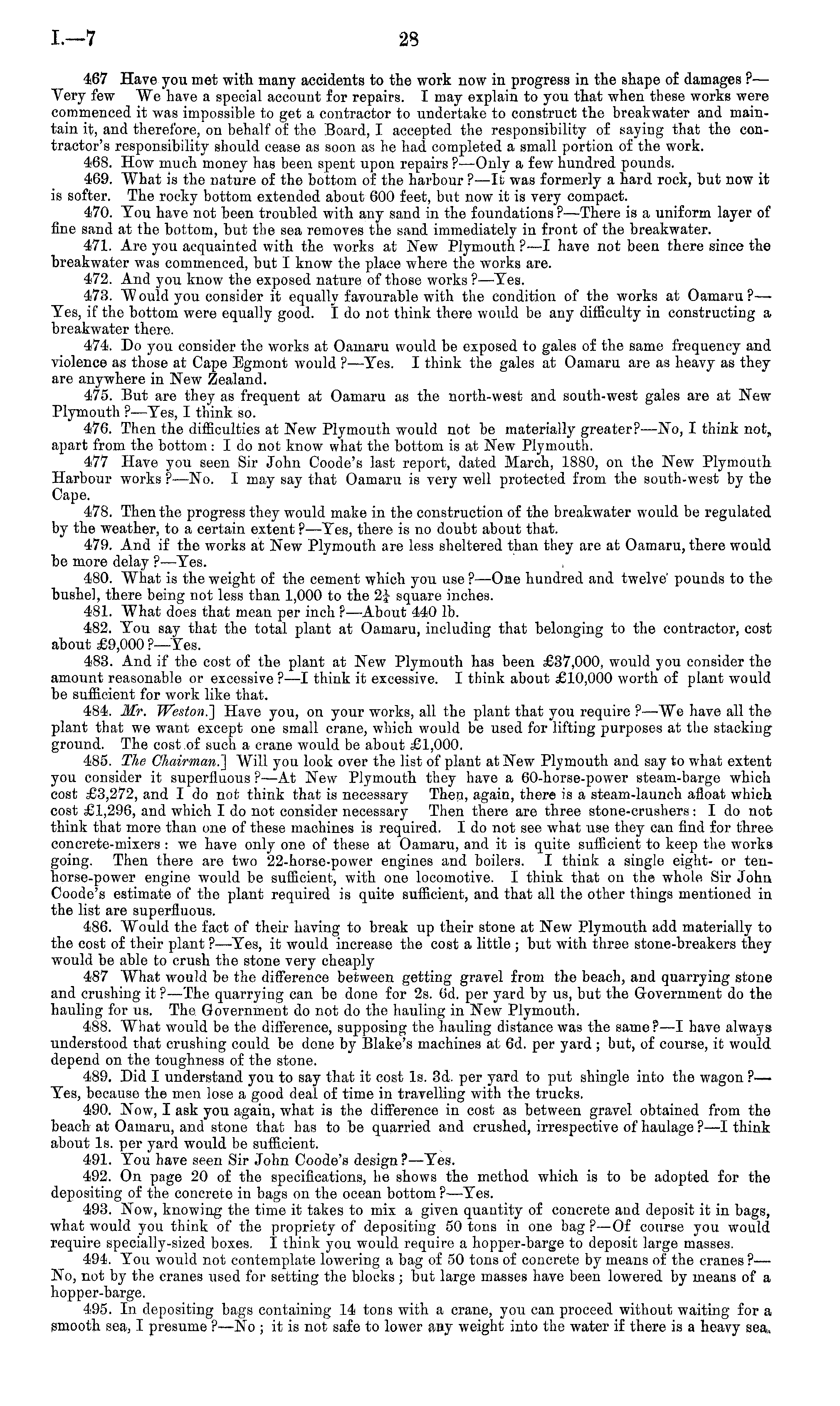 467 Have you met with many accidents to the work now in progress in the shape of damages ?— Very few We have a special account for repairs. I may explain to you that when these works were commenced it was impossible to get a contractor to undertake to construct the breakwater and maintain it, and therefore, on behalf of the Board, I accepted the responsibility of saying that the contractor's responsibility should cease as soon as he had completed a small portion of the work. 468. How much money has been spent upon repairs ?• —Only a few hundred pounds. 469. What is the nature of the bottom of the harbour ? —lt was formerly a hard rock, but now it is softer. The rocky bottom extended about 600 feet, but now it is very compact. 470. You have not been troubled with any sand in the foundations ?—There is a uniform layer of fine sand at the bottom, but the sea removes the sand immediately in front of the breakwater. 471. Are you acquainted with the works at New Plymouth ?—I have not been there since the breakwater was commenced, but I know the place where the works are. 472. And you know the exposed nature of those works ?—Yes. 473. Would you consider it equally favourable with the condition of the works at Oamaru?—Yes, if the bottom were equally good. Ido not think there would be any difficulty in constructing a breakwater there. 474. Do you consider the works at Oamaru would be exposed to gales of the same frequency and violence as those at Cape Egmont would ? —Yes. I think the gales at Oamaru are as heavy as they are anywhere in New Zealand. 475. But are they as frequent at Oamaru as the north-west and south-west gales are at New Plymouth ?—Yes, I think so. 476. Then the difficulties at New Plymouth would not be materially greater? —No, I think not, apart from the bottom: Ido not know what the bottom is at New Plymouth. 477 Have you seen Sir John Coode's last report, dated March, 1880, on the New Plymouth Harbour works ? —No. I may say that Oamaru is very well protected from the south-west by the Cape. 478. Then the progress they would make in the construction of the breakwater would be regulated by the weather, to a certain extent ? —Yes, there is no doubt about that. 479. And if the works at New Plymouth are less sheltered than they are at Oamaru, there would be more delay ? —Yes. 480. What is the weight of the cement which you use ? —One hundred and twelve' pounds to the bushel, there being not less than 1,000 to the 2\ square inches. 481. What does that mean per inch ? —About 440 lb. 482. You say that the total plant at Oamaru, including that belonging to the contractor, cost about £9,000 ?—Tes. 483. And if the cost of the plant at New Plymouth has been £37,000, would you consider the amount reasonable or excessive ? —I think it excessive. I think about £10,000 worth of plant would be sufficient for work like that. 484. Mr. Weston!] Have you, on your works, all the plant that you require ? —We have all the plant that we want except one small crane, which would be used for lifting purposes at the stacking ground. The cost of such a crane would be about £1,000. 485. The Chairman!] Will you look over the list of plant at New Plymouth and say to what extent you consider it superfluous ? —At New Plymouth they have a 60-horse-power steam-barge which cost £3,272, and Ido not think that is necessary Then, again, there is a steam-launch afloat which cost £1,296, and which Ido not consider necessary Then there are three stone-crushers: Ido not think that more than one of these machines is required. Ido not see what use they can find for three concrete-mixers : we have only one of these at Oamaru, and it is quite sufficient to keep the works going. Then there are two 22-horse-power engines and boilers. I think a single eight- or ten-horse-power engine would be sufficient, with one locomotive. I think that on the whole Sir John Coode's estimate of the plant required is quite sufficient, and that all the other things mentioned in the list are superfluous. 486. Would the fact of their having to break up their stone at New Plymouth add materially to the cost of their plant ?—-Tes, it would increase the cost a little ; but with three stone-breakers they would be able to crush the stone very cheaply 487 What would be the difference between getting gravel from the beach, and quarrying stone and crushing it ? —The quarrying can be done for 2s. Od. per yard by us, but the Government do the hauling for us. The. Government do not do the hauling in New Plymouth. 488. What would be the difference, supposing the hauling distance was the same?—l have always understood that crushing could be done by Blake's machines at 6d. per yard ; but, of course, it would depend on the toughness of the stone. 489. Did I understand you to say that it cost Is. 3d, per yard to put shingle into the wagon ?— Tes, because the men lose a good deal of time in travelling with the trucks. 490. Now, I ask you again, what is the difference in cost as between gravel obtained from the beach at Oamaru, and stone that has to be quarried and crushed, irrespective of haulage ?—I think about Is. per yard would be sufficient. 491. Tou have seen Sir John Coode's design ?—Tes. 492. On page 20 of the specifications, he shows the method which is to be adopted for the depositing of the concrete in bags on the ocean bottom ? —Tes. 493. Now, knowing the time it takes to mix a given quantity of concrete and deposit it in bags, what would you think of the propriety of depositing 50 tons in one bag ? —Of course you would require specially-sized boxes. I think you would require a hopper-barge to deposit large masses. 494. Tou would not contemplate lowering a bag of 50 tons of concrete by means of the cranes?— No, not by the cranes used for setting the blocks ; but large masses have been lowered by means of a hopper-barge. 495. In depositing bags containing 14 tons with a crane, you can proceed