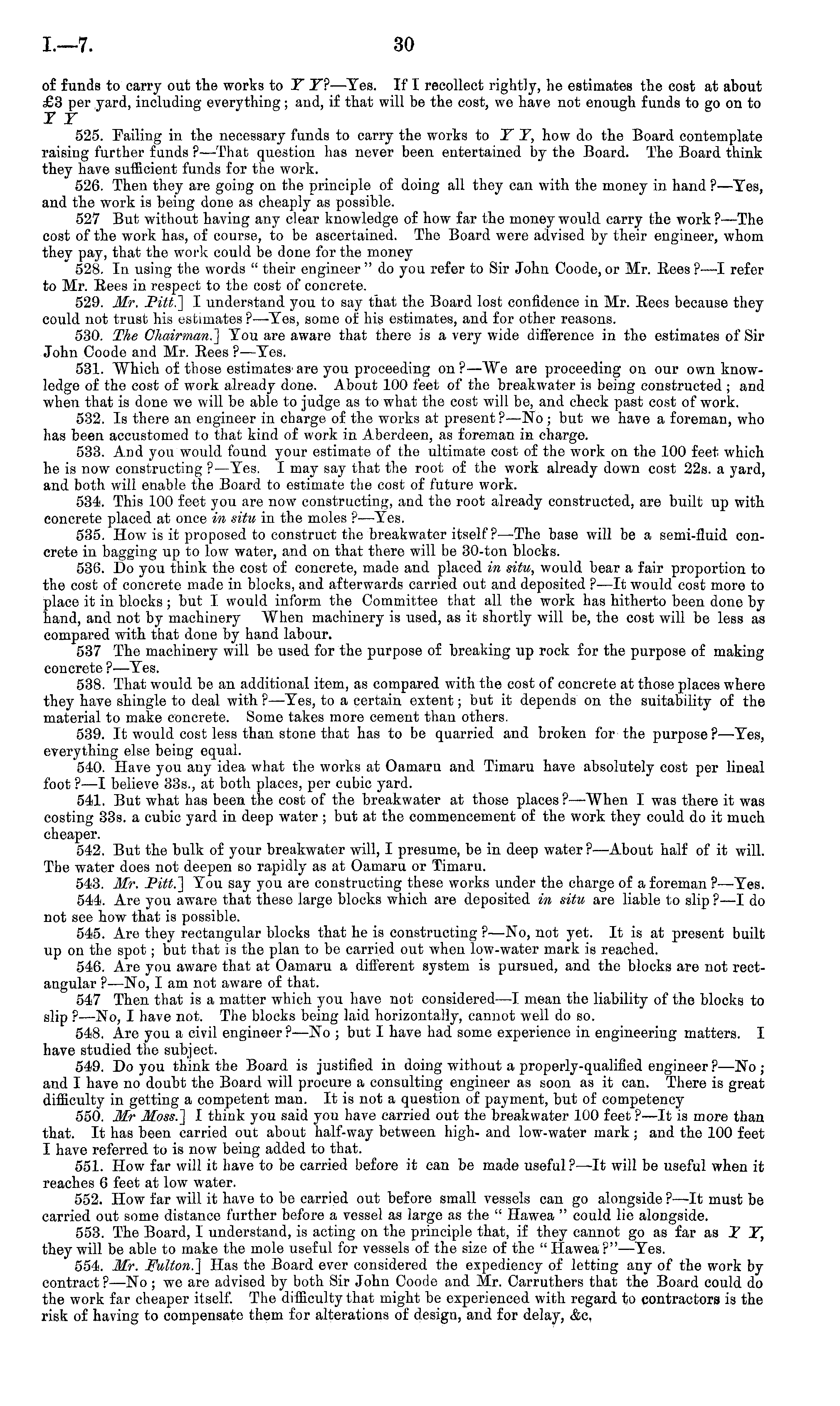 of funds to carry out the works to V Y? —Tes. If I recollect rightly, he estimates the cost at about £3 per yard, including everything; and, if that will be the cost, we have not enough funds to go on to V V 525. Eailing in the necessary funds to carry the works to YY, how do the Board contemplate raising further funds ? —That question has never been entertained by the Board. The Board think they have sufficient funds for the work. 526. Then they are going on the principle of doing all they can with the money in hand ? —Tes, and the work is being done as cheaply as possible. 527 But without having any clear knowledge of how far the money would carry the work?— The cost of the work has, of course, to be ascertained. The Board were advised by their engineer, whom they pay, that the work could be done for the money 528. In using the words " their engineer "do you refer to Sir John Coode, or Mr. Eees ?—I refer to Mr. Eees in respect to the cost of concrete. 529. Mr. Pitt.] I understand you to say that the Board lost confidence in Mr. Eees because they could not trust his estimates ?—Tes, some of his estimates, and for other reasons. 530. The Chairman.] Tou are aware that there is a very wide difference in the estimates of Sir John Coode and Mr. Eees ? —Tes. 531. Which of those estimates are you proceeding on ? —We are proceeding on our own knowledge of the cost of work already done. About 100 feet of the breakwater is being constructed ; and when that is done we will be able to judge as to what the cost will be, and check past cost of work. 532. Is there an engineer in charge of the works at present?—No ; but we have a foreman, who has been accustomed to that kind of work in Aberdeen, as foreman in charge. 533. And you would found your estimate of the ultimate cost of the work on the 100 feet which he is now constructing ? —Tes. I may say that the root of the work already down cost 225. a yard, and both will enable the Board to estimate the cost of future work. 534. This 100 feet you are now constructing, and the root already constructed, are built up with concrete placed at once in situ in the moles ? —Tes. 535. How is it proposed to construct the breakwater itself ? —The base will be a semi-fluid concrete in bagging up to low water, and on that there will be 30-ton blocks. 536. Do you think the cost of concrete, made and placed in situ, would bear a fair proportion to the cost of concrete made in blocks, and afterwards carried out and deposited ?—lt would cost more to place it in blocks; but I would inform the Committee that all the work has hitherto been done by hand, and not by machinery When machinery is used, as it shortly will be, the cost will be less as compared with that done by hand labour. 537 The machinery will be used for the purpose of breaking up rock for the purpose of making concrete ? —Tes. 538. That would be an additional item, as compared with the cost of concrete at those places where they have shingle to deal with ? —Tes, to a certain extent; but it depends on the suitability of the material to make concrete. Some takes more cement than others. 539. It would cost less than stone that has to be quarried and broken for the purpose ?—Tes, everything else being equal. 540. Have you any idea what the works at Oamaru and Timaru have absolutely cost per lineal foot ? —I believe 335., at both places, per cubic yard. 541. But what has been the cost of the breakwater at those places ? —When I was there it was costing 335. a cubic yard in deep water; but at the commencement of the work they could do it much cheaper. 542. But the bulk of your breakwater will, I presume, be in deep water?— About half of it will. The water does not deepen so rapidly as at Oamaru or Timaru. 543. Mr. Pitt.] Tou say you are constructing these works under the charge of a foreman ?—Tes. 544. Are you aware that these large blocks which are deposited in situ are liable to slip ?—I do not see how that is possible. 545. Are they rectangular blocks that he is constructing ? —No, not yet. It is at present built up on the spot; but that is the plan to be carried out when low-water mark is reached. 546. Are you aware that at Oamaru a different system is pursued, and the blocks are not rectangular ? —No, I am not aware of that. 547 Then that is a matter which you have not considered—l mean the liability of the blocks to slip ? —No, I have not. The blocks being laid horizontally, cannot well do so. 548. Are you a civil engineer?—No ; but I have had some experience in engineering matters. I have studied the subject. 549. Do you think the Board is justified in doing without a properly-qualified engineer ?—No ; and I have no doubt the Board will procure a consulting engineer as soon as it can. There is great difficulty in getting a competent man. It is not a question of payment, but of competency 550. Mr Moss.] I think you said you have carried out the breakwater 100 feet ? —lt is more than that. It has been carried out about half-way between high- and low-water mark; and the 100 feet I have referred to is now being added to that. 551. How far will it have to be carried before it can be made useful?—lt will be useful when it reaches 6 feet at low water. 552. How far will it have to be carried out before small vessels can go alongside ?—lt must be carried out some distance further before a vessel as large as the " Hawea " could lie alongside. 553. The Board, I understand, is acting on the principle that, if they cannot go as far as V V, they will be able to make the mole useful for vessels of the size of the " Hawea ?" —Tes. 554. Mr. Fulton.] Has the Board ever considered the expediency of letting any of the work by contract ? —No ; we are advised by both Sir John Coode and Mr. Carruthers that the Board could do the work far cheaper itself. The difficulty that might be experienced with regard to contractors is the risk of having to compensate them for al
