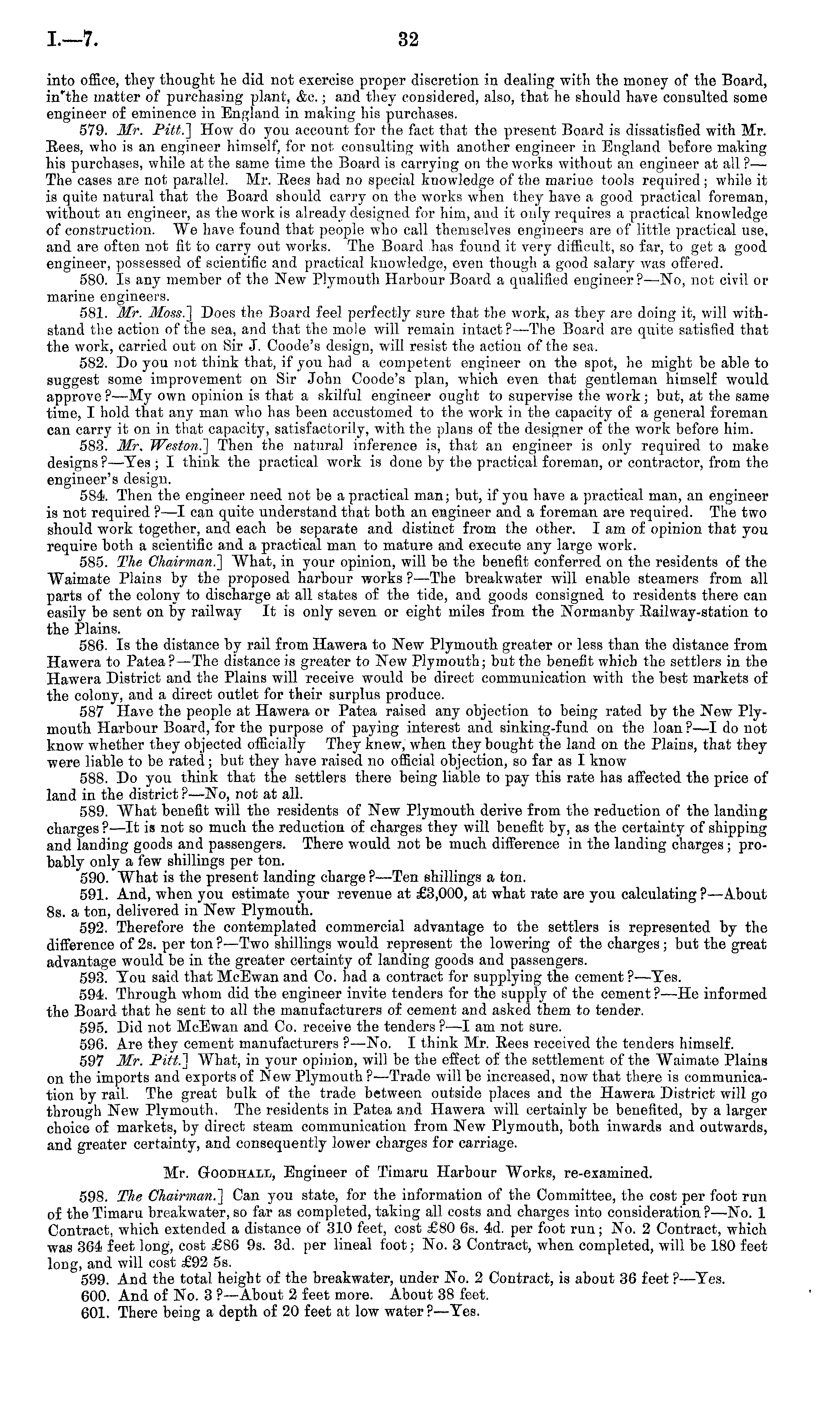 into office, they thought he did not exercise proper discretion in dealing with the money of the Board, infhe matter of purchasing plant, &c.; and they considered, also, that he should have consulted some engineer of eminence in England in making his purchases. 579. Mr. Pitt.] How do you account for the fact that the present Board is dissatisfied with Mr. Eees, who is an engineer himself, for not consulting with another engineer in England before making his purchases, while at the same time the Board is carrying on the works without an engineer at all ?— The cases are not parallel, Mr. Eees had no special knowledge of the marine tools required; while it is quite natural that the Board should carry on the works when they have a good practical foreman, without an engineer, as the work is already designed for him, and it only requires a practical knowledge of construction. We have found that people who call themselves engineers are of little practical use, and are often not fit to carry out works. The Board has found it very difficult, so far, to get a good engineer, possessed of scientific and practical knowledge, even though a good salary was offered. 580. Is any member of the New Plymouth Harbour Board a qualified engineer? —No, not civil or marine engineers. 581. Mr. Moss.] Does the Board feel perfectly sure that the work, as they are doing it, will withstand the action of the sea, and that the mole will remain intact? —The Board are quite satisfied that the work, carried out on Sir J. Coode's design, will resist the action of the sea, 582. Do you not think that, if you had a competent engineer on the spot, he might be able to suggest some improvement on Sir John Coode's plan, which even that gentleman himself would approve ? —My own opinion is that a skilful engineer ought to supervise the work; but, at the same time, I hold that any man who has been accustomed to the work in the capacity of a general foreman can carry it on in that capacity, satisfactorily, with the plans of the designer of the work before him. 583. Mr. Weston.] Then the natural inference is, that an engineer is only required to make designs ?—Tes ; I think the practical work is done by the practical foreman, or contractor, from the engineer's design. 584. Then the engineer need not be a practical man; but, if you have a practical man, an engineer is not required ? —I can quite understand that both an engineer and a foreman are required. The two should work together, and each be separate and distinct from the other. lam of opinion that you require both a scientific and a practical man to mature and execute any large work. 585. The Chairman!] What, in your opinion, will be the benefit conferred on the residents of the Waimate Plains by the proposed harbour works ? —The breakwater will enable steamers from all parts of the colony to discharge at all states of the tide, and goods consigned to residents there can easily be sent on by railway It is only seven or eight miles from the Normanby Eailway-station to the Plains. 586. Is the distance by rail from Hawera to New Plymouth greater or less than the distance from Hawera to Patea ? —The distance is greater to New Plymouth; but the benefit which the settlers in the Hawera District and the Plains will receive would be direct communication with the best markets of the colony, and a direct outlet for their surplus produce. 587 Have the people at Hawera or Patea raised any objection to being rated by the New Plymouth Harbour Board, for the purpose of paying interest and sinking-fund on the loan ?—I do not know whether they objected officially They knew, when they bought the land on the Plains, that they were liable to be rated; but they have raised no official objection, so far as I know 588. Do you think that the settlers there being liable to pay this rate has affected the price of land in the district?—No, not at all. 589. What benefit will the residents of New Plymouth derive from the reduction of the landing charges ?—lt is not so much the reduction of charges they will benefit by, as the certainty of shipping and landing goods and passengers. There would not be much difference in the landing charges ; probably only a few shillings per ton. 590. What is the present landing charge ?—Ten shillings a ton. 591. And, when you estimate your revenue at £3,000, at what rate are you calculating ?—About Bs. a ton, delivered in New Plymouth. 592. Therefore the contemplated commercial advantage to the settlers is represented by the difference of 2s. per ton ? —Two shillings would represent the lowering of the charges ; but the great advantage would be in the greater certainty of landing goods and passengers. 593. Tou said that McEwan and Co. had a contract for supplying the cement ?—Tes. 594. Through whom did the engineer invite tenders for the supply of the cement ?—He informed the Board that he sent to all the manufacturers of cement and asked them to tender. 595. Did not McEwan and Co. receive the tenders ?■—l am not sure. 596. Are they cement manufacturers ?—No. I think Mr. Eees received the tenders himself. 597 Mr. Pitt.] What, in your opinion, will be the effect of the settlement of the Waimate Plains on the imports and exports of New Plymouth? —Trade will be increased, now that there is communication by rail. The great bulk of the trade between outside places and the Hawera District will go through New Plymouth, The residents in Patea and Hawera will certainly be benefited, by a larger choice of markets, by direct steam communication from New Plymouth, both inwards and outwards, and greater certainty, and consequently lower charges for carriage. Mr. Goodhall, Engineer of Timaru Harbour Works, re-examined. 598. The Chairman.] Can you state, for the information of the Committee, the cost per foot run of the Timaru breakwater, so far as completed, taking all costs and charges into consideration ?—No. 1 Contract, which extended a distanc