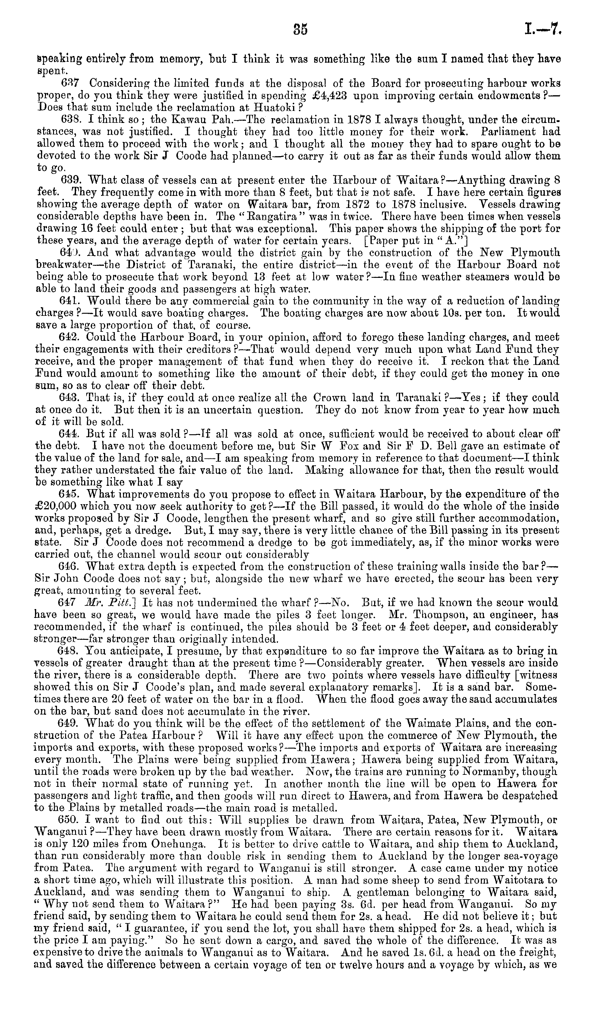 speaking entirely from memory, but I think it was something like the sum I named that they have spent. 637 Considering the limited funds at the disposal of the Board for prosecuting harbour works proper, do you think they were justified in spending £4,423 upon improving certain endowments ? — Does that sum include the reclamation at Huatoki ? 638. I think so ; the Kawau Pah. —The reclamation in 1878 I always thought, under the circumstances, was not justified. I thought they had too little money for their work. Parliament had allowed them to proceed with the work; and I thought all the money they had to spare ought to be devoted to the work Sir J Coode had planned—to carry it out as far as their funds would allow them to go. 639. What class of vessels can at present enter the Harbour of Waitara? —Anything drawing 8 feet. They frequently come in with more than 8 feet, but that is not safe. I have here certain figures showing the average depth of water on Waitara bar, from 1872 to 1878 inclusive. Vessels drawing considerable depths have been in. The " Eangatira " was in twice. There have been times when vessels drawing 16 feet could enter ; but that was exceptional. This paper shows the shipping of the port for these years, and the average depth of water for certain years. [Paper put in " A."] 64 ). And what advantage would the district gain by the construction of the New Plymouth breakwater—the District of Taranaki, the entire district —in the event of the Harbour Board not being able to prosecute that work beyond 13 feet at low water? —In fine weather steamers would be able to land their goods and passengers at high water. 641. Would there be any commercial gain to the community in the way of a reduction of landing charges ?—lt would save boating charges. The boating charges are now about 10s. per ton. It would save a large proportion of that, of course. 642. Could the Harbour Board, in your opinion, afford to forego these landing charges, and meet their engagements with their creditors ?—That would depend very much upon what Land Fund they receive, aud the proper management of that fund when they do receive it. I reckon that the Land Fund would amount to something like the amount of their debt, if they could get the money in one sum, so as to clear off their debt. 643. That is, if they could at once realize all the Crown land in Taranaki ?—Tes ; if they could at once do it. But then it is an uncertain question. They do not know from year to year how much of it will be sold. 644. But if all was sold ? —lf all was sold at once, sufficient would be received to about clear off the debt. I have not the document before me, but Sir W Fox and Sir F D. Bell gave an estimate of the value of the land for sale, and —I am speaking from memory in reference to that document —I think they rather understated the fair value of the land. Making allowance for that, then the result would be something like what I say 645. What improvements do you propose to effect in Waitara Harbour, by the expenditure of the £20,000 which you now seek authority to get ? —lf the Bill passed, it would do the whole of the inside works proposed by Sir J Coode, lengthen the present wharf, and so give still further accommodation, and, perhaps, get a dredge. But, I may say, there is very little chance of the Bill passing in its present state. Sir J Coode does not recommend a dredge to be got immediately, as, if the minor works were carried out, the channel would scour out considerably 646. What extra depth is expected from the construction of these training walls inside the bar?— Sir John Coode does not say; but, alongside the new wharf we have erected, the scour has been very great, amounting to several feet. 647 Mr. Pitt.] It has not undermined the wharf ? —No. But, if we had known the scour would have been so great, we would have made the piles 3 feet longer. Mr. Thompson, an engineer, has recommended, if the wharf is continued, the piles should be 3 feet or 4 feet deeper, and considerably stronger—far stronger thau originally intended. 648. Tou anticipate, I presume, by that expenditure to so far improve the Waitara as to bring in vessels of greater draught than at the present time ? —Considerably greater. When vessels are inside the river, there is a considerable depth. There are two points where vessels have difficulty [witness showed this on Sir J Coode's plan, and made several explanatory remarks]. It is a sand bar. Sometimes there are 20 feet of water on the bar in a flood. When the flood goes away the sand accumulates on the bar, but sand does not accumulate in the river. 649. What do you think will be the effect of the settlement of the Waimate Plains, and the construction of the Patea Harbour ? Will it have any effect upon the commerce of New Plymouth, the imports and exports, with these proposed works ?—The imports and exports of Waitara are increasing every month. The Plains were being supplied from Hawera; Hawera being supplied from Waitara, until the roads were broken up by the bad weather. Now, the trains are running to Normanby, though not in their normal state of running yet. In another month the line will be open to Hawera for passengers and light traffic, and then goods will run direct to Hawera, and from Hawera he despatched to the Plains by metalled roads—the main road is metalled. 650. I want to find out this: Will supplies be drawn from Waitara, Patea, New Plymouth, or Wanganui ? —They have been drawn mostly from Waitara. There are certain reasons for it. Waitara is only 120 miles from Onehunga. It is better to drive cattle to Waitara, and ship them to Auckland, than run considerably more than double risk in sending them to Auckland by the longer sea-voyage from Patea. The argument with regard to Wanganui is still stronger. A case came under my notice a short time ago, which will illustrate this position. A man had some sheep to send from Waitotara to Auckland, a