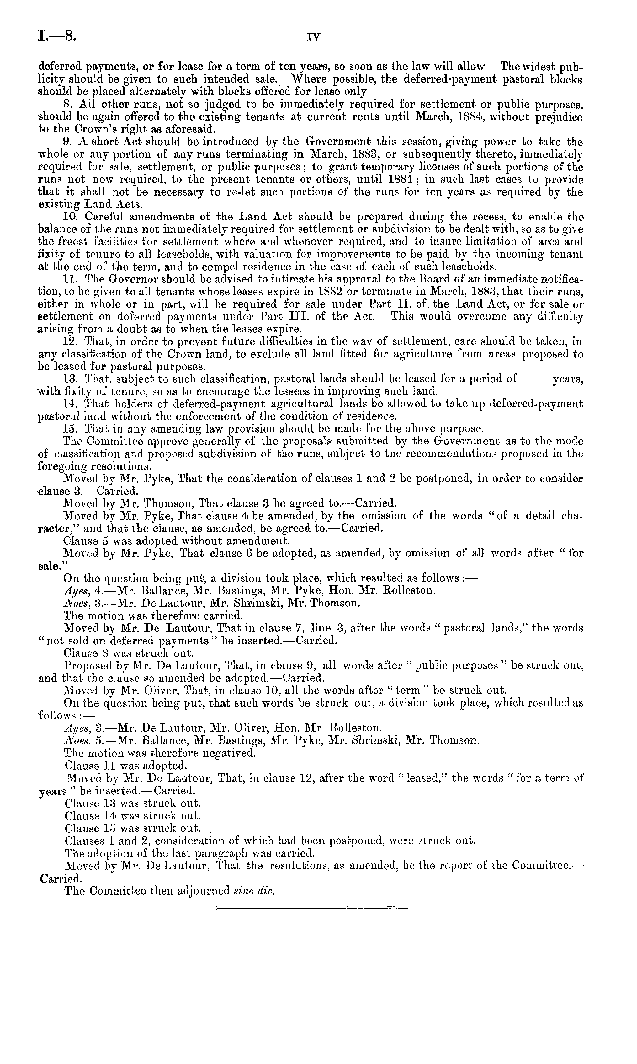 deferred payments, or for lease for a term of ten years, so soon as the law will allow The widest publicity should be given to such intended sale. Where possible, the deferred-payment pastoral blocks should be placed alternately with blocks offered for lease only 8. All other runs, not so judged to be immediately required for settlement or public purposes, should be again offered to the existing tenants at current rents until March, 1884, without prejudice to the Crown's right as aforesaid. 9. A short Act should be introduced by the Government this session, giving power to take the whole or any portion of any runs terminating in March, 1883, or subsequently thereto, immediately required for sale, settlement, or public purposes; to grant temporary licenses of such portions of the runs not now required, to the present tenants or others, until 1884 ; in such last cases to provide that it shall not be necessary to re-let such portions of the runs for ten years as required by the existing Land Acts. 10. Careful amendments of the Land Act should be prepared during the recess, to enable the balance of the runs not immediately required for settlement or subdivision to be dealt with, so as to give the freest facilities for settlement where and whenever required, and to insure limitation of area and fixity of tenure to all leaseholds, with valuation for improvements to be paid by the incoming tenant at the end of the term, and to compel residence in the case of each of such leaseholds. 11. The Governor should be advised to intimate his approval to the Board of an immediate notification, to be given to all tenants whose leases expire in 1882 or terminate in March, 1883, that their runs, either in whole or in part, will be required for sale under Part 11. of, the Land Act, or for sale or settlement on deferred payments under Part 111. of the Act. This would overcome any difficulty arising from a doubt as to when the leases expire. 12. That, in order to prevent future difficulties in the way of settlement, care should be taken, iv any classification of the Crown land, to exclude all land fitted for agriculture from areas proposed to be leased for pastoral purposes. 13. That, subject to such classification, pastoral lands should be leased for a period of years, "with fixity of tenure, so as to encourage the lessees in improving such land. 14. That holders of deferred-payment agricultural lands be allowed to take up deferred-payment pastoral land without the enforcement of the condition of residence. 15. That in any amending law provision should be made for the above purpose. The Committee approve generally of the proposals submitted by the Government as to the mode of classification and proposed subdivision of the runs, subject to the recommendations proposed in the foregoing resolutions. Moved by Mr. Pyke, That the consideration of clauses 1 and 2 be postponed, in order to consider clause 3. —Carried. Moved by Mr. Thomson, That clause 3 be agreed to. —Carried. Moved by Mr. Pyke, That clause 4 be amended, by the omission of the words "of a detail character." and that the clause, as amended, be agreed to. —Carried. Clause 5 was adopted without amendment. Moved by Mr. Pyke, That clause 6 be adopted, as amended, by omission of all words after " for sale." On the question being put, a division took place, which resulted as follows: — Ayes, 4. —Mr. Ballance, Mr. Bastings, Mr. Pyke, Hon. Mr. Eolleston. JS/oes, 3. —Mr. De Lautour, Mr. Shrimski, Mr. Thomson. The motion was therefore carried. Moved by Mr. De Lautour, That in clause 7, line 3, after the words " pastoral lands," the words "not sold on deferred payments" be inserted. —Carried. Clause 8 was struck out. Proposed by Mr. De Lautour, That, in clause 0, all words after " public purposes " be struck out, and that the clause so amended be adopted. —Carried. Moved by Mr. Oliver, That, in clause 10, all the words after " term " be struck out. On the question being put, that such words be struck out, a division took place, which resulted as follows :— Ayes, 3. —Mr. De Lautour, Mr. Oliver, Hon. Mr Eolleston. Noes, 5. —Mr. Ballance, Mr. Bastings, Mr. Pyke, Mr. Shrimski, Mr. Thomson. The motion was therefore negatived. Clause 11 was adopted. Moved by Mr. De Lautour, That, in clause 12, after the word "leased," the words " for a term of years " bo inserted.—Carried. Clause 13 was struck out. Clause 14 was struck out. Clause 15 was struck out. , Clauses 1 and 2, consideration of which had been postponed, were struck out. The adoption of the last paragraph was carried. Moved by Mr. De Lautour, That the resolutions, as amended, be the report of the Committee. — Carried. The Committee then adjourned sine die.
