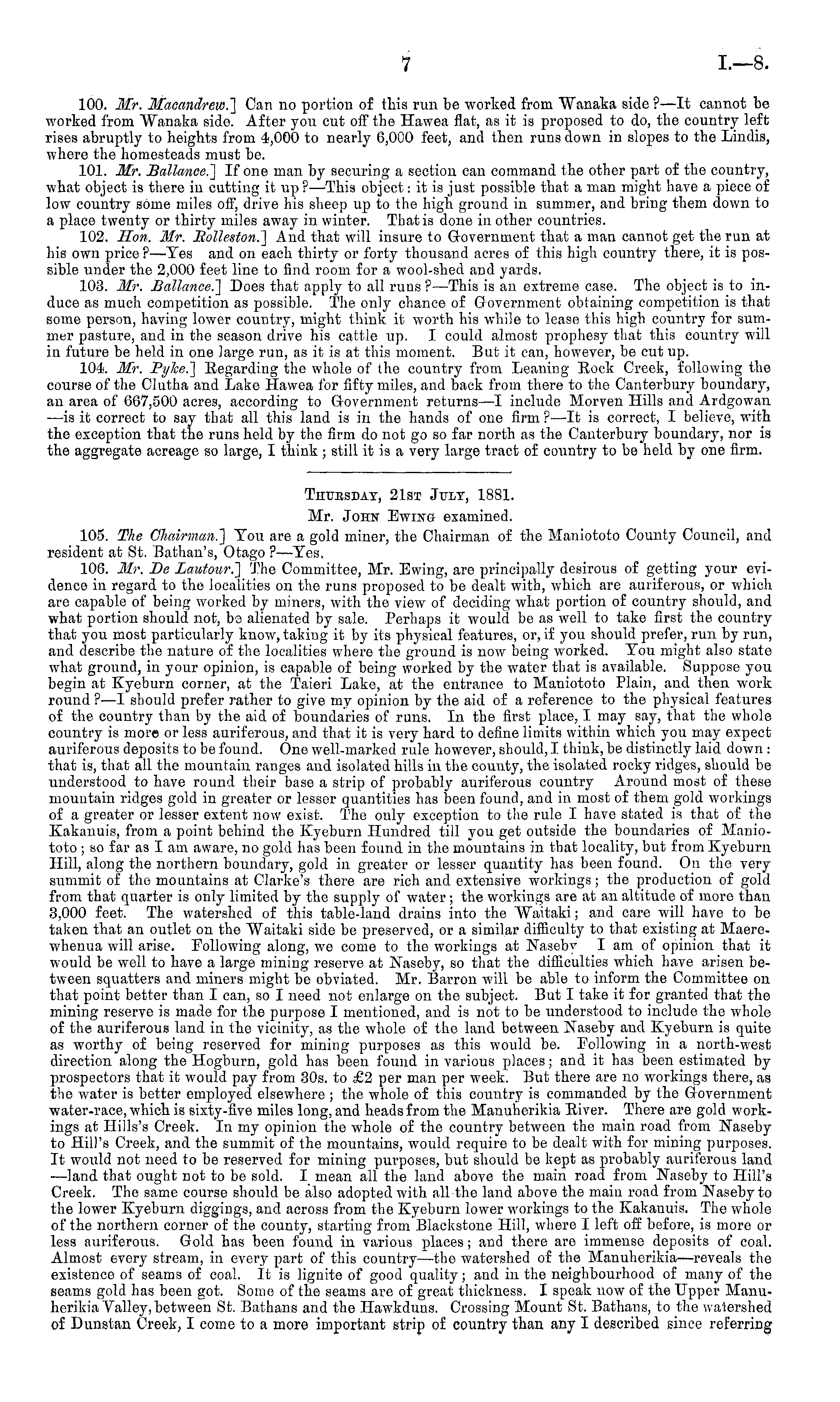 TnUBSBAT, 21ST JtTLT, 1881. Mr. John Ewing examined. 105. The Chairman.'] You are a gold miner, the Chairman of the Maniototo County Council, and resident at St. Bathan's, Otago ?—Tes, 106. Mr. Be Lawtour.~] The Committee, Mr. Ewing, are principally desirous of getting your evidence in regard to the localities on the runs proposed to be dealt with, which are auriferous, or which are capable of being worked by miners, with the view of deciding what portion of country should, and what portion should not, bs alienated by sale. Perhaps it would be as well to take first the country that you most particularly know, taking it by its physical features, or, if you should prefer, run by run, and describe the nature of the localities where the ground is now being worked. You might also state what ground, in your opinion, is capable of being worked by the water that is available. Suppose you begin at Kyeburn corner, at the Taieri Lake, at the entrance to Maniototo Plain, and then work round ?—I should prefer rather to give my opinion by the aid of a reference to the physical features of the country than by the aid of boundaries of runs. In the first place, I may say, that the whole country is more or less auriferous, and that it is very hard to define limits within which you may expect auriferous deposits to be found. One well-marked rule however, should, I think, be distinctly laid down : that is, that all the mountain ranges and isolated hills in the county, the isolated rocky ridges, should be understood to have round their base a strip of probably auriferous country Around most of these mountain ridges gold in greater or lesser quantities has been found, and in most of them gold workings of a greater or lesser extent now exist. The only exception to the rule I have stated is that of the Kakanuis, from a point behind the Kyeburn Hundred till you get outside the boundaries of Maniototo ; so far as I am aware, no gold has been found in the mountains in that locality, but from Kyeburn Hill, along the northern boundary, gold in greater or lesser quantity has been found. On the very summit of the mountains at Clarke's there are rich and extensive workings; the production of gold from that quarter is only limited by the supply of water; the workings are at an altitude of more than 3,000 feet. The watershed of this table-land drains into the "Waitaki; and care will have to be taken that an outlet on the "Waitaki side be preserved, or a similar difficulty to that existing at Maerewhenua will arise. Following along, we come to the workings at Nasebv lam of opinion that it would be well to have a large mining reserve at Naseby, so that the difficulties which have arisen between squatters and miners might be obviated. Mr. Barron will be able to inform the Committee on that point better than I can, so I need not enlarge on the subject. But I take it for granted that the mining reserve is made for the purpose I mentioned, and is not to be understood to include the whole of the auriferous land in the vicinity, as the whole of the land between Naseby and Kyeburn is quite as worthy of being reserved for mining purposes as this would be. Following in a north-west direction along the Hogburn, gold has been found in various places; and it has been estimated by prospectors that it would pay from 80s. to £2 per man per week. But there are no workings there, as the water is better employed elsewhere ; the whole of this country is commanded by the Government water-race, which is sixty-five miles long, and heads from the Manuherikia Eiver. There are gold workings at Hills's Creek. In my opinion the whole of the country between the main road from Naseby to Hill's Creek, and the summit of the mountains, would require to be dealt with for mining purposes. It woiild not need to be reserved for mining purposes, but should be kept as probably auriferous land ■ —land that ought not to be sold. I mean all the land above the main road from Naseby to Hill's Creek. The same course should be also adopted with all the land above the main road from Naseby to the lower Kyeburn diggings, and across from the Kyeburn lower workings to the Kakanuis. The whole of the northern corner of the county, starting from Blackstone Hill, where I left off before, is more or less auriferous. Gold has been found in various places; and there are immense deposits of coal. Almost every stream, in every part of this country—the watershed of the Manuhei'ikia—reveals the existence of seams of coal. It is lignite of good quality; and in the neighbourhood of many of the seams gold has been got. Some of the seams are of great thickness. I speak now of the Upper Manuherikia Valley, between St. Batbans and the Hawkduns. Crossing Mount St. Bathans, to the watershed of Dunstan Creek, I come to a more important strip of country than any I described since referring