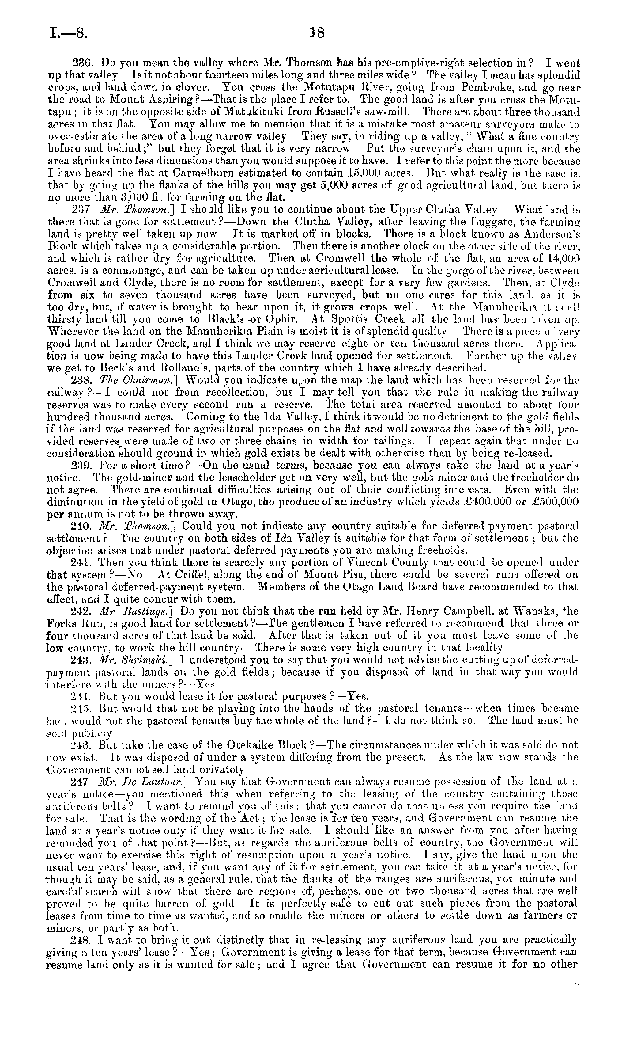 23(5. Da you mean the valley where Mr. Thomson has his pre-emptive-right selection in ? I went up that valley Is it not about fourteen miles long and three miles wide ? The valley I mean has splendid crops, and land down in clover. You cross the Motutapu River, going from Pembroke, and go near the road to Mount Aspiring?— That is the place I refer to. The good land is after you cross the Motutapu ;itis on the opposite side of Matukituki from Russell's saw-mill. There are about three thousand acres in that flat. You may allow me to mention that it is a mistake most amateur surveyors make to over-estimate the area of a long narrow valley They say. in riding up a valley, " What a fine country before and behind ;" but they forget that it is very narrow Put the surveyor's chain upon it, and the area shrinks into less dimensions than you would suppose it to have. I refer to this point the more because I have heard the flat at Carmelburn estimated to contain 15,000 acres. But what really is the case is, that by going up the flanks of the hills you may get 5,000 acres of good agricultural land, but there is no more than 3,000 fit for farming on the flat. 237 Mr. Thomson.'] I should like you to continue about the Upper Clutha Valley What land is there that is good for settlement ?—Down the Clutha Valley, after leaving the Luggate, the farming land is pretty well taken up now It is marked off in blocks. There is a block known as Anderson's Block which takes up a considerable portion. Then there is another block on the other side of the river, and which is rather dry for agriculture. Then at Cromwell the whole of the flat, an area of 14,000 acres, is a commonage, and can be taken up under agricultural lease. In the gorge of the river, between Cromwell and Clyde, there is no room for settlement, except for a very few gardens. Then, at Clyde from six to seven thousand acres have been surveyed, but no one cares for this land, as it is too dry, but, if water is brought to bear upon it, it grows crops well. At the Mauuherikia it is all thirsty land till you come to Black's or Ophir. At Spottis Creek all the land has been taken up. Wherever the land on the Manuherikia Plain is moist it is of splendid quality There is a piece of very good land at Lauder Creek, and 1 think we may reserve eight or ten thousand acres there. Application is now being made to have this Lauder Creek land opened for settlement. Further up the valley we get to Beck's and Holland's, parts of the country which I have already described. 238. The Chairman.] Would you indicate upon the map the land which has been reserved for the railway ? —I could not from recollection, but I may tell you that the rule in making the railway reserves was to make every second run a reserve. The total area reserved amouted to about four hundred thousand acres. Coming to the Ida Valley, I think it would be no detriment to the gold fields if the land was reserved for agricultural purposes on the flat and well towards the base of the hill, provided reserves_ were made of two or three chains in width for tailings. I repeat again that under no consideration should ground in which gold exists be dealt with otherwise than by being re-leased. 239. For a short time? —On the usual terms, because you can always take the land at a year's notice. The gold-miner and the leaseholder get on very well, but the gold miner and the freeholder do not agree. There are continual difficulties arising out of their conflicting interests. Even with the diminution in the yield of gold in Otago, the produce of an industry which yields £100,000 or £500,000 per annum is not to be thrown away. 210. My. Thomson.] Could you not indicate any country suitable for deferred-payment pastoral settlement ?—The country on both sides of Ida Valley is suitable for that form of settlement ; but the objeciion arises that under pastoral deferred payments you are making freeholds. 241. Then you think there is scarcely any portion of Vincent County that could be opened under that system? —No At Crifl'el, along the end of Mount Pisa, there could be several runs offered on the pastoral deferred-payment system. Members of the Otago Land Board have recommended to that effect, and I quite concur with them. 242. Mr Bastings.] Do you not think that the run held by Mr. Henry Campbell, at Wanaka, the Forks Run, is good land for settlement?— The gentlemen I have referred to recommend that three or four thousand acres of that land be sold. After that is taken out of it you must leave some of the low country, to work the hill country- There is some very high country in that locality 243. Mr. Shrimski.] I understood you to say that you would not advise the cutting up of deferredpayment pastoral lands on the gold fields; because if you disposed of land in that way you would interfere with the miners?— Yes. 211. But you would lease it for pastoral purposes ? —Yes. 245. But would that not be playing into the hands of the pastoral tenants —when times became bud, would not the pastoral tenants buy the whole of the land? —I do not think so. The land must be sold publicly 24(5. But take the case of the Otekaike Block ? —The circumstances under which it was sold do not now exist. It was disposed of under a system differing from the present. As the law now stands the Government cannot sell land privately 247 Mr. De Lautour.] You say that Grovcrnrnent can always resume possession of the land at ;i year's notice—you mentioned this when referring to the leasing of the country containing those auriferoils belts? 1 want to remind you of this: that you cannot do that unless you require the land for sale. That is the wording of the Act; the lease is for ten years, and Government can resume the land at a year's notice only if they want it for sale. 1 should like an answer from you after having reminded you of that point? —But, as regards the auriferous belts of country, the Government will never want t