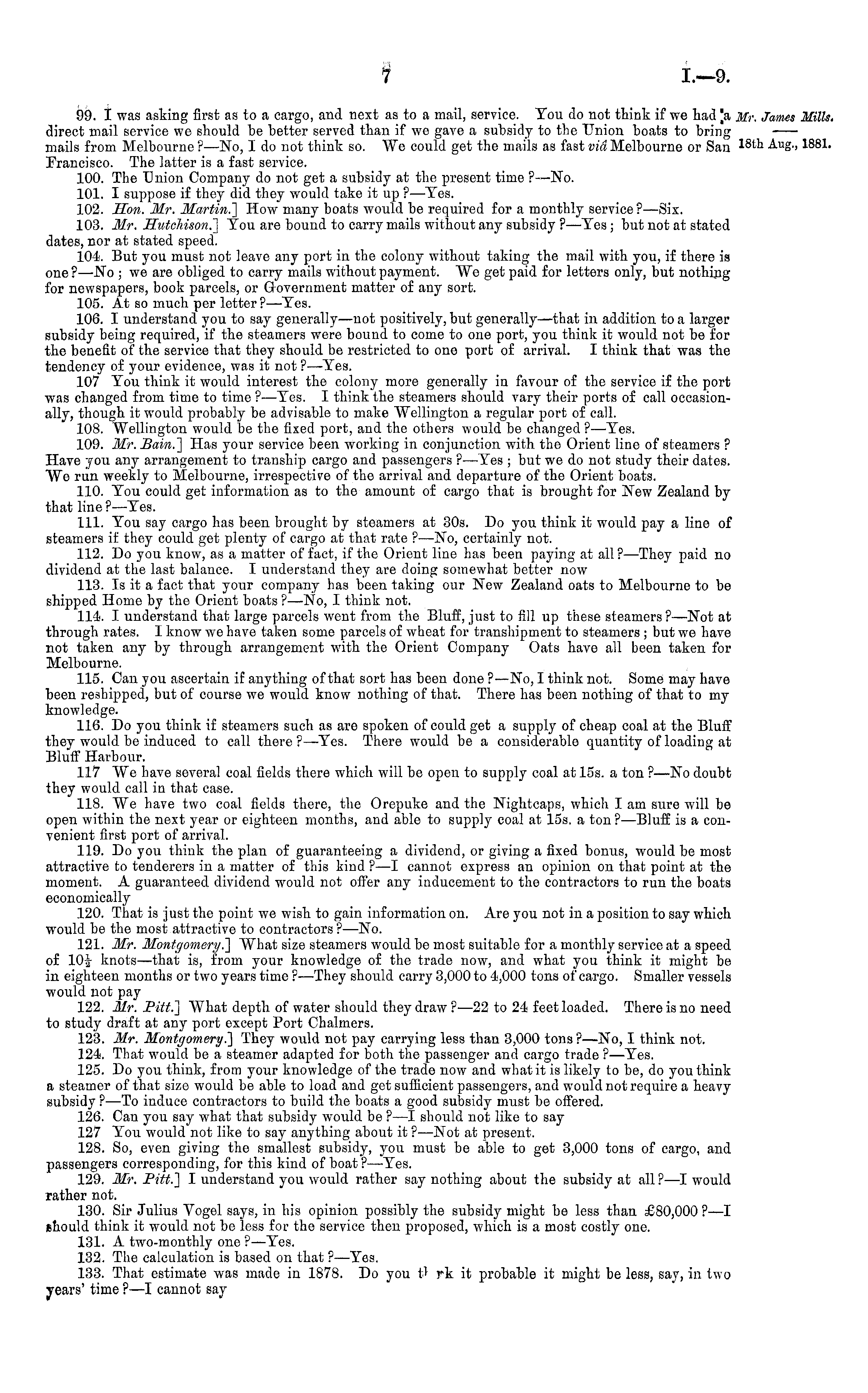 99. I was asking first as to a cargo, and next as to a mail, service. You do not think if we had |a . direct mail service we should be better served than if we gave a subsidy to the Union boats to bring mails from Melbourne?—No, Ido not think so. We could get the mails as fast via Melbourne or San Erancisco. The latter is a fast service. 100. The Union Company do not get a subsidy at the present time ?—No. 101. I suppose if they did they would take it up ? —Yes. 102. Hon. Mr. Martin.] How many boats would be required for a monthly service? —Six. 103. Mr. Hutchison.] You are bound to carry mails without any subsidy ?—Yes; but not at stated dates, nor at stated speed. 104. But you must not leave any port in the colony without taking the mail with you, if there is one ?—No ; we are obliged to carry mails without payment. We get paid for letters only, but nothing for newspapers, book parcels, or Government matter of any sort. 105. At so much per letter? —Yes. 106. I understand you to say generally—not positively, but generally—that in addition to a larger subsidy being required, if the steamers were bound to come to one port, you think it would not be for the benefit of the service that they should be restricted to one port of arrival. I think that was the tendency of your evidence, was it not ?—Yes. 107 You think it would interest the colony more generally in favour of the service if the port was changed from time to time ?—Yes. I think the steamers should vary their ports of call occasionally, though it would probably be advisable to make Wellington a regular port of call. 108. Wellington would be the fixed port, and the others would be changed ?—Yes. 109. Mr. Bain.] Has your service been working in conjunction with the Orient line of steamers ? Have you any arrangement to tranship cargo and passengers ?—Yes ; but we do not study their dates. We run weekly to Melbourne, irrespective of the arrival and departure of the Orient boats. 110. You could get information as to the amount of cargo that is brought for New Zealand by that line ? —Yes. 111. You say cargo has been brought by steamers at 30s. Do you think it would pay a line of steamers if they could get plenty of cargo at that rate ? —No, certainly not. 112. Do you know, as a matter of fact, if the Orient line has been paying at all ? —They paid no dividend at the last balance. I understand they are doing somewhat better now 113. Is it a fact that your company has been taking our New Zealand oats to Melbourne to be shipped Home by the Orient boats ?—No, I think not. 114. I understand that large parcels went from the Bluff, just to fill up these steamers?— Not at through rates. I know we have taken some parcels of wheat for transhipment to steamers ; but we have not taken any by through arrangement with the Orient Company Oats have all been taken for Melbourne. 115. Can you ascertain if anything of that sort has been done ? —No, I think not. Some may have been reshipped, but of course we would know nothing of that. There has been nothing of that to my knowledge. 116. Do you think if steamers such as are spoken of could get a supply of cheap coal at the Bluff they would be induced to call there ? —Yes. There would be a considerable quantity of loading at Bluff Harbour. 117 We have several coal fields there which will be open to supply coal at 15s. a ton ?—No doubt they would call in that case. 118. We have two coal fields there, the Orepuke and the Nightcaps, which I am sure will be open within the next year or eighteen months, and able to supply coal at 15s. a ton ? —Bluff is a convenient first port of arrival. 119. Do you think the plan of guaranteeing a dividend, or giving a fixed bonus, would be most attractive to tenderers in a matter of this kind ?—I cannot express an opinion on that point at the moment. A guaranteed dividend would not offer any inducement to the contractors to run the boats economically 120. That is just the point we wish to gain information on. Are you not in a position to say which would be the most attractive to contractors ? —No. 121. Mr. Montgomery.] What size steamers would be most suitable for a monthly service at a speed of 10|- knots —that is, from your knowledge of the trade now, and what you think it might be in eighteen months or two years time ? —They should carry 3,000 to 4,000 tons of cargo. Smaller vessels would not pay 122. Mr. Pitt.] What depth of water should they draw ? —22 to 24 feet loaded. There is no need to study draft at any port except Port Chalmers. 123. Mr. Montgomery.] They would not pay carrying less than 3,000 tons ?—No, I think not. 124. That would be a steamer adapted for both the passenger and cargo trade ?—Yes. 125. Do you think, from your knowledge of the trade now and what it is likely to be, do you think a steamer of that size would be able to load and get sufficient passengers, and would not require a heavy subsidy ? —To induce contractors to build the boats a good subsidy must be offered. 126. Can you say what that subsidy would be ?—I should not like to say 127 You would not like to say anything about it ?■ —Not at present. 128. So, even giving the smallest subsidy, you must be able to get 3,000 tons of cargo, and passengers corresponding, for this kind of boat ? —Yes. 129. Mr. Pitt.] I understand you would rather say nothing about the subsidy at all ? —I would rather not. 130. Sir Julius Vogel says, in his opinion possibly the subsidy might be less than £80,000 ?—I should think it would not be less for the service then proposed, which is a most costly one. 131. A two-monthly one ?—Yes. 132. The calculation is based on that ?—Yes. 133. That estimate was made in 1878. Do you t' rk it probable it might be less, say, in two years' time ? —I cannot say
