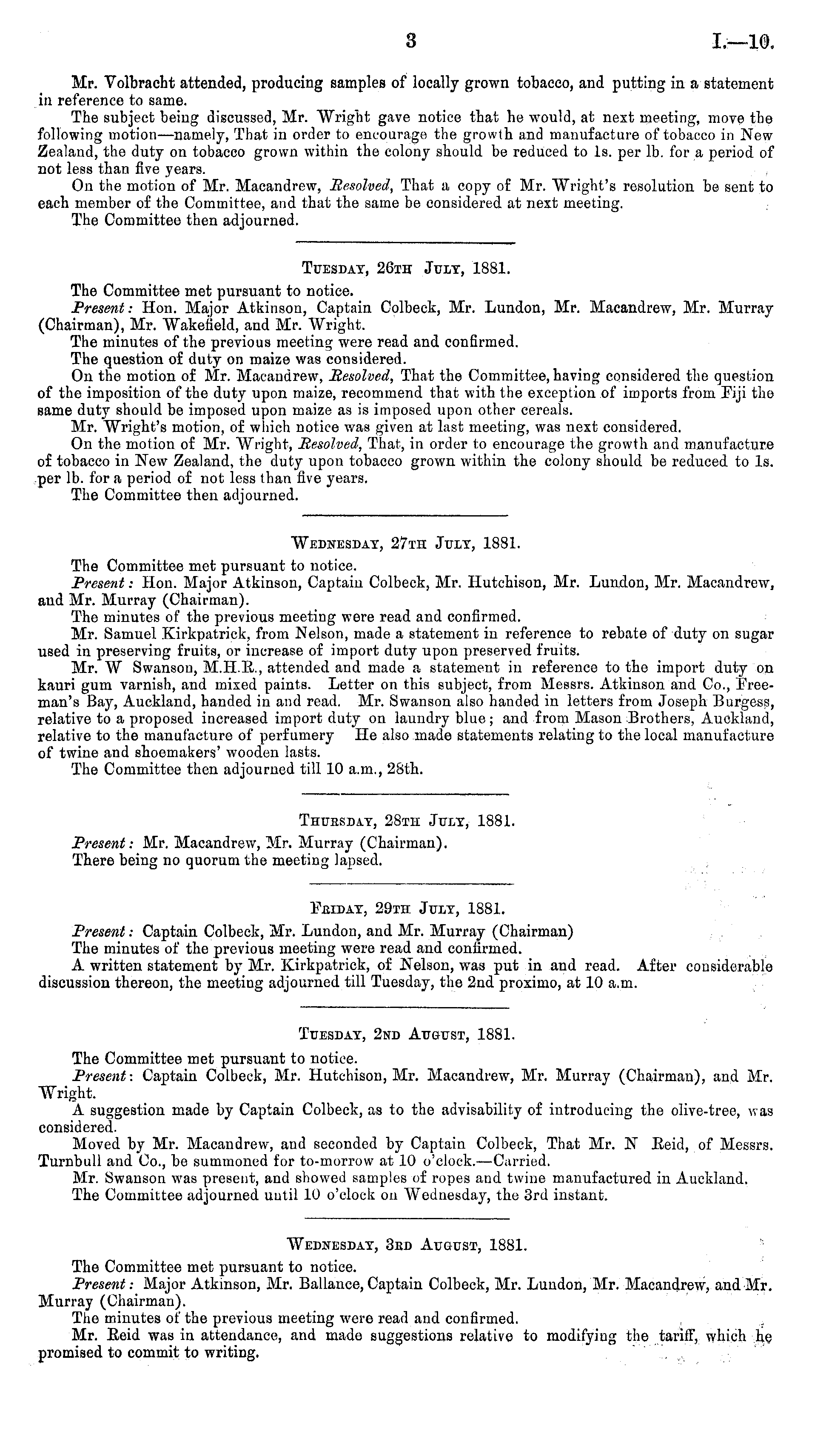 Wednesday, 3rd August, 1881. The Committee met pursuant to notice. Present: Major Atkinson, Mr. Ballance, Captain Colbeck, Mr. Lundon, Mr. Macandrew, and Mr. Murray (Chairman). The minutes of the previous meeting were read and confirmed. . Mr. Reid was in attendance, and made suggestions relative to modifying the tariff, which he promised to commit to writing.