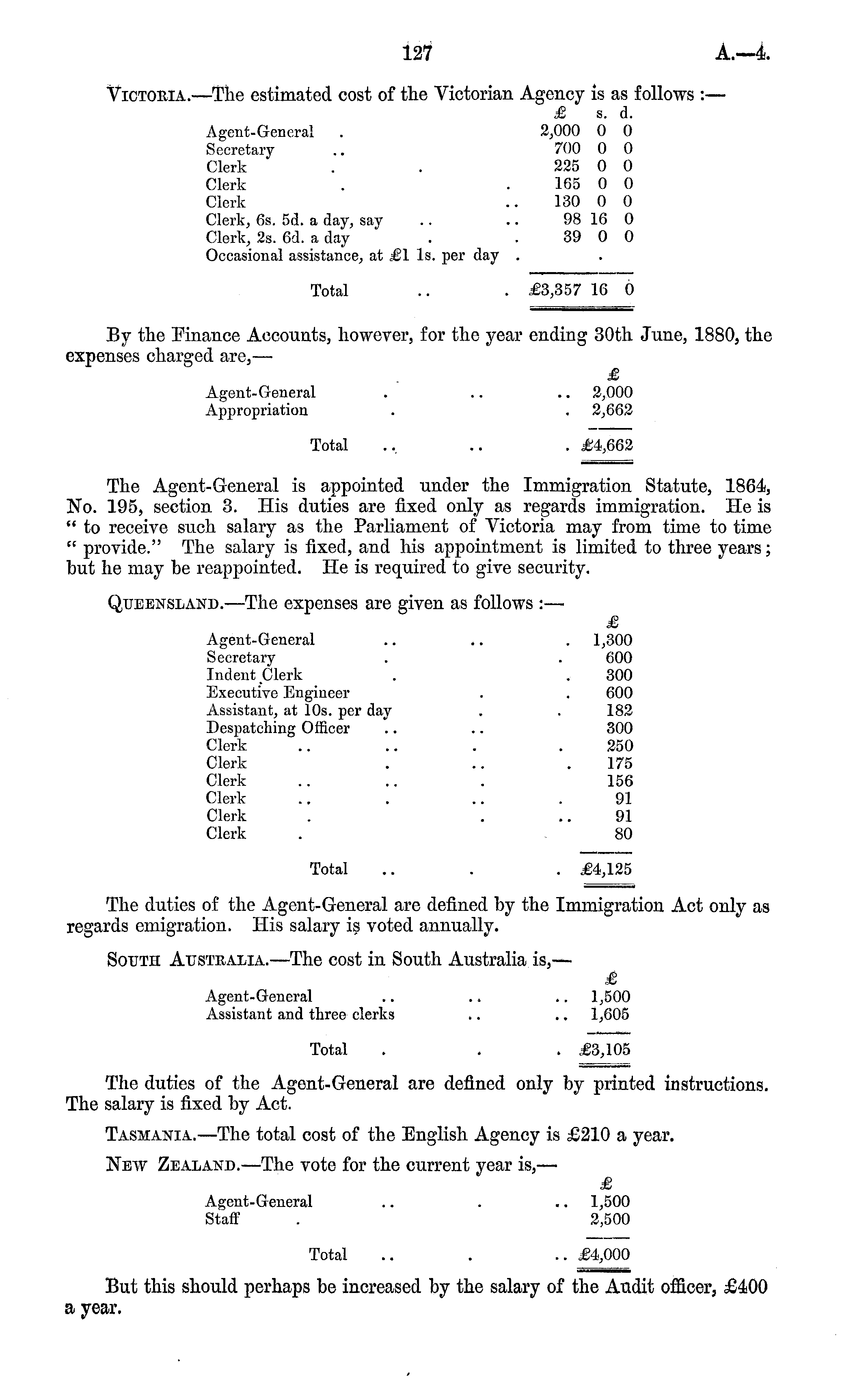 Victoria.—The estimated cost of the Victorian Agency is as follows :— £ s. d. Agent-General . 2,000 0 0 Secretary .. 700 0 0 Clerk . . 225 0 0 Clerk . 165 0 0 Clerk .. 130 0 0 Clerk, 6s. sd. a day, say .. .. 98 16 0 Clerk, 2s. 6d. a day . . 39 0 0 Occasional assistance, at £1 Is. per day . Total .. . £3,357 16 0 By the Finance Accounts, however, for the year ending 30th June, 1880, the expenses charged are, — £ Agent-General . .. .. 2,000 Appropriation . . 2,662 Total ~ .. . £4,662 The Agent-General is appointed under the Immigration Statute, 1864, No. 195, section 3. His duties are fixed only as regards immigration. He is " to receive such salary as the Parliament of Victoria may from time to time " provide." The salary is fixed, and his appointment is limited to three years; but he may be reappointed. He is required to give security. Queensland. —The expenses are given as follows :— £ Agent-General .. .. . 1,300 Secretary . . 600 Indent Clerk . . 300 Executive Engineer . . 600 Assistant, at 10s. per day . . 182 Despatching Officer .. .. 300 Clerk .. .. . .250 Clerk . .. .175 Clerk .. .. . 156 Clerk .. . .. .91 Clerk . ... 91 Clerk . 80 Total .. . . £4,125 The duties of the Agent-General are defined by the Immigration Act only as regards emigration. His salary is voted annually. South Australia. —The cost in South Australia is,— £ Agent-General .. .. .. 1,500 Assistant and three clerks .. .. 1,605 Total . . . £3,105 The duties of the Agent-General are defined only by printed instructions. The salary is fixed by Act. Tasmania.—The total cost of the English Agency is £210 a year. New Zealand.—The vote for the current year is,— £ Agent-General .. . .. 1,500 Staff . 2,500 Total .. . .. £4,000 But this should perhaps be increased by the salary of the Audit officer, £400 a year.