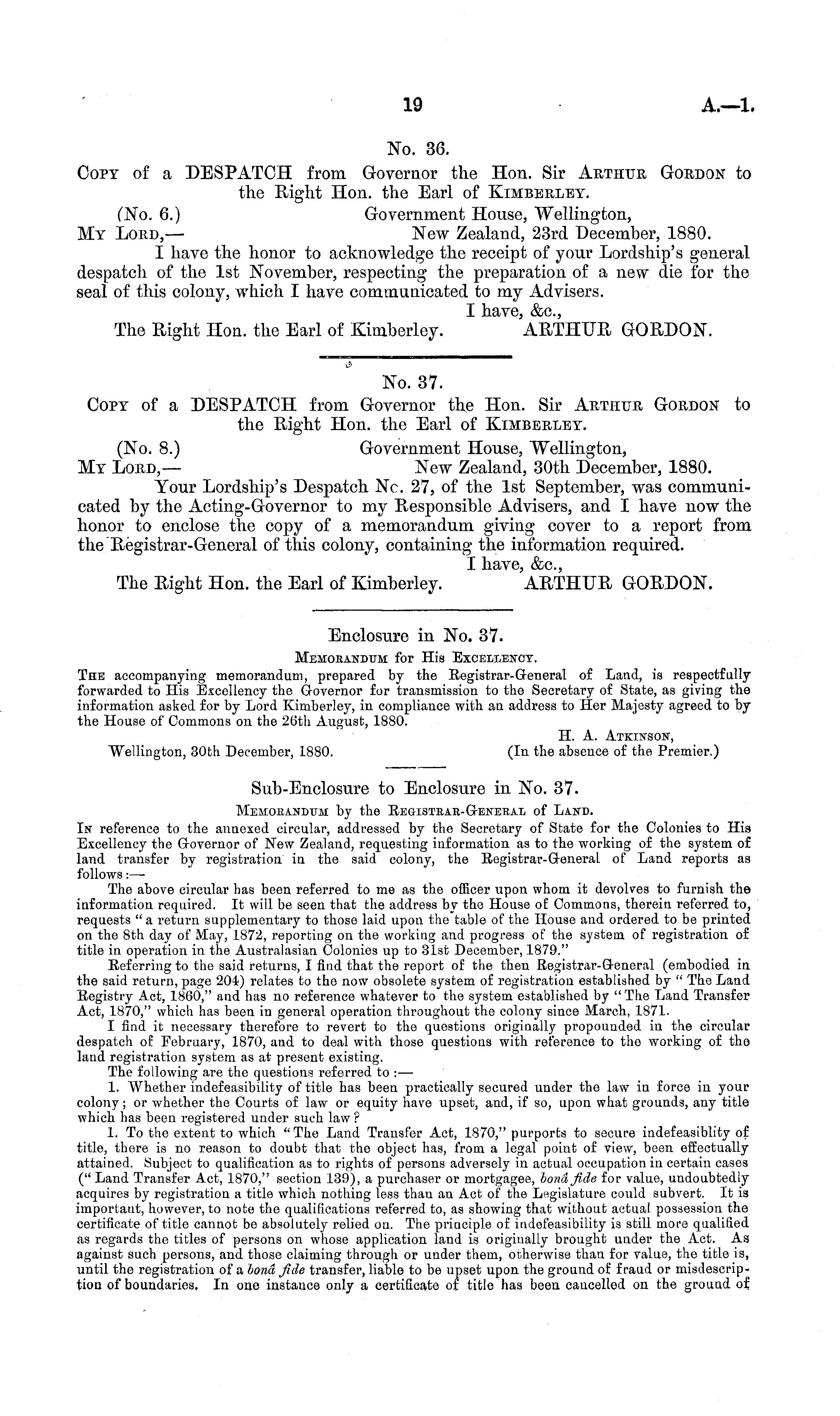 Enclosure in No. 37. Memorandum for His Excellency. The accompanying memorandum, prepared by the Registrar-General of Land, is respectfully forwarded to His Excellency the Governor for transmission to the Secretary of State, as giving the information asked for by Lord Kimberley, in compliance with an address to Her Majesty agreed to by the House of Commons on the 26th August, 1880. H. A. Atkinson, "Wellington, 30th December, 1880. (In the absence of the Premier.)