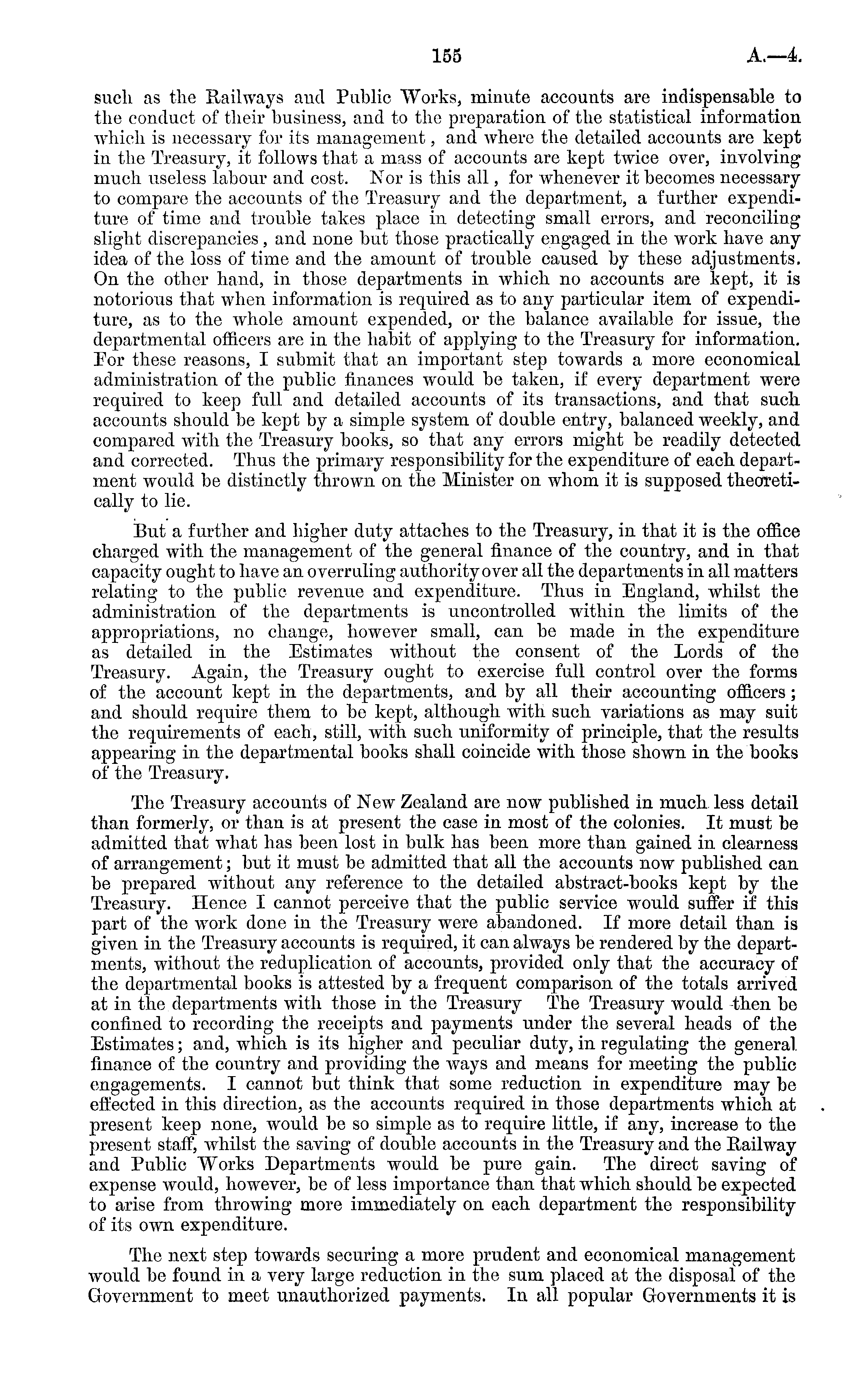such as the Railways and Public Works, minute accounts are indispensable to the conduct of their business, and to the preparation of the statistical information which is necessary for its management, and where the detailed accounts are kept in the Treasury, it follows that a mass of accounts are kept twice over, involving much useless labour and cost. Nor is this all, for whenever it becomes necessary to compare the accounts of the Treasury and the department, a further expenditure of time and trouble takes place in detecting small errors, and reconciling slight discrepancies, and none but those practically engaged in the work have any idea of the loss of time and the amount of trouble caused by these adjustments. On the other hand, in those departments in which no accounts are kept, it is notorious that when information is required as to any particular item of expenditure, as to the whole amount expended, or the balance available for issue, the departmental officers are in the habit of applying to the Treasury for information. For these reasons, I submit that an important step towards a more economical administration of the public finances would be taken, if every department were required to keep full and detailed accounts of its transactions, and that such accounts should be kept by a simple system of double entry, balanced weekly, and compared with the Treasury books, so that any errors might be readily detected and corrected. Thus the primary responsibility for the expenditure of each department would be distinctly thrown on the Minister on whom it is supposed theoretically to lie. But a further and higher duty attaches to the Treasury, in that it is the office charged with the management of the general finance of the country, and in that capacity ought to have an overruling authority over all the departments in all matters relating to the public revenue and expenditure. Thus in England, whilst the administration of the departments is uncontrolled within the limits of the appropriations, no change, however small, can be made in the expenditure as detailed in the Estimates without the consent of the Lords of the Treasury. Again, the Treasury ought to exercise full control over the forms of the account kept in the departments, and by all their accounting officers; and should require them to be kept, although with such variations as may suit the requirements of each, still, with such uniformity of principle, that the results appearing in the departmental books shall coincide with those shown in the books of the Treasury. The Treasury accounts of New Zealand are now published in much less detail than formerly, or than is at present the case in most of the colonies. It must be admitted that what has been lost in bulk has been more than gained in clearness of arrangement; but it must be admitted that all the accounts now published can be prepared without any reference to the detailed abstract-books kept by the Treasury. Hence I cannot perceive that the public service would suffer if this part of the work done in the Treasury were abandoned. If more detail than is given in the Treasury accounts is required, it can always be rendered by the departments, without the reduplication of accounts, provided only that the accuracy of the departmental books is attested by a frequent comparison of the totals arrived at in the departments with those in the Treasury The Treasury would -then be confined to recording the receipts and payments under the several heads of the Estimates; and, which is its higher and peculiar duty, in regulating the general, finance of the country and providing the ways and means for meeting the public engagements. I cannot but think that some reduction in expenditure may be effected in this direction, as the accounts required in those departments which at present keep none, would be so simple as to require little, if any, increase to the present staff, whilst the saving of double accounts in the Treasury and the Railway and Public Works Departments would be pure gain. The direct saving of expense would, however, be of less importance than that which should be expected to arise from throwing more immediately on each department the responsibility of its own expenditure. The next step towards securing a more prudent and economical management would be found in a very large reduction in the sum placed at the disposal of the Government to meet unauthorized payments. In all popular Governments it is