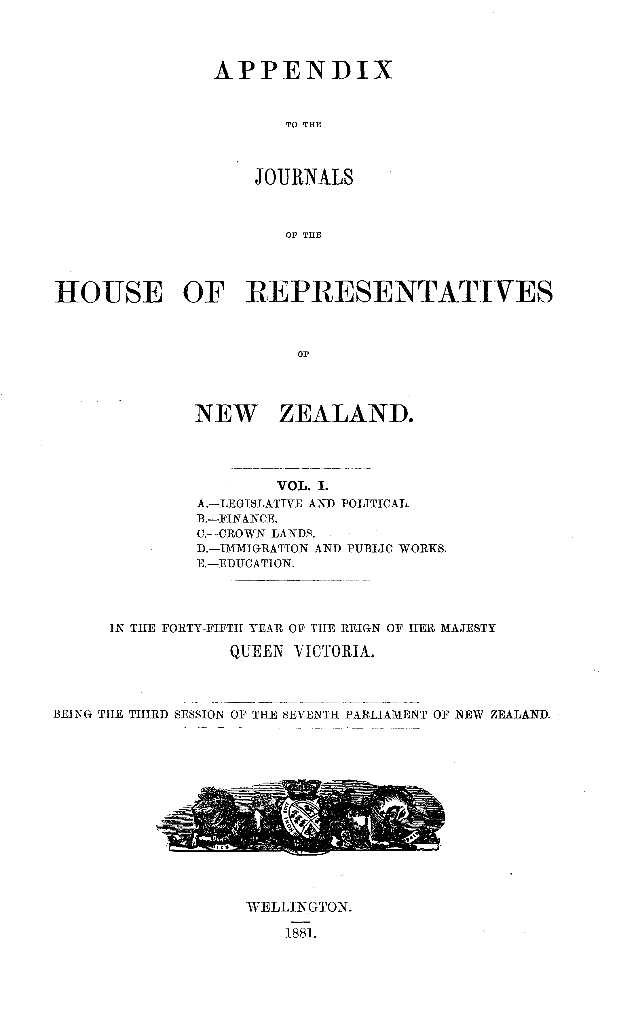 VOL. I. A.—LEGISLATIVE AND POLITICAL. B.—FINANCE. C—CEOWN LANDS. D.—IMMIGRATION AND PUBLIC WORKS. E.—EDUCATION.
