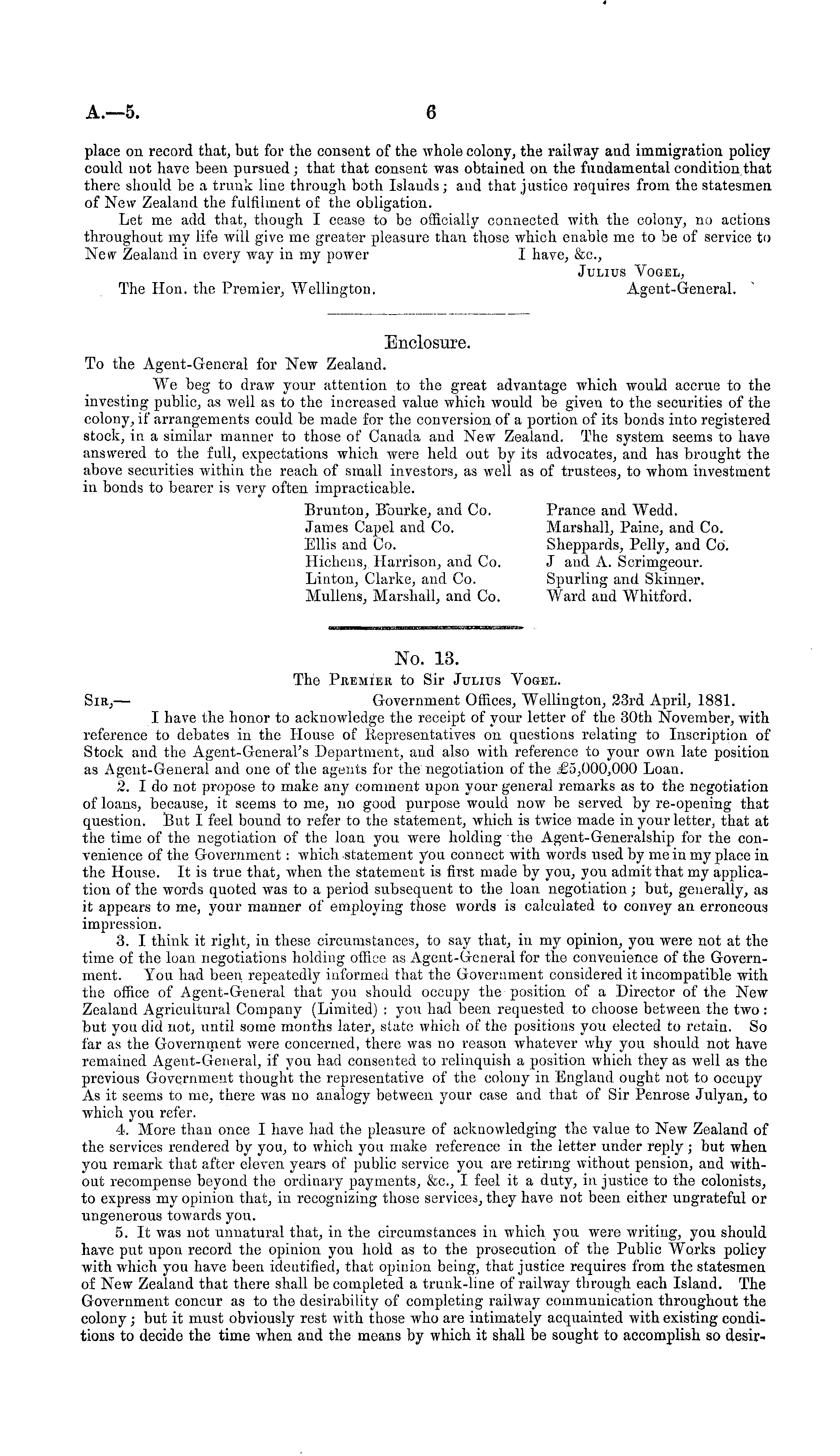 No. 13. The Premier to Sir Julius Vogel. Sir, — Government Offices, Wellington, 23rd April, 1881. I have the honor to acknowledge the receipt of your letter of the 30th November, with reference to debates in the House of Representatives on questions relating to Inscription of Stock and the Agent-General's Department, and also with reference to your own late position as Agent-General and one of the agents for the negotiation of the £5,000,000 Loan. 2. I do not propose to make any comment upon your general remarks as to the negotiation of loans, because, it seems to me, no good purpose would now be served by re-opening that question. But I feel bound to refer to the statement, which is twice made in your letter, that at the time of the negotiation of the loan you were holding the Agont-Generalship for the convenience of the Government: which statement you connect with words used by me in my place in. the House. It is true that, when the statement is first made by you, you admit that my application of the words quoted was to a period subsequent to the loan negotiation; but, generally, as it appears to me, your manner of employing those words is calculated to convey an erroneous impression. 3. I think it right, in these circumstances, to say that, in my opinion, you were not at the time of the loan negotiations holding office as Agent-General for the convenience of the Government. You had been repeatedly informed that the G overurnent considered it incompatible with the office of Agent-General that you should occupy the position of a Director of the New Zealand Agricultural Company (Limited) : you had been requested to choose between the two: but you did not, until some months later, state which of the positions you elected to retain. So far as the Government were concerned, there was no reason whatever why you should not have remained Agent-General, if you had consented to relinquish a position which they as well as the previous Government thought the representative of the colony in England ought not to occupy As it seems to me, there was no analogy between your case and that of Sir Penrose Julyan, to ■which you refer. 4. More than once I have had the pleasure of acknowledging the value to New Zealand of the services rendered by you, to which you make reference in the letter under reply ; but when you remark that after eleven years of public service you are retiring without pension, and without recompense beyond the ordinary payments, &c, I feel it a duty, in justice to the colonists, to express my opinion that, in recognizing those services, they have not been either ungrateful or ungenerous towards you. 5. It was not unnatural that, in the circumstances in which you were writing, you should have put upon record the opinion you hold as to the prosecution of the Public Works policy with which you have been identified, that opinion being, that justice requires from the statesmen of New Zealand that there shall be completed a trunk-line of railway through each Island. The Government concur as to the desirability of completing railway communication throughout the colony ; but it must obviously rest with those who are intimately acquainted with existing conditions to decide the time when and the means by which it shall be sought to accomplish so desir-