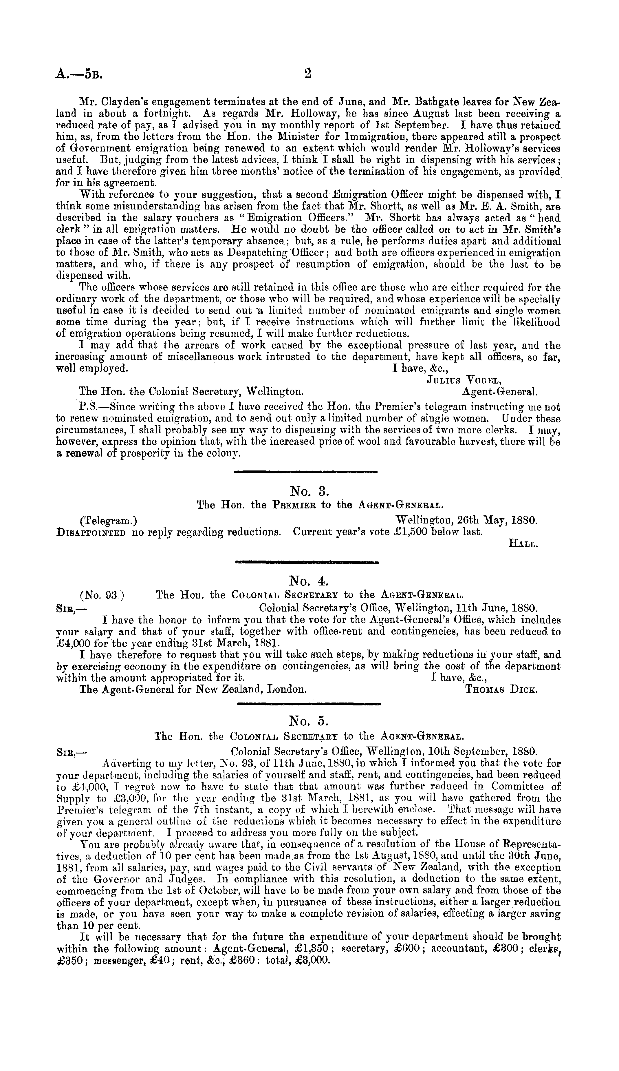 No. 3. The Hon. the Peemiee to the Agent-Geneeal. (Telegram.) Wellington, 26th May, 1880. Disappointed no reply regarding reductions. Current year's vote £1,500 below last. Hall.