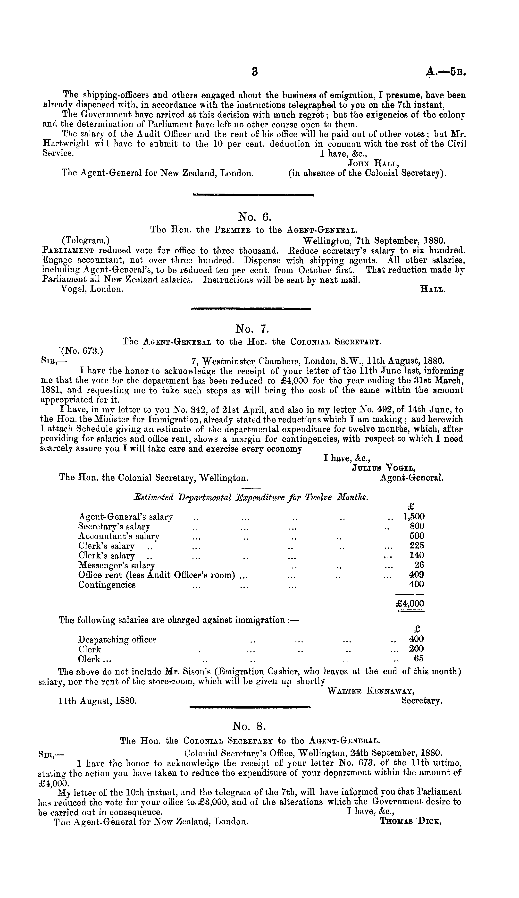 No. 6. The Hon. the Peemiee to the Agent-Geneeal. (Telegram.) Wellington, 7th September, 1880. Paeliament reduced vote for office to three thousand. Eeduce secretary's salary to six hundred. Engage accountant, not over three hundred. Dispense with shipping agents. All other salaries, including Agent-General's, to be reduced ten per cent, from October first. That reduction made by Parliament all New Zealand salaries. Instructions will be sent by next mail. Vogel, London. Hall.
