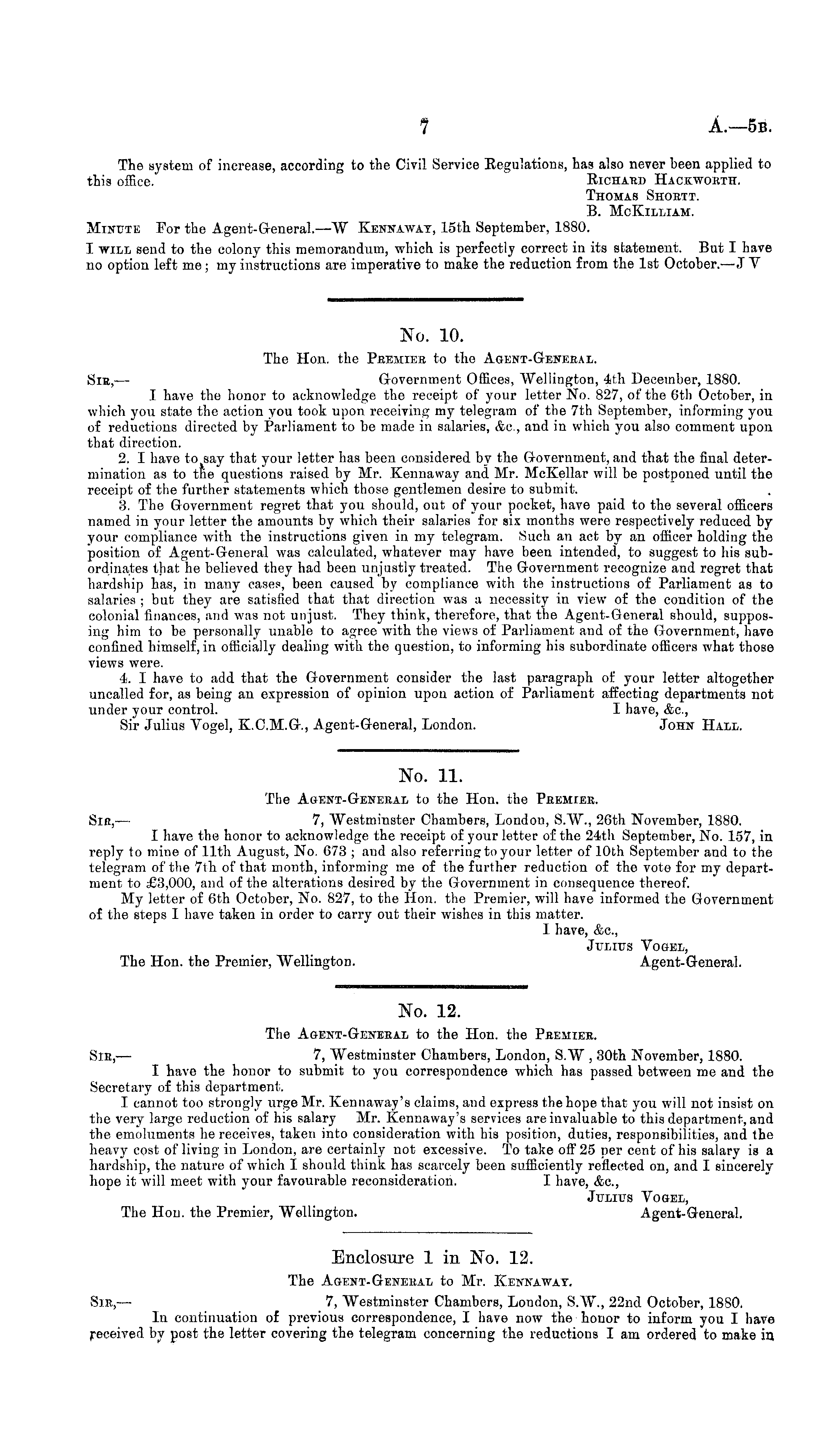 Enclosure 1 in No. 12. The Agent-Geneeal to Mr. Kennawat. Sie,— 7, Westminster Chambers, London, S.W., 22nd October, 1880. In continuation of previous correspondence, I have now the honor to inform you I have received by post the letter covering the telegram concerning the reductions I am ordered to make in