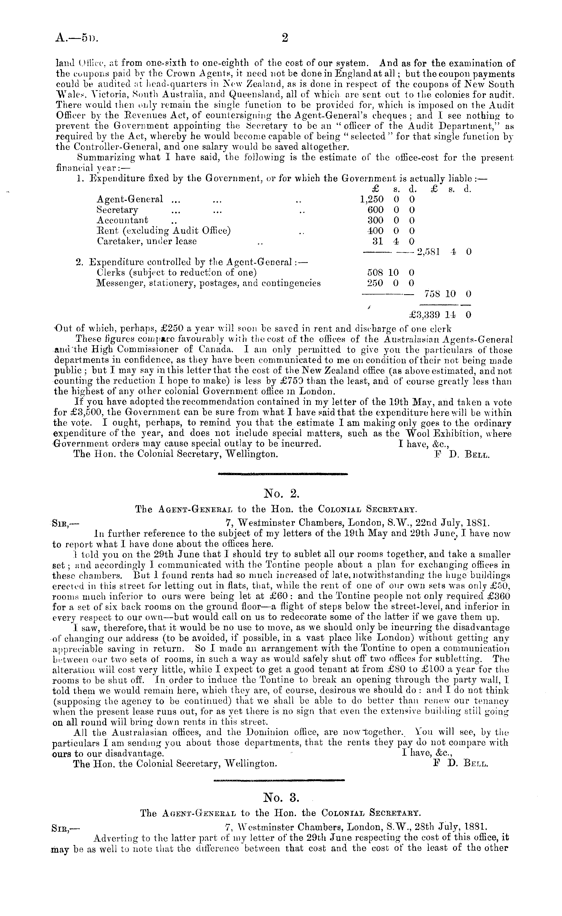 No. 2. The Agent-General to the Hon. the Colonial Secretary. Sir, — 7, Westminster Chambers, London, S.W., 22nd July, 1881. In further reference to the subject of my letters of the 19th May and 29th June, I have now to report what I have done about the offices here. 1 told you on the 29th June that I should try to sublet all our rooms together, and take a smaller set; and accordingly I communicated with the Tontine people about a plan for exchanging offices in these chambers. But I found rents had so much increased of late, notwithstanding the huge buildings erected in this street for letting out in flats, that, while the rent of one of our own sets was only £50, rooms much inferior to ours were being let at £60 : and the Tontine people not only required £300 for a set of six back rooms on the ground floor —a flight of steps below the street-level, and inferior in every respect to our own —but would call on us to redecorate some of the latter if we gave them up. I saw, therefore, that it would be no use to move, as we should only be incurring the disadvantage of changing our address (to be avoided, if possible, in a vast place like London) without getting any appreciable saving in return. So I made an arrangement with the Tontine to open a communication between our two sets of rooms, in such a way as would safely shut off two offices for subletting. The alteration will cost very little, while I expect to get a good tenant at from £80 to £100 a year for the rooms to be shut off. In order to induce the Tontine to break an opening through the party wall, I told them we would remain here, which they are, of course, desirous we should do : and I do not think (supposing the agency to be continued) that we shall be able to do bettor than renew our tenancy when the present lease runs out, for as yet there is no sign that even the extensive building still going on all round will bring down rents in this street. All the Australasian offices, and the Dominion office, are now together. You will see, by the particulars I am sending you about those departments, that the rents they pay do not compare with ours to our disadvantage. I have, &c, The Hon. the Colonial Secretary, Wellington. F D. Bell.