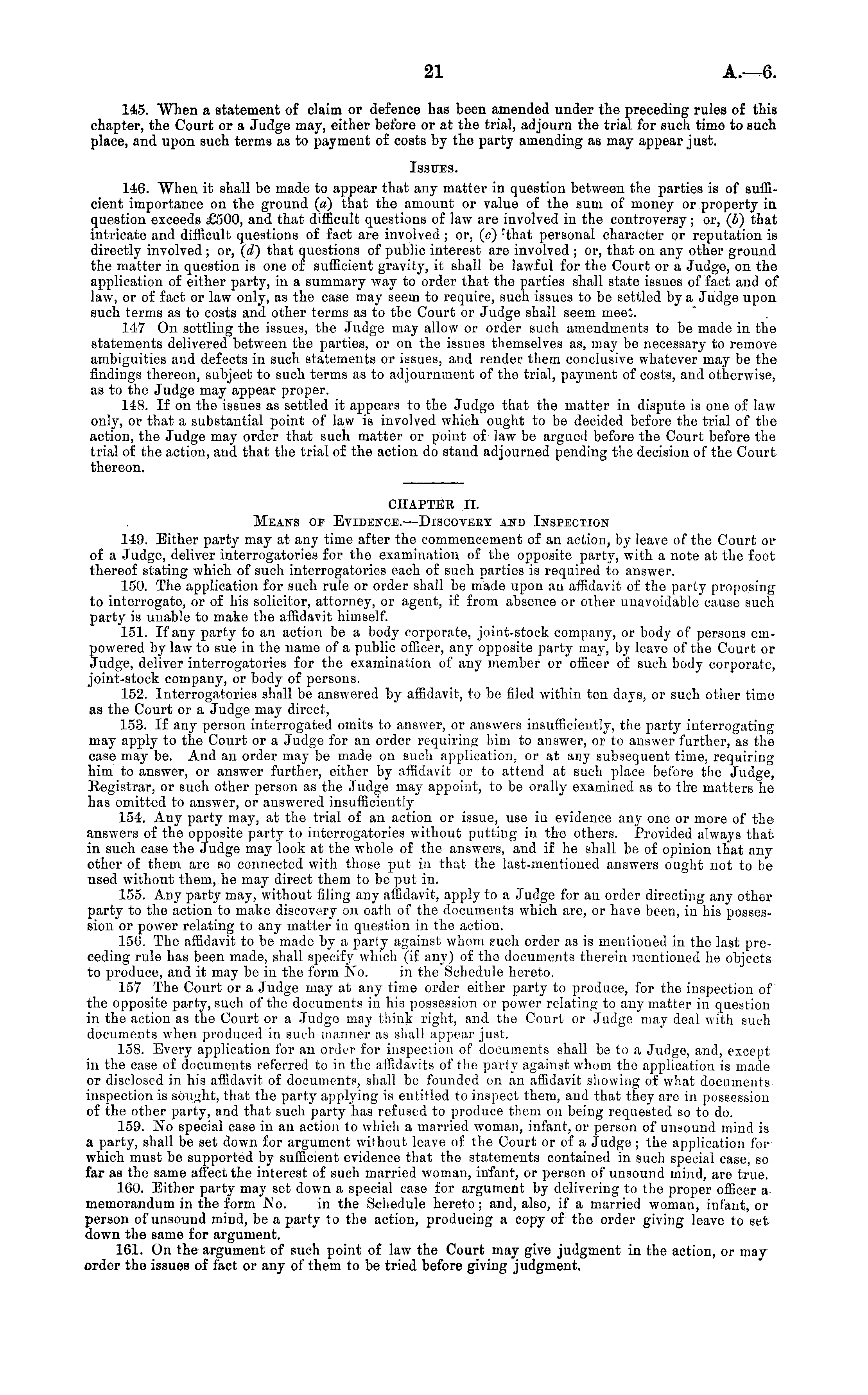 CHAPTER 11. Means of Evidence. —Discovery and Inspection 149. Either party may at any time after the commencement of an action, by leave of the Court or of a Judge, deliver interrogatories for the examination of the opposite party, with a note at the foot thereof stating which of such interrogatories each of such parties is required to answer. 150. The application for such rule or order shall be made upon an affidavit of the party proposing to interrogate, or of his solicitor, attorney, or agent, if from absence or other unavoidable cause such party is unable to make the affidavit himself. 151. If any party to an action be a body corporate, joint-stock company, or body of persons empowered by law to sue in the name of a public officer, any opposite party may, by leave of the Court or Judge, deliver interrogatories for the examination of any member or officer of such body corporate, joint-stock company, or body of persons. 152. Interrogatories shall be answered by affidavit, to be filed within ton days, or such other time as the Court or a Judge may direct, 153. If any person interrogated omits to answer, or answers insufficiently, the party interrogating may apply to the Court or a Judge for an order requiring him to answer, or to answer further, as the case may be. And an order may be made on such application, or at ary subsequent time, requiring him to answer, or answer further, either by affidavit or to attend at such place before the Judge, Registrar, or such other person as the Judge may appoint, to be orally examined as to the matters he has omitted to answer, or answered insufficiently 154. Any party may, at the trial of an action or issue, use in evidence any one or more of the answers of the opposite part}- to interrogatories without putting in the others. Provided always that in such case the Judge may look at the whole of the answers, and if he shall be of opinion that any other of them are so connected with those put in that the last-mentioned answers ought not to be used without them, he may direct them to be put in. 155. Any party may, without filing any affidavit, apply to a Judge for an order directing any other party to the action to make discovery on oath of the documents which are, or have been, in his possession or power relating to any matter in question in the action. 156. The affidavit to be made by a party against whom such order as is mentioned in the last preceding rule has been made, shall specify which (if any) of the documents therein mentioned he objects to produce, and it may be in the form No. in the Schedule hereto. 157 The Court or a Judge may at any time order either party to produce, for the inspection of the opposite party, such of the documents in his possession or power relating to any matter in question in the action as the Court or a Judge may think right, and the Court or Judge may deal with such, documents when produced in such manner as shall appear just. 158. Every application for an order for inspection of documents shall be to a Judge, and, except in the case of documents referred to in the affidavits of the party against whom the application is made or disclosed in his affidavit of documents, shall be founded on an affidavit showing of what documents inspection is sought, that the party applying is entitled to inspect them, and that they are in possession of the other party, and that such party has refused to produce them on being requested so to do. 159. No special case in an action to which a married woman, infant, or person of unsound mind is a party, shall be set down for argument without leave of the Court or of a judge ; the application for which must be supported by sufficient evidence that the statements contained in such special case, so far as the same affect the interest of such married woman, infant, or person of unsound mind, are true. 160. Either party may set down a special case for argument by delivering to the proper officer a memorandum in the form No. in the Schedule hereto; and, also, if a married woman, infant, or person of unsound mind, be a party to the action, producing a copy of the order giving leave to set down the same for argument. 161. On the argument of such point of law the Court may give judgment in the action, or may order the issues of fact or any of them to be tried before giving judgment.