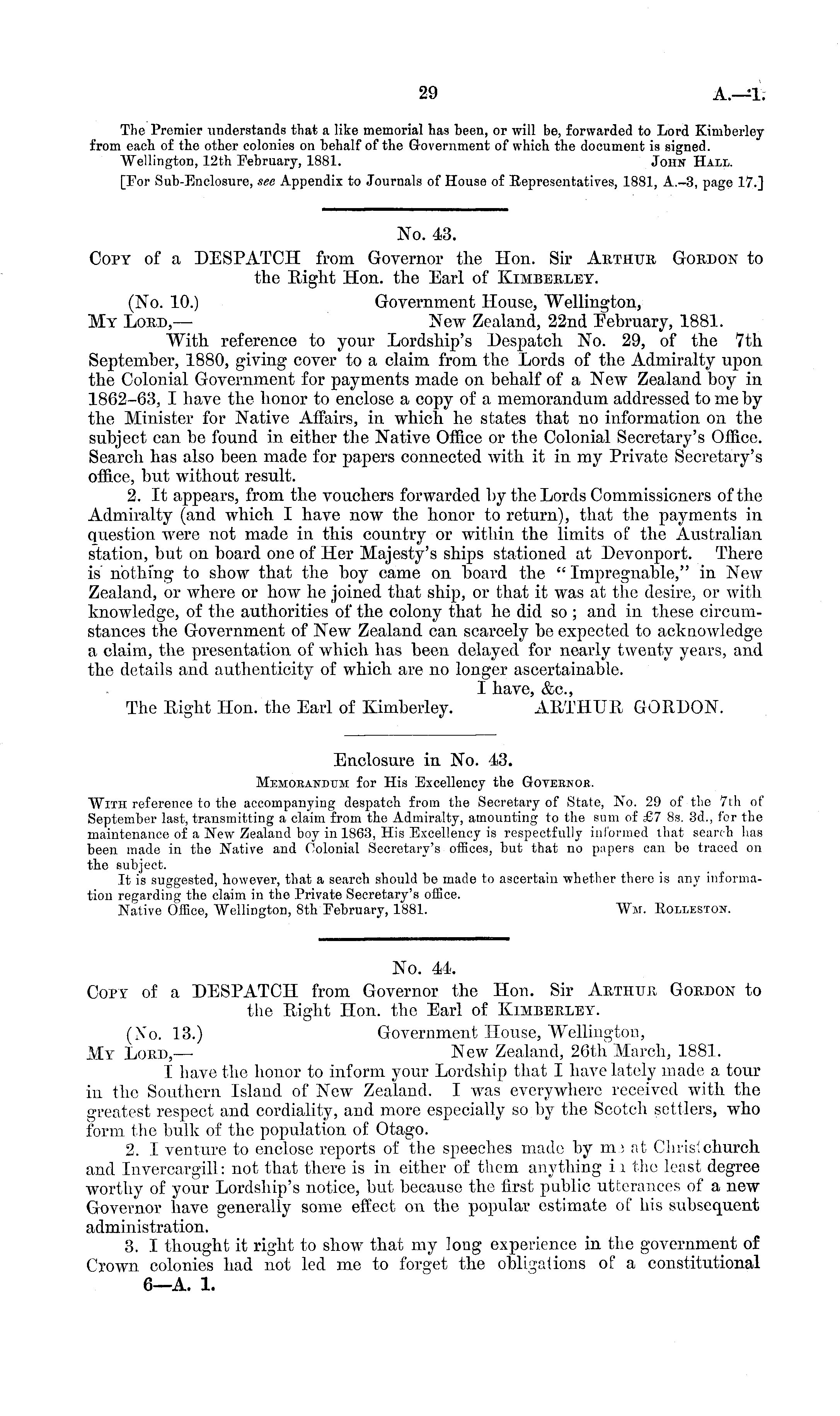 No. 43. Copy of a DESPATCH from Governor the Hon. Sir Arthur Gordon to the Right Hon. the Earl of Kimberley. (No. 10.) Government House, Wellington, My Lord, — New Zealand, 22nd February, 1881. With reference to your Lordship's Despatch No. 29, of the 7th September, 1880, giving cover to a claim from the Lords of the Admiralty upon the Colonial Government for payments made on behalf of a New Zealand boy in 1862-63, I have the honor to enclose a copy of a memorandum addressed to me by the Minister for Native Affairs, in which he states that no information on the subject can be found in either the Native Office or the Colonial Secretary's Office. Search has also been made for papers connected with it in my Private Secretary's office, but without result. 2. It appears, from the vouchers forwarded by the Lords Commissioners of the Admiralty (and which I have now the honor to return), that the payments in question were not made in this country or within the limits of the Australian station, but on board one of Her Majesty's ships stationed at Devonport. There is' nothing to show that the boy came on board the " Impregnable," in New Zealand, or where or how he joined that ship, or that it was at the desire, or with knowledge, of the authorities of the colony that he did so ; and in these circumstances the Government of New Zealand can scarcely be expected to acknowledge a claim, the presentation of which has been delayed for nearly twenty years, and the details and authenticity of which are no longer ascertainable. I have, &c, The Right Hon. the Earl of Kimberley. ARTHUR GORDON.