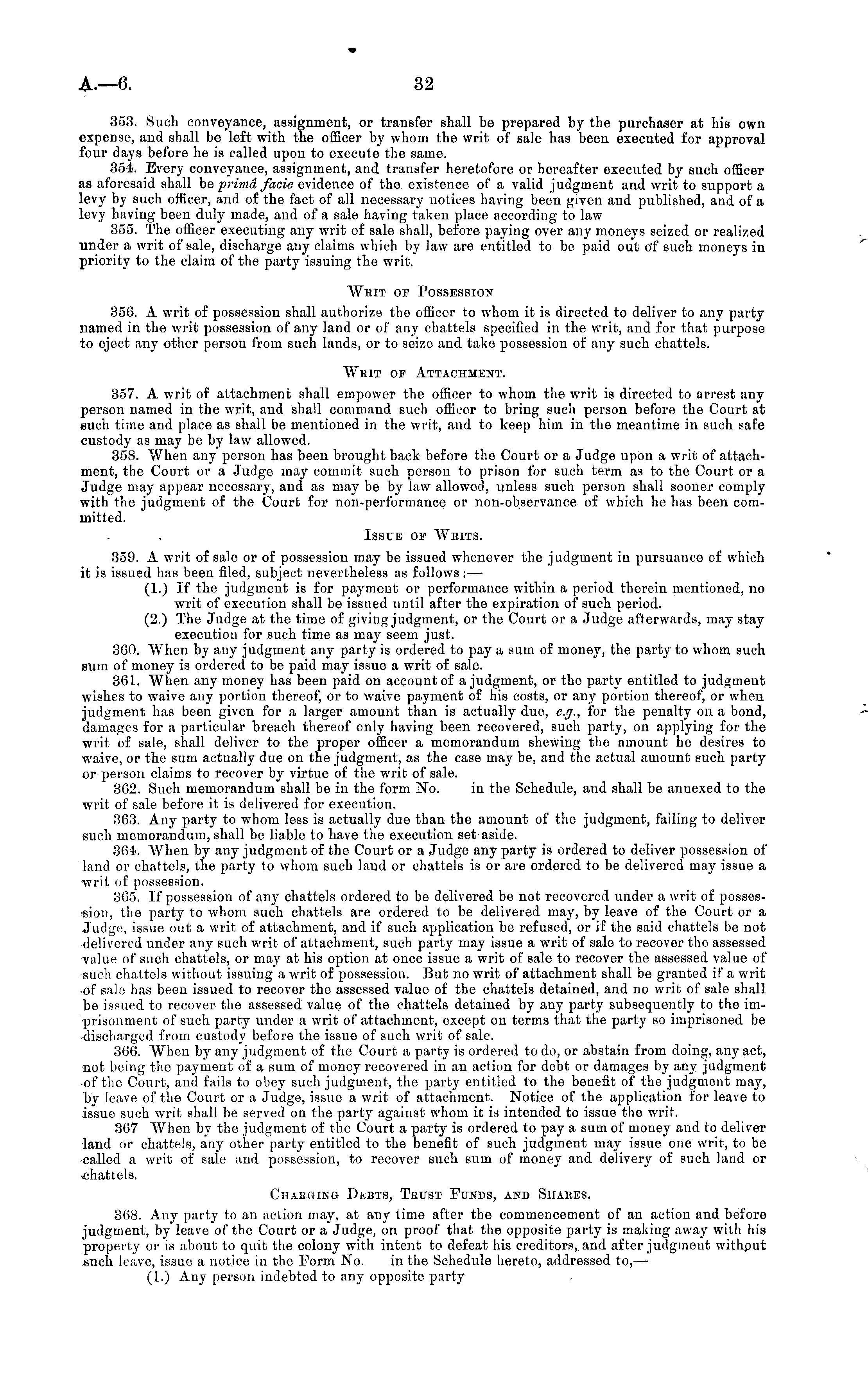 353. Such conveyance, assignment, or transfer shall be prepared by the purchaser at his own expense, and shall be left with the officer by whom the writ of sale has been executed for approval four days before he is called upon to execute the same. 354. Every conveyance, assignment, and transfer heretofore or hereafter executed by such officer as aforesaid shall be ■prima facie evidence of the existence of a valid judgment and writ to support a levy by such officer, and of the fact of all necessary notices having been given and published, and of a levy having been duly made, and of a sale having taken place according to law 355. The officer executing any writ of sale shall, before paying over any moneys seized or realized under a writ of sale, discharge any claims which by law are entitled to be paid out o'f such moneys in priority to the claim of the party issuing the writ. Wbit of Possession 356. A writ of possession shall authorize the officer to whom it is directed to deliver to any party named in the writ possession of any land or of any chattels specified in the writ, and for that purpose to eject any other person from such lands, or to seize and take possession of any such chattels. Wbit of Attachment. 357. A writ of attachment shall empower the officer to whom the writ is directed to arrest any person named in the writ, and shall command such officer to bring such person before the Court at such time and place as shall be mentioned in the writ, and to keep him in the meantime in such safe custody as may be by law allowed. 358. When any person has been brought back before the Court or a Judge upon a writ of attachment, the Court or a Judge may commit such person to prison for such term as to the Court or a Judge may appear necessary, and as may be by law allowed, unless such person shall sooner comply with the judgment of the Court for non-performance or non-observance of which he has been committed. Issue of Wbits. 359. A writ of sale or of possession may be issued whenever the judgment in pursuance of which it is issued has been filed, subject nevertheless as follows : — (1.) If the judgment is for payment or performance within a period therein mentioned, no writ of execution shall be issued until after the expiration of such period. (2.) The Judge at the time of giving judgment, or the Court or a Judge afterwards, may stay execution for such time as may seem just. 360. When by any judgment any party is ordered to pay a sum of money, the party to whom such sum of money is ordered to be paid may issue a writ of sale. 361. When any money has been paid on account of a judgment, or the party entitled to judgment wishes to waive any portion thereof, or to waive payment of his costs, or any portion thereof, or when judgment has been given for a larger amount than is actually due, e.g., for the penalty on a bond, damages for a particular breach thereof only having been recovered, such party, on applying for the writ of sale, shall deliver to the proper officer a memorandum shewing the amount he desires to waive, or the sum actually due on the judgment, as the case may be, and the actual amount such party or person claims to recover by virtue of the writ of sale. 362. Such memorandum shall be in the form No. in the Schedule, and shall be annexed to the writ of sale before it is delivered for execution. 363. Any party to whom less is actually due than the amount of the judgment, failing to deliver such memorandum, shall be liable to have the execution set aside. 364. When by any judgment of the Court or a Judge any party is ordered to deliver possession of land or chattels, the party to whom such laud or chattels is or are ordered to be delivered may issue a writ of possession. 365. If possession of any chattels ordered to be delivered be not recovered under a writ of possession, the party to whom such chattels are ordered to be delivered may, by leave of the Court or a Judge, issue out a writ of attachment, and if such application be refused, or if the said chattels be not delivered under any such writ of attachment, such party may issue a writ of sale to recover the assessed value of such chattels, or may at his option at once issue a writ of sale to recover the assessed value of such chattels without issuing a writ of possession. But no writ of attachment shall be granted if a writ of sale has been issued to recover the assessed value of the chattels detained, and no writ of sale shall be issued to recover the assessed value of the chattels detained by any party subsequently to the imprisonment of such party under a writ of attachment, except on terms that the party so imprisoned be discharged from custody before the issue of such writ of sale. 366. When by any judgment of the Court a party is ordered to do, or abstain from doing, any act, not being the payment of a sum of money recovered in an action for debt or damages by any judgment of the Court, and fails to obey such judgment, the party entitled to the benefit of the judgment may, by leave of the Court or a Judge, issue a writ of attachment. Notice of the application for leave to issue such writ shall be served on the party against whom it is intended to issue the writ. 367 When by the judgment of the Court a party is ordered to pay a sum of money and to deliver land or chattels, any other party entitled to the benefit of such judgment may issue one writ, to be called a writ of sale and possession, to recover such sum of money and delivery of such land or •chattels. CIIAEGING D.JBTS, TfIUST EuNDS, AND SItABES. 368. Any party to an action may, at any time after the commencement of an action and before judgment, by leave of the Court or a Judge, on proof that the opposite party is making away with his property or is about to quit the colony with intent to defeat his creditors, and after judgment without such leave, issue a notice in the Eorm No. in the Schedule hereto, addressed to, — (1.) Any person indebted to any opposit