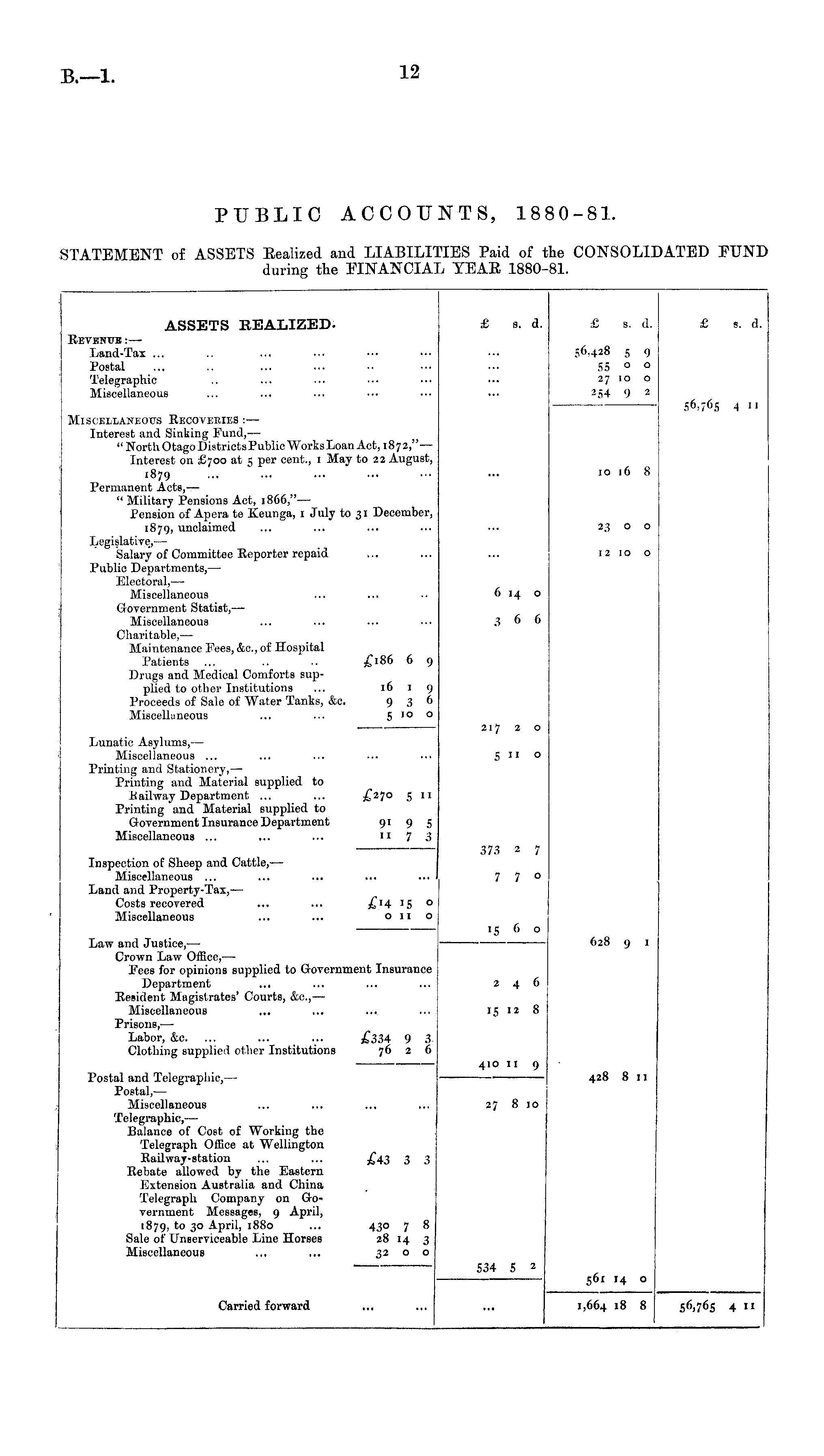 ASSETS REALIZED. & s. d. £ s. d. £ s. d. Revenue: — Land-Tax ... Postal Telegraphic Miscellaneous ... ... 56,428 5 9 55 ° ° 27 10 o 254 9 2 56.765 4 11 Miscellaneous Recoveries : — Interest and Sinking Fund, — " North Otago Districts Public Works Loan Act, 1872," — Interest on £700 at 5 per cent., 1 May to 22 August, 1879 Permanent Acts, — " Military Pensions Act, 1866," — Pension of Apera te Keunga, 1 July to 31 December, 1879, unclaimed Legislative, — Salary of Committee Reporter repaid Public Departments,— Electoral, — Miscellaneous Government Statist, — Miscellaneous Charitable, — Maintenance Fees, &c, of Hospital Patients ... .. .. £186 6 9 Drags and Medical Comforts supplied to other Institutions ... 16 1 9 Proceeds of Sale of Water Tanks, &c. 936 Miscelluneous ... ... 5 Io ° 10 16 8 23 o o 12 10 o 6 14 o 3 6 6 217 2 o Lunatic Asylums, — Miscellaneous ... Printing and Stationery, — Printing and Material supplied to Railway Department ... ... £21° 5 JI Printing and Material supplied to Government Insurance Department 91 9 5 Miscellaneous ... ... ... n 7 3 5 11 o 373 2 7 Inspection of Sheep and Cattle, — Miscellaneous ... Land and Property-Tax, — Costs recovered ... ... £14 15 ° Miscellaneous ... ... o 11 o 7 7° 15 6 o Law and Justice, — Crown Law Office, — Fees for opinions supplied to Government Insurance Department ... Resident Magistrates' Courts, &c, — Miscellaneous Prisons, — Labor, &c. ... ... ... £334 9 3 Clothing supplied other Institutions 76 2 6 246 15 12 8 628 9 1 410 11 9 Postal and Telegraphic, — Postal,— Miscellaneous Telegraphic,— Balance of CoBt of Working the Telegraph Office at Wellington Railway-station ... ... £43 3 3 Rebate allowed by the Eastern Extension Australia and China Telegraph Company on Government Messages, 9 April, 1879, to 30 April, 1880 ... 430 7 8 Sale of Unserviceable Line Horses 28 14 3 Miscellaneous ... ... 32 o o 27 8 10 428 8 11 534 5 2 561 14 o Carried forward 1,664 18 8 S6,76S 4 11