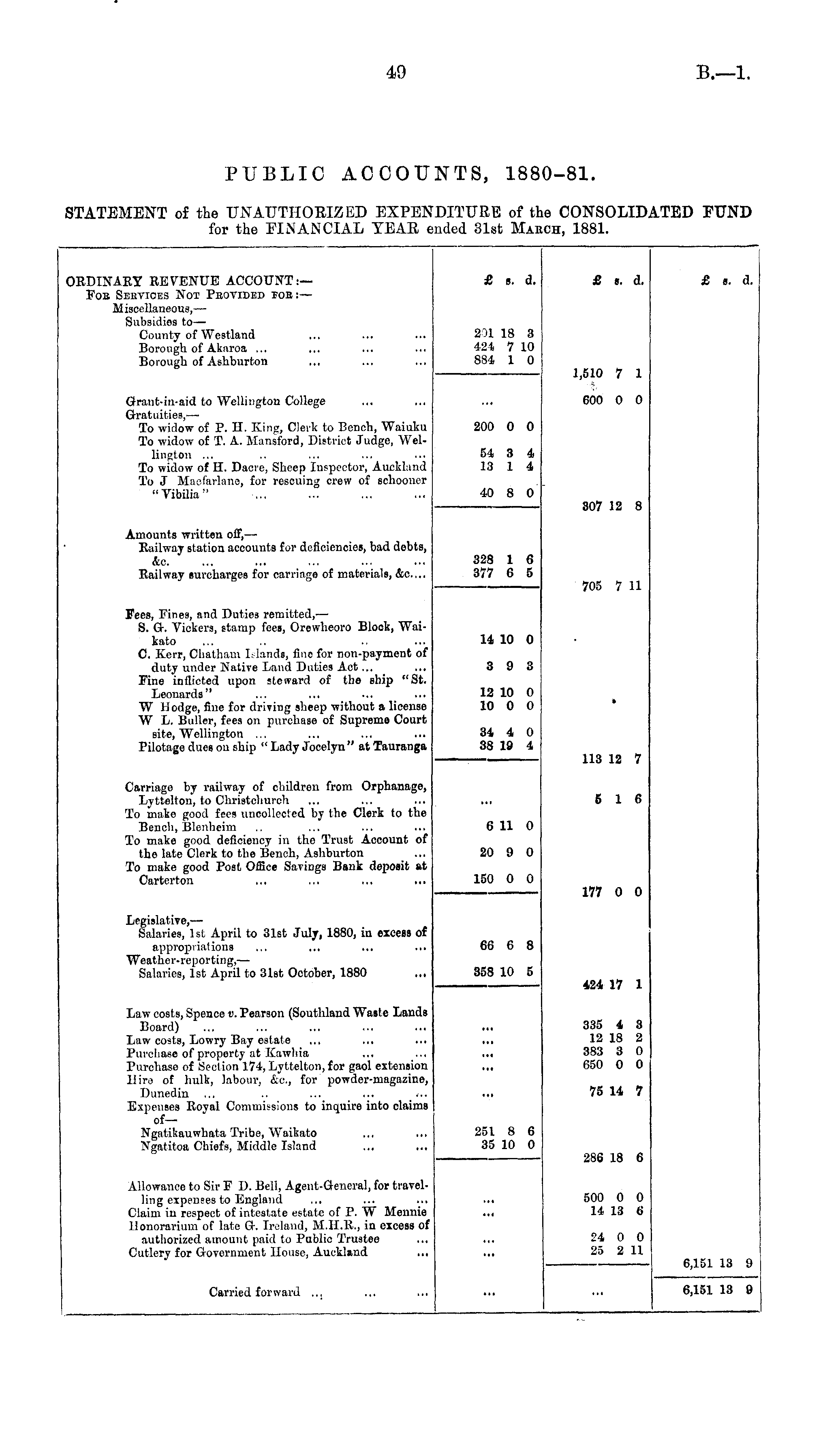 iRDnUKY REVENUE ACCOUNT:— Foe Sehvices Not Pbovided ioe: — M iscellaneous, — Subsidies to — County of Westland Borough of Akaroa ... Borough of Ashburton £ s. d. 201 18 3 424 7 10 884 1 0 £ s. d. 1,510 7 1 600 0 0 £ s. d. Grant-in-aid to Wellington College Gratuities, — To widow of P. H. King, Clerk to Bench, Waiuku To widow of T. A. Mansford, District Judge, Wellington ... To widow of H. Daore, Sheep Inspector, Auckland To J Macfarlano, for rescuing crew of schooner "Vibilia" 200 0 0 54 3 4 13 1 4 40 8 0 307 12 8 Amounts written off, — Railway station accounts for deficiencies, bad debts, Railway surcharges for carriage of materials, &e.,.. 705 7 11 328 1 6 377 6 5 Pees, Fines, and Duties remitted, — S. Or. Viekers, stamp fees, Orewheoro Block, Waikato C. Kerr, Chatham Islands, fine for non-payment of duty under Native Land Duties Act... Fine inflicted upon steward of the ship "St. Leonards" W Hodge, fine for driving sheep without a license W L. Buller, fees on purchase of Supremo Court site, Wellington ... ... ... ... Pilotage dues on ship " Lady Jocelyn" at Tauranga 14 10 0 3 9 3 12 10 0 10 0 0 • 34 4 0 38 19 4 113 12 7 Carriage by railway of children from Orphanage, Lyttelton, to Christchurch To make good fees uncollected by the Clerk to the Bench, Blenheim To make good deficiency in the Trust Account of the late Clerk to the Bench, Ashburton To make good Post Office Savings Bank deposit at Carterton ... ... ... ... 6 11 0 6 16 20 9 0 177 0 0 150 0 0 Legislative, — Salaries, 1st April to 31st July, 1880, in excees of appropriations Weather-reporting, — Salaries, 1st April to 31st October, 1880 66 6 8 424 17 1 358 10 5 Law costs, Spence v. Pearson (Southland Waste Lands Board) Law costs, Lowry Bay estate ... ... Purchase of property at Kawhia Purchase of Section 174, Lyttelton, for gaol extension Hire of hulk, labour, &c, for powder-magazine, Dunedin Expenses Royal Commissions to inquire into claims of— Ngatikauwhata Tribe, Waikato Ngatitoa Chiefs, Middle Island 335 4 3 12 18 2 383 3 0 650 0 0 75 14 7 251 8 6 35 10 0 286 18 6 Allowance to Sir F D. Bell, Agent-General, for travelling expenses to England Claim in respect of intestate estate of P. W Mennie Honorarium of late G-. Ireland, M.H.R., in excess of authorized amount paid to Public Trustee Cutlery for Government House, Auckland 500 0 0 14 13 6 24 0 0 25 2 11 6,151 13 9 Carried forward ... 6,151 13 9