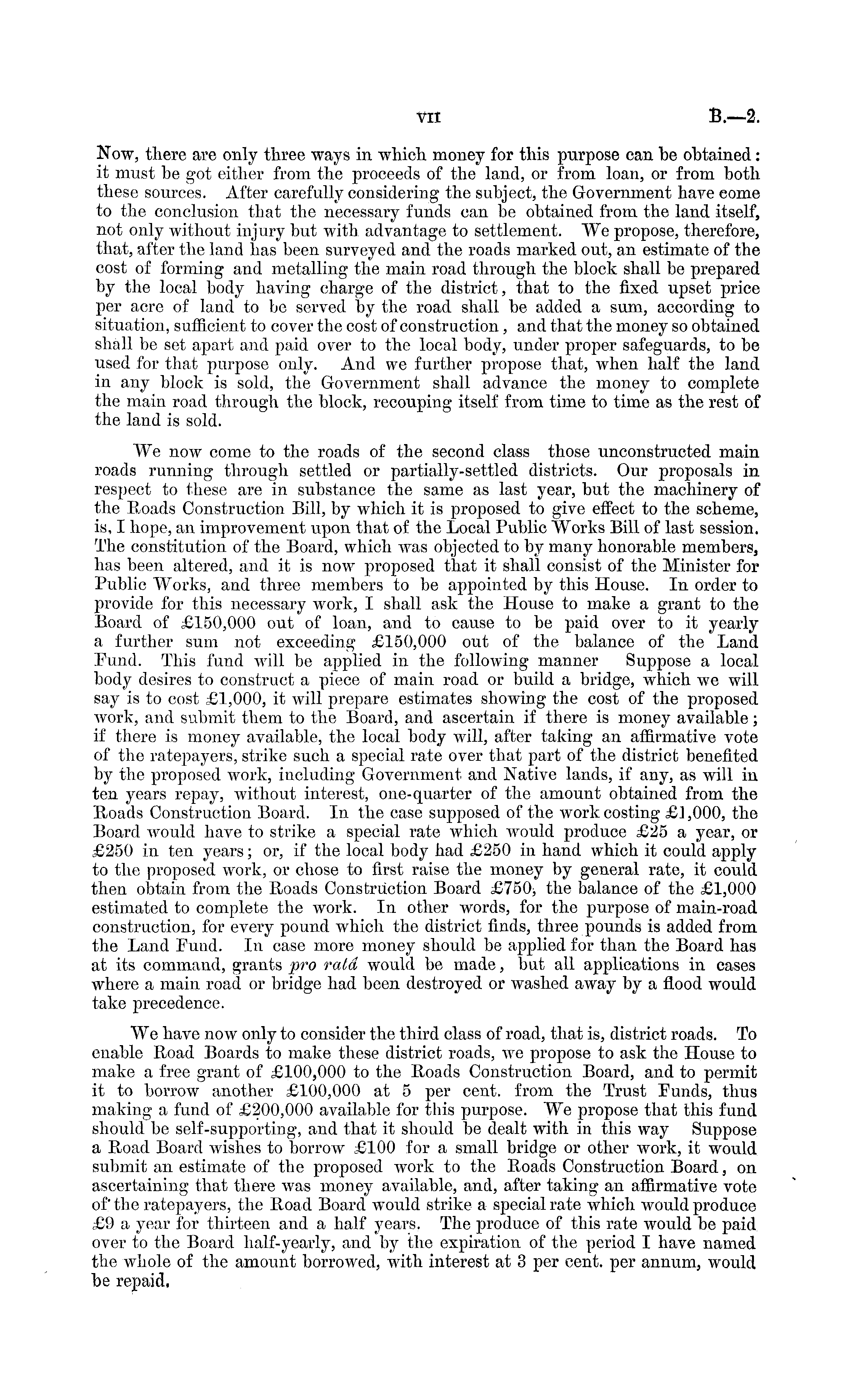 Now, there are only three ways in which money for this purpose can be obtained: it must be got either from the proceeds of the land, or from loan, or from both these sources. After carefully considering the subject, the Government have come to the conclusion that the necessary funds can be obtained from the land itself, not only without injury but with advantage to settlement. We propose, therefore, that, after the land has been surveyed and the roads marked out, an estimate of the cost of forming and metalling the main road through the block shall be prepared by the local body having charge of the district, that to the fixed upset price per acre of land to be served by the road shall be added a sum, according to situation, sufficient to cover the cost of construction, and that the money so obtained shall be set apart and paid over to the local body, under proper safeguards, to be used for that purpose only. And we further propose that, when half the land in any block is sold, the Government shall advance the money to complete the main road through the block, recouping itself from time to time as the rest of the land is sold. We now come to the roads of the second class those unconstructed main roads running through settled or partially-settled districts. Our proposals in respect to these are in substance the same as last year, but the machinery of the Boads Construction Bill, by which it is proposed to give effect to the scheme, is, I hope, an improvement upon that of the Local Public Works Bill of last session. The constitution of the Board, which Avas objected to by many honorable members, has been altered, and it is now proposed that it shall consist of the Minister for Public Works, and three members to be appointed by this House. In order to provide for this necessary work, I shall ask the House to make a grant to the Board of £150,000 out of loan, and to cause to be paid over to it yearly a further sum not exceeding £150,000 out of the balance of the Land Fund. This fund will be applied in the following manner Suppose a local body desires to construct a piece of main road or build a bridge, which we will say is to cost £1,000, it will prepare estimates showing the cost of the proposed Avork, and submit them to the Board, and ascertain if there is money available; if there is money available, the local body will, after taking an affirmative vote of the ratepayers, strike such a special rate OA rer that part of the district benefited by the proposed work, including Government and Native lands, if any, as will in ten years repay, without interest, one-quarter of the amount obtained from the Boads Construction Board. In the case supposed of the work costing £1,000, the Board Avould have to strike a special rate which would produce £25 a year, or £250 in ten years; or, if the local body had £250 in hand which it could apply to the proposed work, or chose to first raise the money by general rate, it could then obtain from the Boads Construction Board £750> the balance of the £1,000 estimated to complete the work. In other words, for the purpose of main-road construction, for every pound which the district finds, three pounds is added from the Land Fund. In case more money should be applied for than the Board has at its command, grants pro rata would be made, but all applications in cases where a main road or bridge had been destroyed or Avashed away by a flood would take precedence. We have now only to consider the third class of road, that is, district roads. To enable Road Boards to make these district roads, Ave propose to ask the House to make a free grant of £100,000 to the Boads Construction Board, and to permit it to borrow another £100,000 at 5 per cent, from the Trust Funds, thus making a fund of £200,000 available for this purpose. We propose that this fund should be self-supporting, and that it should be dealt with in this way Suppose a Boad Board Avishes to borrow £100 for a small bridge or other Avork, it would submit an estimate of the proposed Avork to the Boads Construction Board, on ascertaining that there was money available, and, after taking an affirmative vote of" the ratepayers, the Boad Board would strike a special rate which would produce £9 a year for thirteen and a half years. The produce of this rate would be paid over to the Board half-yearly, and by the expiration of the period I have named the whole of the amount borrowed, with interest at 3 per cent, per annum, Avould be repaid.