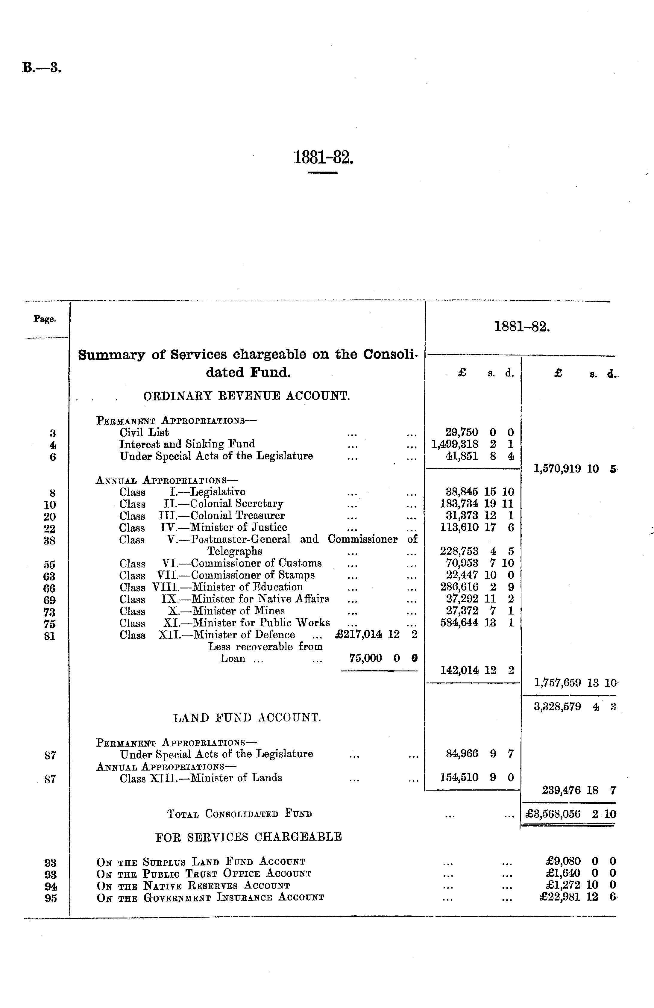 Page. _QC . 1881-82. oo Summary of Services chargeable on the Consoli- - IS81--82. dated Fund. £ £ s. d. s. d. £ s. £ s. d. d. . . . ORDINARY REVENUE ACCOUNT. a 4 6 Peemanent Appbopbiations— Civil List Interest and Sinking Fund Under Special Acts of the Legislature 29,750 1,499,318 41,851 29,750 1,499,318 41,851 I 0 0 ! 2 1 . 8 4 0 0 2 1 8 4 1,570,919 10 5 8 10 20 22 38 55 63 66 69 73 75 SI Annual Appbopbiations— Class I. —Legislative Class II.—Colonial Secretary Class III. —Colonial Treasurer Class IV.—Minister of Justice Class V. —Postmaster-General and Commissioner of Telegraphs Class VI. —Commissioner of Customs Class VII. —Commissioner of Stamps Class VIII. —Minister of Education Class IX.—Minister for Native Affairs Class X.—Minister of Mines Class XL —Minister for Public Works Class XII.—Minister of Defence ... £217,014 12 2 Less recoverable from Loan ... ... 75,000 0 0 38,845 183,734 31,373 113,610 228,753 70,953 22,447 286,616 27,292 27,372 584,644 142,014 38,845 15 10 183,734 19 11 31,373 12 1 113,610 17 6 228,753 4 5 70,953 7 10 22,447 10 0 286,616 2 9 27,292 11 2 27,372 7 1 584,644 13 1 ; is io i 19 11 : 12 l > 17 6 ( 4 5 ! 7 10 ' 10 0 ; 2 9 ! 11 2 ! 7 1 . 13 1 _ 12 2 1,757,659 13 o 10 142,014 12 2 1,757,659 13 10 LAND FUND ACCOUNT. 3,328,579 4 3,328,579 4 3 3 87 Peemanent Appbopbiations— Under Special Acts of the Legislature Annual Appbopbiations— Class XIIL—Minister of Lands 84,966 154,510 84,966 ; 9 7 I 9 0 9 7 239,476 18 239,476 18 7 7 S7 154,510 9 0 Total Consolidated Fund ... . £3,568,056 2 : £3,568,056 2 10 10 FOR SERVICES CHARGEABLE 1)3 93 94 95 On the Subplus Land Fund Account On the Public Teust Office Account On the Native Resebtes Account On the Gotebnment Insubance Account £9,080 0 £1,640 0 £1,272 10 £22,981 12 0 0 0 (>