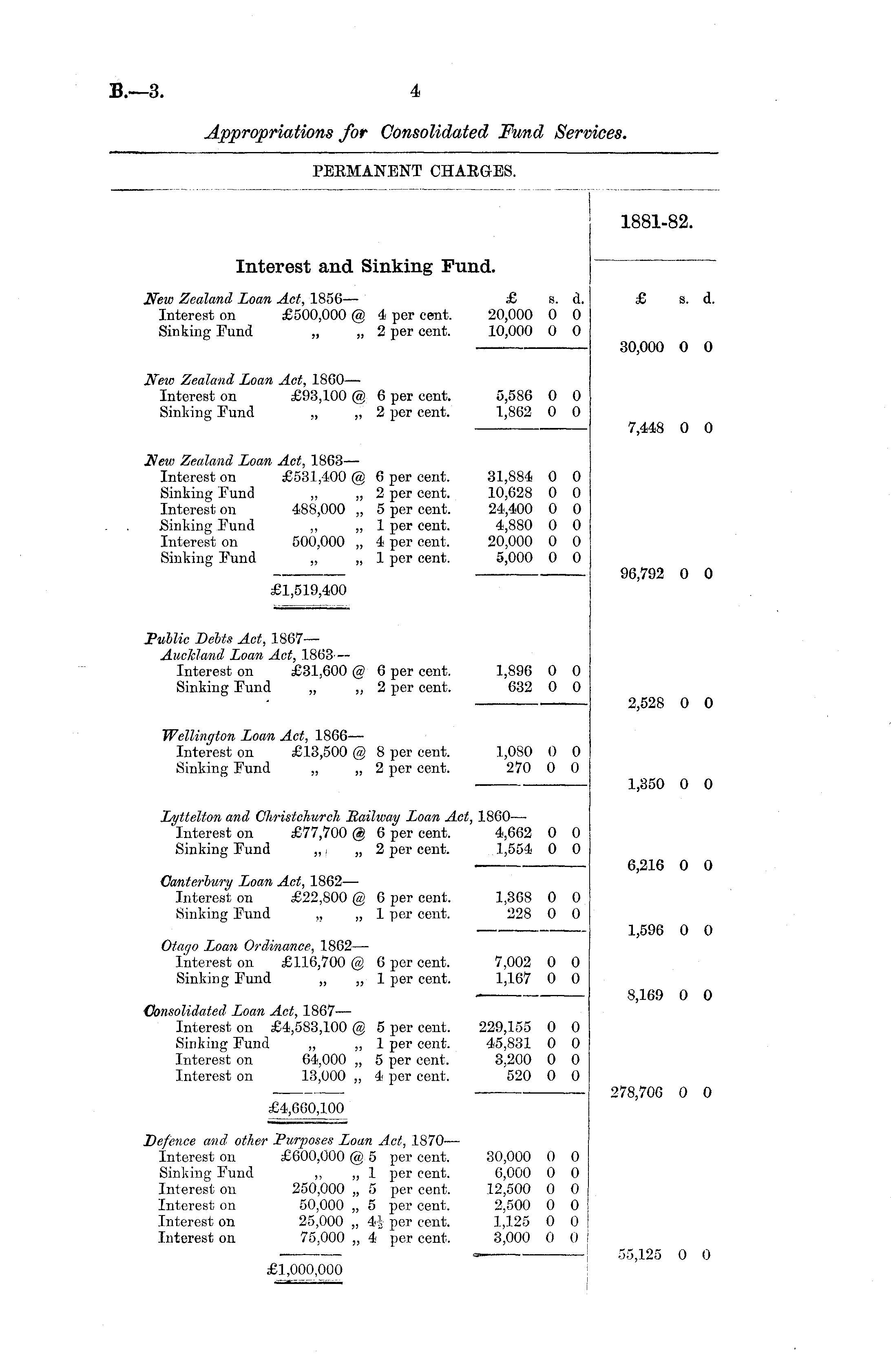 1881-82. Interest and Sinking Fund. Tew Zealand Loan Act, 1856— £ s. d. Interest on £500,000 @ 4 per cent. 20,000 0 0 Sinking Fund „ „ 2 per cent. 10,000 0 0 £ s. d. 30,000 0 0 Tew Zealand Loan Act, 1860— Interest on £93,100 @ 6 per cent. 5,586 0 0 Sinking Fund „ „ 2 per cent. 1,862 0 0 7,448 0 0 7ew Zealand Loan Act, 1863 — Interest on £531,400 @ 6 per cent. 31,884 0 0 Sinking Fund „ „ 2 per cent. 10,628 0 0 Interest on 488,000 „ 5 per cent. 24,400 0 0 Sinking Fund „ „ 1 per cent. 4,880 0 0 Interest on 500,000 „ 4 per cent. 20,000 0 0 Sinking Fund „ „ 1 per cent. 5,000 0 0 96,792 0 0 £1,519,400 ■ublic Debts Act, 1867— Auckland Loan Act, 1863- — Interest on £31,600 @ 6 per cent. 1,896 0 0 Sinking Fund „ „ 2 per cent. 632 0 0 2,528 0 0 Wellington Loan Act, 1866— Interest on £13,500 @ 8 per cent. 1,080 0 0 Sinking Fund „ „ 2 per cent. 270 0 0 1,350 0 0 Lyttelton and Christchurch Bailway Loan Act, 1860 — Interest on £77,700 @ 6 per cent. 4,662 0 0 Sinking Fund ,, „ 2 per cent. 1,554 0 0 6,216 0 0 Canterbury Loan Act, 1862— Interest on £22,800 @ 6 per cent. 1,368 0 0 Sinking Fund ,, „ 1 per cent. 228 0 0 1,596 0 0 Otaqo Loan Ordinance, 1862 — Interest on £116,700 @ 6 per cent. 7,002 0 0 Sinking Fund „ „ 1 per cent. 1,167 0 0 8,169 0 0 onsolidated Loan Act, 1867— Interest on £4,583,100 @ 5 per cent. 229,155 0 0 Sinking Fund „ „ 1 per cent. 45,831 0 0 Interest on 64,000 „ 5 per cent. 3,200 0 0 Interest on 13,000 „ 4 per cent. 520 0 0 £4,660,100 278,70G 0 0 defence and other Purposes Loan Act, 1870— Interest on £600,000 @ 5 per cent. 30,000 0 0 Sinking Fund ,, „ 1 per cent. 6,000 0 0 Interest on 250,000 „ 5 per cent. 12,500 0 0 Interest on 50,000 „ 5 per cent. 2,500 0 0 Interest on 25,000 „ 4| per cent, 1,125 0 0 Interest on 75,000 „ 4 per cent. 3,000 0 0 55,125 0 0 <-——-—— £1,000,000