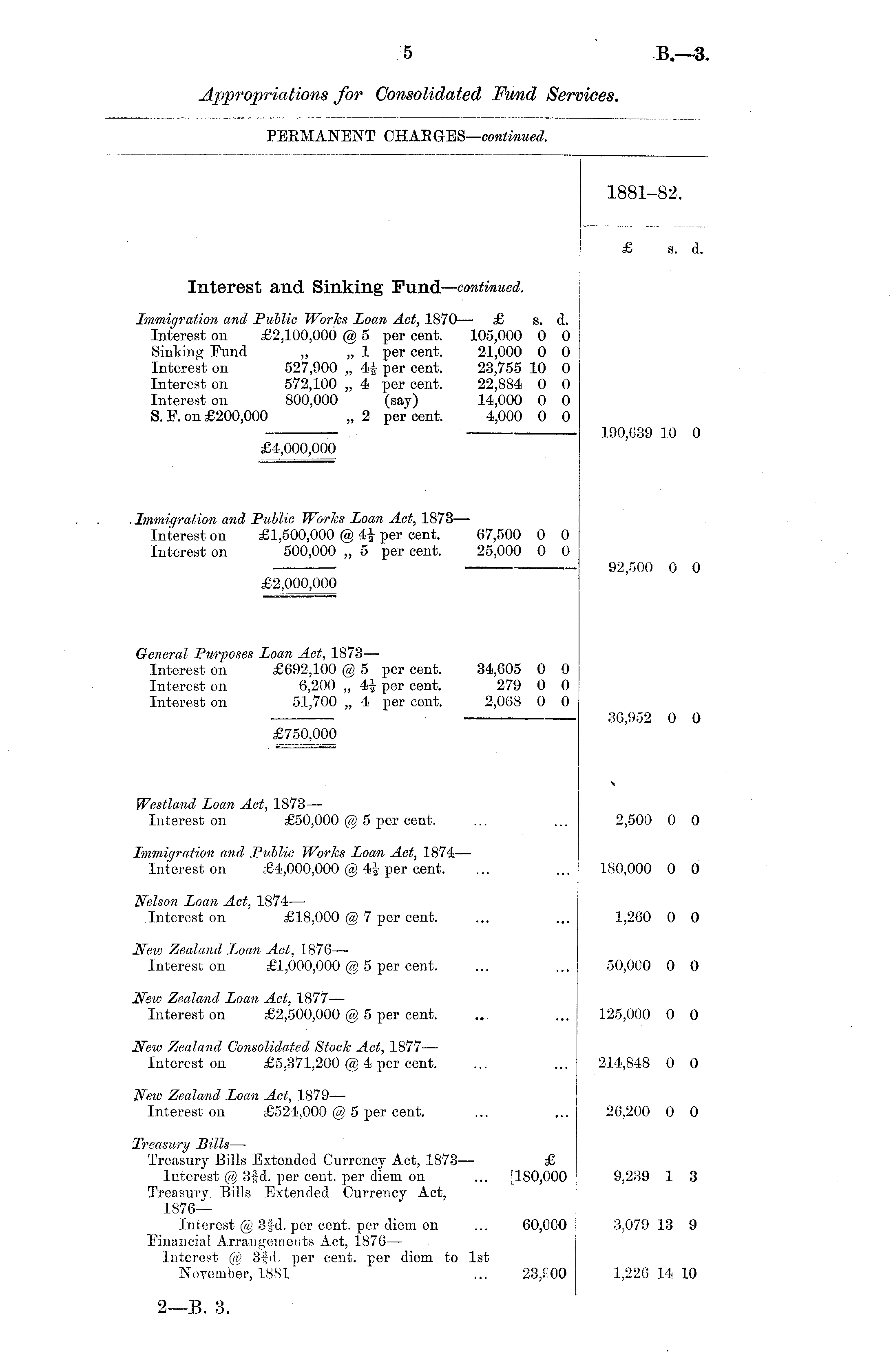 1881-82. Interest and Sinking Fund— continued. £ a. d. Immigration and Public Works Loan Act, 1870- — £ s. d. Interest on £2,100,000 @ 5 per cent. 105,000 0 0 Sinking Fund „ „ 1 per cent. 21,000 0 0 Interest on 527,900 „ 4| per cent. 23,755 10 0 Interest on 572,100 „ 4 per cent. 22,884 0 0 Interest on 800,000 (say) 14,000 0 0 S. F. on £200,000 „ 2 per cent. 4,000 0 0 190,039 10 0 £4,000,000 Immigration and Public Works Loan Act, 1873— Interest on £1,500,000 @ 4| per cent. 67,500 0 0 Interest on 500,000 „ 5 per cent. 25,000 0 0 92,500 0 0 £2,000,000 General Purposes Loan Act, 1873— Interest on £692,100 @ 5 per cent. 34,605 0 0 Interest on 6,200 ,. 4| per cent. 279 0 0 Interest on 51,700 „ 4 per cent. 2,068 0 0 36,952 0 0 £750,000 \ Westland Loan Act, 1873— Interest on £50,000 @ 5 per cent. 2,500 0 0 Immigration and Public Works Loan Act, 1874— Interest on £4,000,000 @ 4f per cent. 180,000 0 0 Nelson Loan Act, 1874— Interest on £18,000 @ 7 per cent. 1,260 0 0 New Zealand Loan Act, 1876 —■ Interest on £1,000,000 @ 5 per cent. 50,000 0 0 New Zealand Loan Act, 1877— Interest on £2,500,000 @ 5 per cent. 125,000 0 0 New Zealand Consolidated Stock Act, 1877— Interest on £5,371,200 @ 4 per cent. 214,848 0 0 New Zealand Loan Act, 1879 — Interest on £524,000 @ 5 per cent. 26.200 0 0 Treasury Bills —■ Treasury Bills Extended Currency Act, 1873 — £ Interest @ 3|d. per cent, per diem on ... Treasury. Bills E_x;tended Currency Act, 1876— Interest @ 3fd. per cent, per diem on ... 60,000 Financial Arrangements Act, 1876 — Interest @ 3fd per cent, per diem to 1st November, 1881 ... 23,£00 9,239 1 3 3,079 13 9 1,226 14 10
