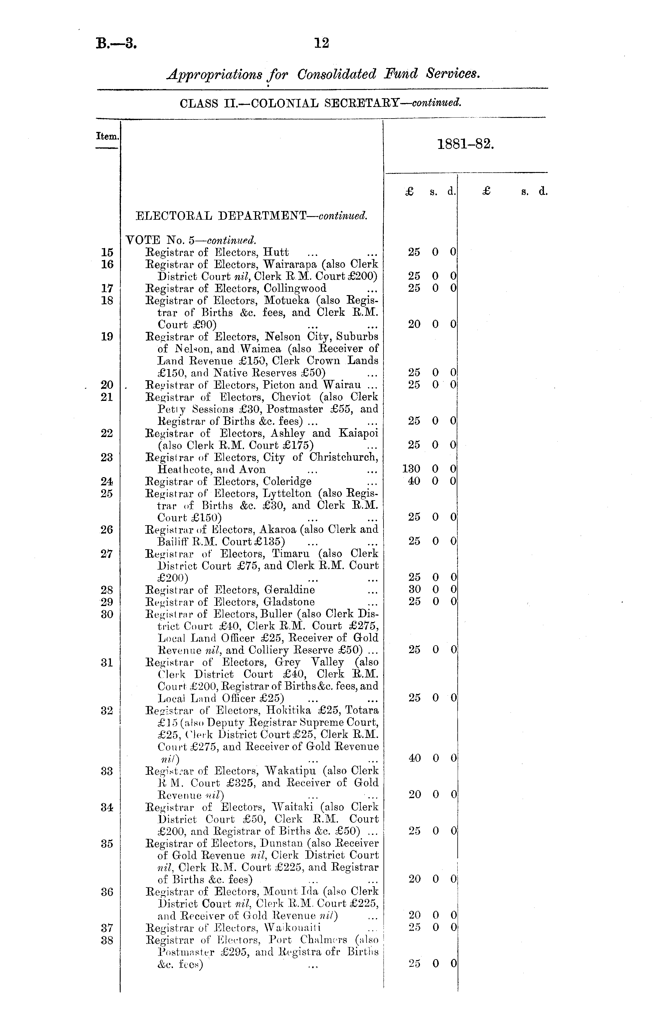 [tem.i 18 1-82. £ s. d. £ s. ELECTORAL DEPARTMENT— continued. VOTE No. 5— continued. Registrar of Electors, Hutt Registrar of Electors, "Wairarapa (also Clerk District Court nil, Clerk EM. Court£200) Registrar of Electors, Collingwood Registrar of Electors, Motueka (also Registrar of Births &c. fees, and Clerk R.M. Court £90) Registrar of Electors, Nelson City, Suburbs of Nelson, and Waimea (also Receiver of Land Revenue £150, Clerk Crown Lands £150, and Native Reserves £50) Registrar of Electors, Picton and Wairau ... Registrar of Electors, Cheviot (also Clerk Petiy Sessions £30, Postmaster £55, and Registrar of Births &c. fees) ... Registrar of Electors, Ashley and Kaiapoi (also Clerk R.M. Court £175) Registrar of Electors, City of Christchurch, Heathcote, and Avon Registrar of Electors, Coleridge Registrar of Electors, Lyttelton (also Registrar of Births .fee. £30, and Clerk R.M. Court £1,50) Registrar of Electors, Akaroa (also Clerk and Bailiff R.M. Court £135) Registrar of Electors, Timaru (also Clerk District Court £75, and Clerk R.M. Court £200) Registrar of Electors, Geraldine Registrar of Electors, Gladstone Registrar of Electors, Buller (also Clerk District Court £40, Clerk R.M. Court £275, Local Land Officer £25, Receiver of Gold Revenue nil, and Colliery Reserve £50) ... Registrar of Electors, Grey Valley (also Clerk District Court £40, Clerk R.M. Court £200, Registrar of Births&c. fees, and Local Land Officer £25) Registrar of Electors, Hokitika £25, Totara £15 (also Deputy Registrar Supreme Court, £25, Clerk District Court £25, Clerk R.M. Court £275, and Receiver of Gold Revenue nil) Registrar of Electors, "Wakatipu (also Clerk R M. Court £325, and Receiver of Gold Revenue nil) ... ... Registrar of Electors, Waitaki (also Clerk District Court £50, Clerk R.M. Court £200, and Registrar of Births &c. £50) ... Registrar of Electors, Dunstan (also Receiver of Gold Revenue nil, Clerk District Court nil, Clerk R.M. Court £225, and Registrar of Births &c. fees) Registrar of Electors, Mount Ida (also Clerk District Court nil, Clerk R.M, Court £225, and Receiver of Gold Revenue nil) Registrar of Electors, Waikouaiti Registrar of Electors, Port Chalmers (also Postmaster £295, and Registra ofr Births &c. fees) 25 0 0 15 16 17 18 25 25 0 0 0 0 20 0 0 19 25 25 0 0 0 0 20 21 25 0 0 22 25 0 0 23 130 40 0 0 0 0 24 25 25 0 0 26 25 0 0 27 28 29 30 25 30 25 0 0 0 0 0 0 25 0 0 31 25 0 0 32 40 0 0 83 20 0 0 34 25 0 0 35 20 0 0 86 20 25 0 0 0 0 37 38 25 0 0