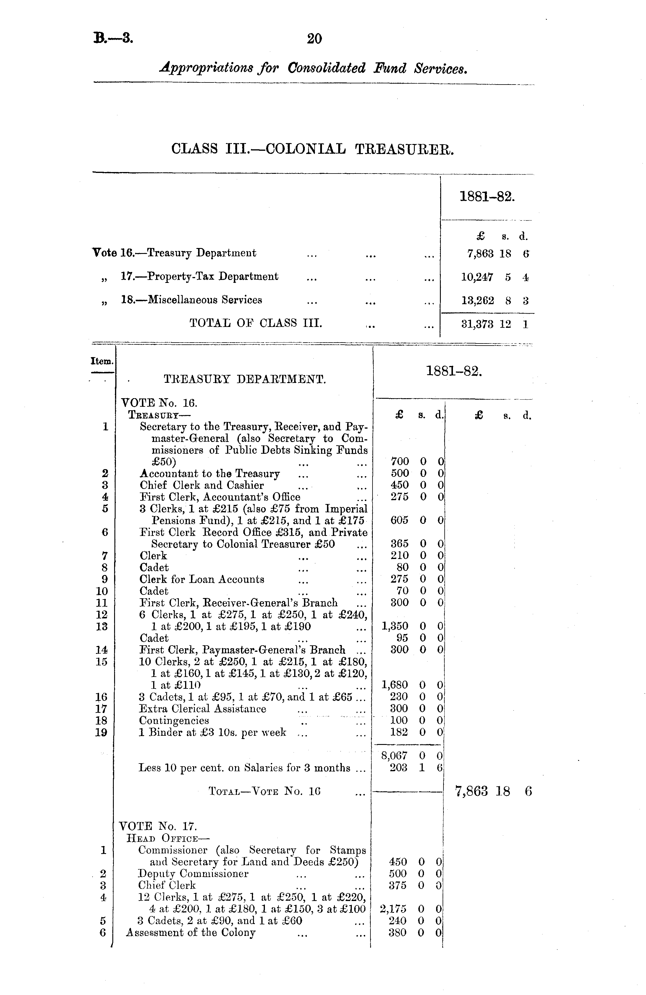 1881-82. £ s. d. Vote 16. —Treasury Department 7,863 18 « „ 17.—Property-Tax Department 10,247 5 4 „ 18.—Miscellaneous Services 13,262 8 3 TOTAL OF CLASS III. 31,373 12 1 Item. ■81-82. TKEASUKY DEPARTMENT. 2 3 4 5 0 7 8 9 10 11 12 13 VOTE No. 16. Tbeasuey— Secretary to the Treasury, Eeceiver, and Pay-master-Greneral (also Secretary to Commissioners of Public Debts Sinking Funds £50) Accountant to the Treasury Chief Clerk and Cashier First Clerk, Accountant's Office 3 Clerks, 1 at £215 (also £75 from Imperial Pensions Fund), 1 at £215, and 1 at £175 First Clerk Eecord Office £315, and Private Secretary to Colonial Treasurer £50 Clerk Cadet Clerk for Loan Accounts Cadet First Clerk, Receiver-General's Branch 6 Clerks, 1 at £275, 1 at £250, 1 at £240, 1 at £200,1 at £195,1 at £190 Cadet First Clerk, Paymaster-General's Branch ... 10 Clerks, 2 at £250, 1 at £215,1 at £180, 1 at £160,1 at £145,1 at £130,2 at £120, 1 at £110 3 Cadets, 1 at £95, 1 at £70, and 1 at £65 ... Extra Clerical Assistance Contingencies 1 Binder at £3 10s. per week ... £ s. d. 700 0 0 500 0 0 450 0 0 275 0 0 605 0 0 365 0 0 210 0 0 80 0 0 275 0 0 70 0 0 300 o o; £ s. d. 14 15 1,350 0 0 95 0 0! 300 0 0! 16 17 18 19 1,680 0 0 230 0 0 300 0 0 100 0 0 182 0 0; 7,863 18 6 Less 10 per cent, on Salaries for 3 months ... 8,067 0 0! 203 1 6 Total —Vote No. 16 1 2 3 4 VOTE No. 17. Head Office — Commissioner (also Secretary for Stamps and Secretary for Land and Deeds £250) Deputy Commissioner Chief Clerk 12 Clerks, 1 at £275, 1 at £250, 1 at £220, 4 at £200, 1 at £180, 1 at £150, 3 at £100 3 Cadets, 2 at £90, and 1 at £60 Assessment of the Colony 450 500 375 0 0 0 0 0 0 5 6 2 175 240 380 0 0 0 0 0 0
