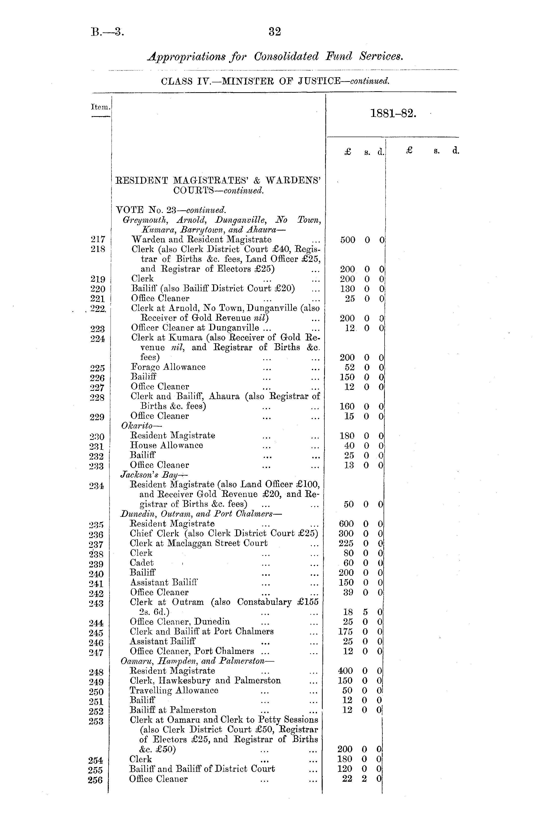 Item. 18. 1-82. £ s. d. £ s. RESIDENT MAGISTRATES' & WARDENS' COURTS — continued. 217 218 219 220 221 222. 223 224 225 226 227 228 229 230 231 232 233 234 VOTE No. 23— continued. Greymouth, Arnold, Dunganville, No Town, Kumar a, Barrytown, and Ahaura — Warden and Resident Magistrate Clerk (also Clerk District Court £40, Registrar of Births &c. fees, Land Officer £25, and Registrar of Electors £25) Clerk Bailiff (also Bailiff District Court £20) Office Cleaner Clerk at Arnold, No Town, Dunganville (also Receiver of Gold Revenue nil) Officer Cleaner at Dunganville ... Clerk at Kumara (also Receiver of Gold Revenue nil, and Registrar of Births &c. fees) Forage Allowance Bailiff Office Cleaner Clerk and Bailiff, Ahaura (also Registrar of Births &c. fees) Office Cleaner Okarito — Resident Magistrate House Allowance ... Bailiff Office Cleaner Jackson's Bay-— Resident Magistrate (also Land Officer £100, and Receiver Gold Revenue £20, and Registrar of Births &c. fees) Dunedin, Outram, and Port Chalmers —- Resident Magistrate Chief Clerk (also Clerk District Court £25) Clerk at Maclaggan Street Court Clerk Cadet i Bailiff Assistant Bailiff Office Cleaner Clerk at Outram (also Constabulary £155 2s. 6d.) Office Cleaner, Dunedin Clerk and Bailiff at Port Chalmers Assistant Bailiff Office Cleaner, Port Chalmers ... Oamaru, Hampden, and Palmerston — Resident Magistrate Clerk, Hawkesbury and Palmerston Travelling Allowance Bailiff Bailiff at Palmerston Clerk at Oamaru and Clerk to Petty Sessions (also Clerk District Court £50, Registrar of Electors £25, and Registrar of Births &c. £50) Clerk Bailiff and Bailiff of District Court Office Cleaner 500 200 200 130 25 200 12 200 52 150 12 160 15 180 40 25 13 50 0 0 0 0 0 0 0 0 0 0 0 0 0 0 0 0 0 0 0 0 0 0 0 0 0 0 0 0 0 0 0 0 0 0 0 0 235 236 237 2'38 239 240 241 242 243 600 300 225 80 60 200 150 39 0 0 0 0 0 0 0 0 0 0 0 0 0 0 0 0 244 245 246 247 18 25 175 25 12 5 0 0 0 0 0 0 0 0 0 248 249 250 251 252 253 400 150 50 12 12 0 0 0 0 0 0 0 0 0 0 200 180 120 22 0 0 0 2 0 0 0 0 •54 155 156