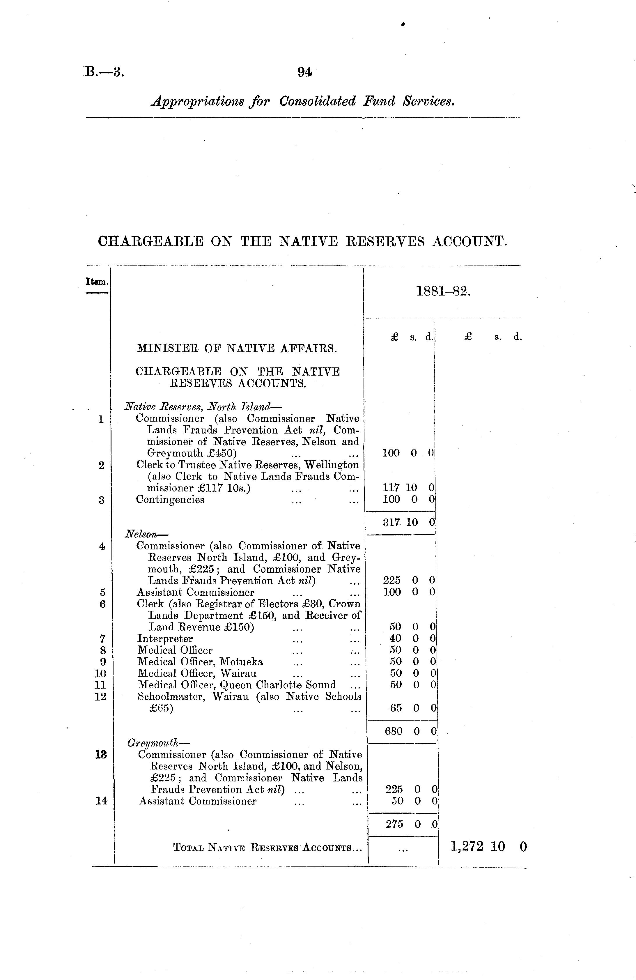 Item. 18. 1-82. £ s. d. £ s. d. MINISTER OF NATIVE AFFAIRS. CHARGEABLE ON THE NATIVE RESERVES ACCOUNTS. Native Beserves, North Island — Commissioner (also Commissioner Native Lands Frauds Prevention Act nil, Commissioner of Native Reserves, Nelson and Greymouth £450) Clerk to Trustee Native Reserves, Wellington (also Clerk to Native Lands Frauds Commissioner £117 10s.) ... Contingencies 100 0 0 117 10 100 0 0 0 5 6 Nelson — Commissioner (also Commissioner of Native Reserves North Island, £100, and Greymouth, £225; and Commissioner Native Lands Frauds Prevention Act niT) Assistant Commissioner Clerk (also Registrar of Electors £30, Crown Lands Department £150, and Receiver of Land Revenue £150) Interpreter Medical Officer Medical Officer, Motueka Medical Officer, Wairau Medical Officer, Queen Charlotte Sound Schoolmaster, Wairau (also Native Schools £05) 317 10 225 100 50 40 50 50 50 50 0 0 0 0 0 0 0 0 0] ° 0 0 0 0 0 0 7 8 9 10 11 12 65 0 0 Greymouth —■ Commissioner (also Commissioner of Native Reserves North Island, £100, and Nelson, £225; and Commissioner Native Lands Frauds Prevention Act nil) ... Assistant Commissioner 680 0 o 13 225 50 0 0 0 0 14 i 275 0 o Total Native Reserves Accounts... 1,272 10