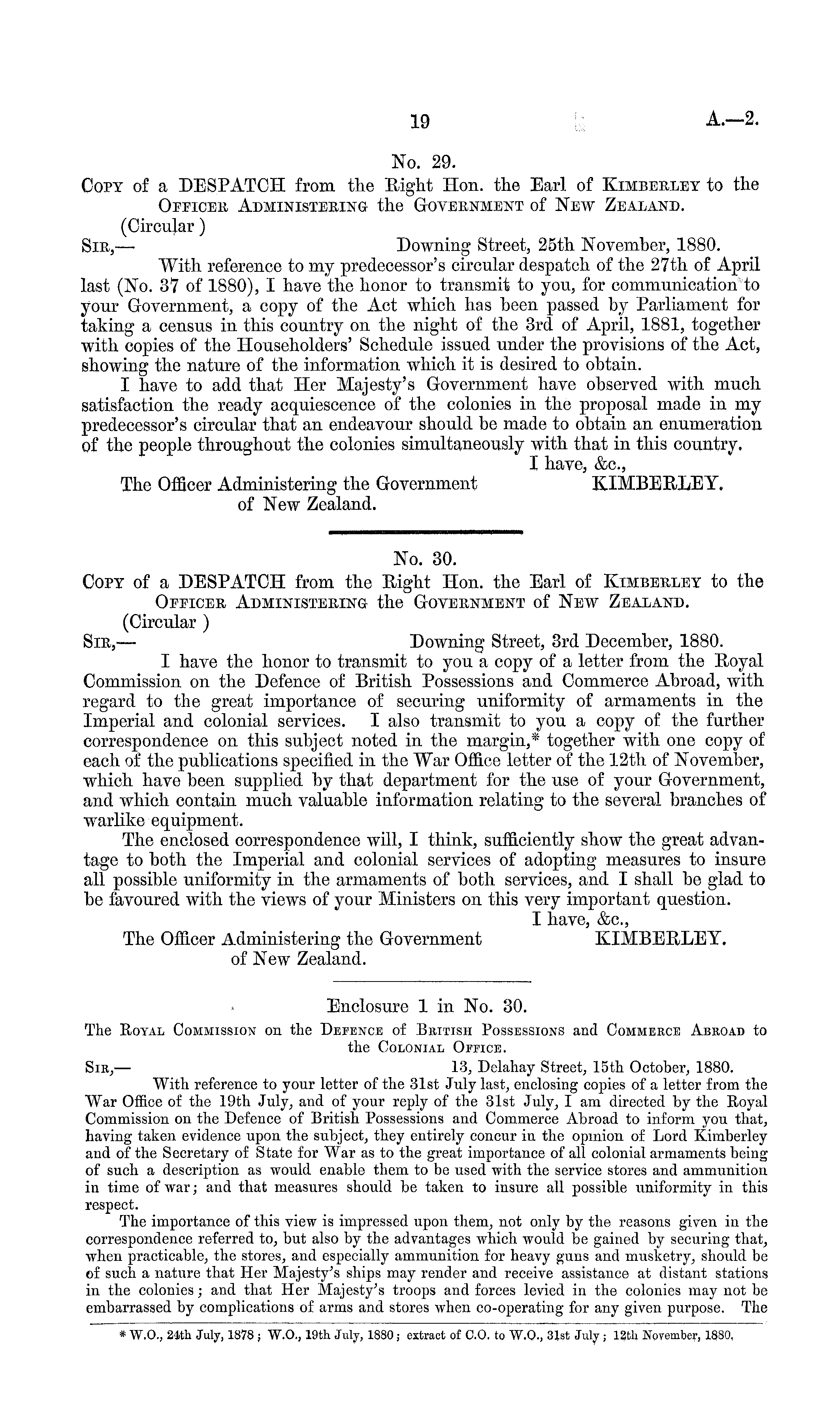No. 30. Copt of a DESPATCH from the Right Hon. the Earl of Kimberley to the Officer Administering the Government of New Zealand. (Circular ) Sir, — Downing Street, 3rd December, 1880. I have the honor to transmit to you a copy of a letter from the Royal Commission on the Defence of British Possessions and Commerce Abroad, with regard to the great importance of securing uniformity of armaments in the Imperial and colonial services. I also transmit to you a copy of the further correspondence on this subject noted in the margin,* together with one copy of each of the publications specified in the War Office letter of the 12th of November, which have been supplied by that department for the use of your Government, and which contain much valuable information relating to the several branches of warlike equipment. The enclosed correspondence will, I think, sufficiently show the great advantage to both the Imperial and colonial services of adopting measures to insure all possible uniformity in the armaments of both services, and I shall be glad to be favoured with the views of your Ministers on this very important question. I have, &c, The Officer Administering the Government KIMBERLEY. of New Zealand.