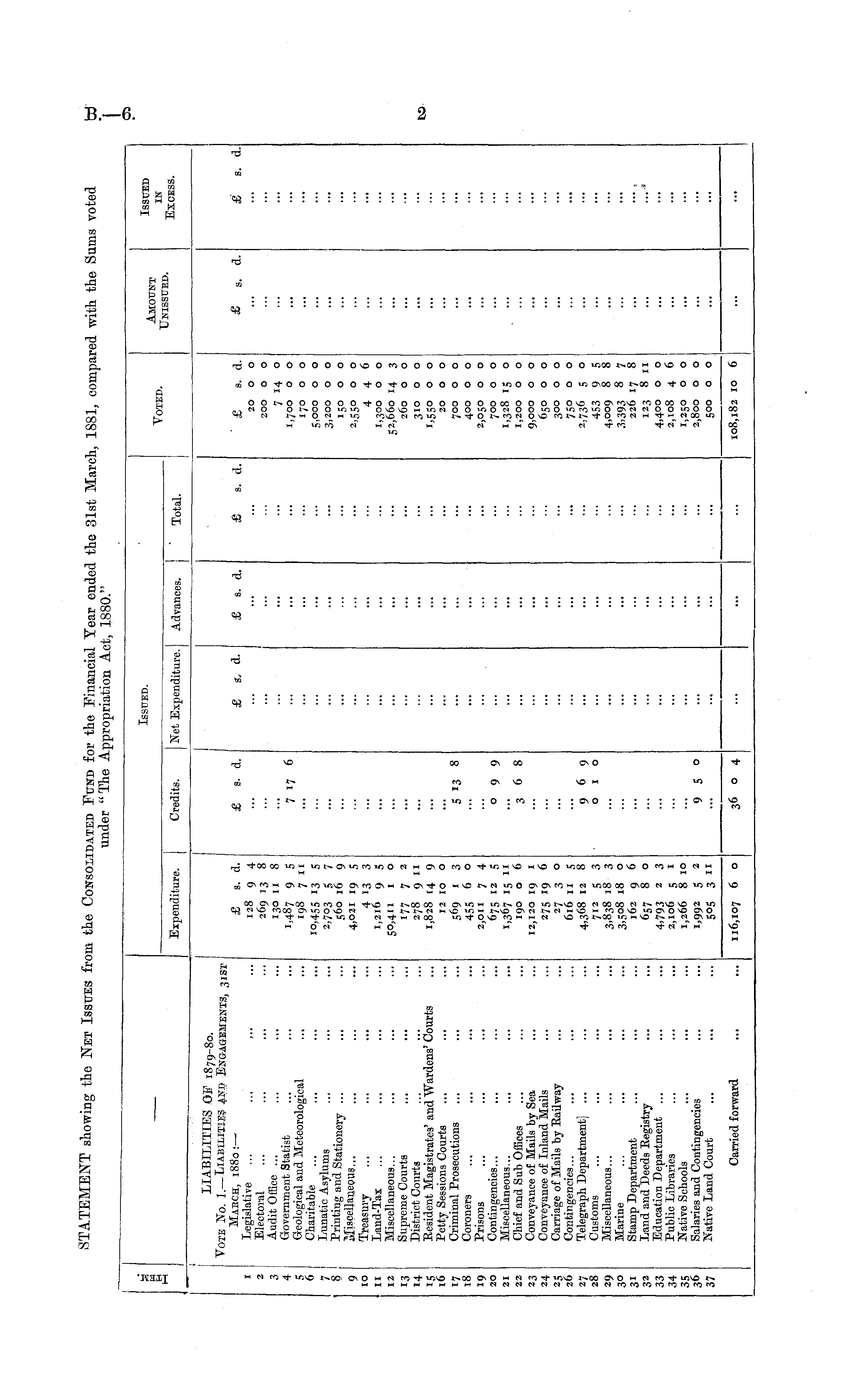 H Issued. Amount Unissued. Issued in Excess. Voted. Expenditure. Credits. Net Expenditure. Advances. Total. 1 2 3 4 S 6 7 9 10 12 13 >_ 16 18 20 LIABILITIES OF 1879-80. Vote No. 1.—Liabilities 4.NB Engagements, 31ST Mabch, 1880 :— Legislative ... ... ,., Electoral Audit Office ... Government Statist Geoiogical and Meteorological Charitable Lunatic Asylums Printing and Stationery ... Miscellaneous,,, Treasury Land-Tax Miscellaneous... Supreme Courts District Courts Resident Magistrates' and Wardens' Courts Petty Sessions Courts Criminal Prosecutions Coroners Prisons Contingencies... Miscellaneous... Chief and Sub Offices Conveyance of Mails by Sea Conveyance of Inland Mails Carriage of Mails by Railway Contingencies... Telegraph Department] ... Customs Miscellaneous... Marine Stamp Department Land and Deeds Registry Education Department Public Libraries Native Schools Salaries and Contingencies Native Land Court ... ... £ s. d. 128 9 4 269 13 8 130 11 8 1.487 9 5 198 7 11 IO>455 13 5 2,703 5 7 560 16 9 4,021 19 5 4 13 3 1,216 9 5 50,411 1 o 177 7 2 278 9 11 1,828 14 9 12 10 o 56 9 1 3 455 6 ° 2,011 7 4 675 I2 5 1.367 15 « 190 o 6 12,120 19 1 275 19 6 27 3 o 616 11 5 4.368 12 8 712 5 3 3,838 18 3 3,508 18 o 162 9 6 657 8 o 4,793 2 3 2,106 5 1 1,266 8 10 1,992 5 2 50S 3 " £ s. d. 7 17 6 S =3 8 £ e. a. £ s. d. £ s. d. £ s. d. 20 o o 200 o o 7 14 o 1,700 o o 170 o o 5,000 o o 3,200 o o 150 o o 2,550 o o 446 1,300 o o 52,660 14 3 260 o o 310 o o 1,550 o o 20 O O 700 o o 400 o o 2,050 o o 700 o o 1,328 15 o 1,200 O O 9,000 o o 650 o o 300 o o 750 o o 453 9 5 4,009 8 8 3,393 8 7 226 17 8 123 8 11 4,400 o o 2,108 4 6 1,250 o o 2,800 o o 500 o o £ s. d. £ s. d. 099 21 22 23 26 27 28 "3 6 8 969 010 29 3° 32 34 35 36 37 9 5° Carried forward 116,107 6 o 36 o 4 108,182 10 6