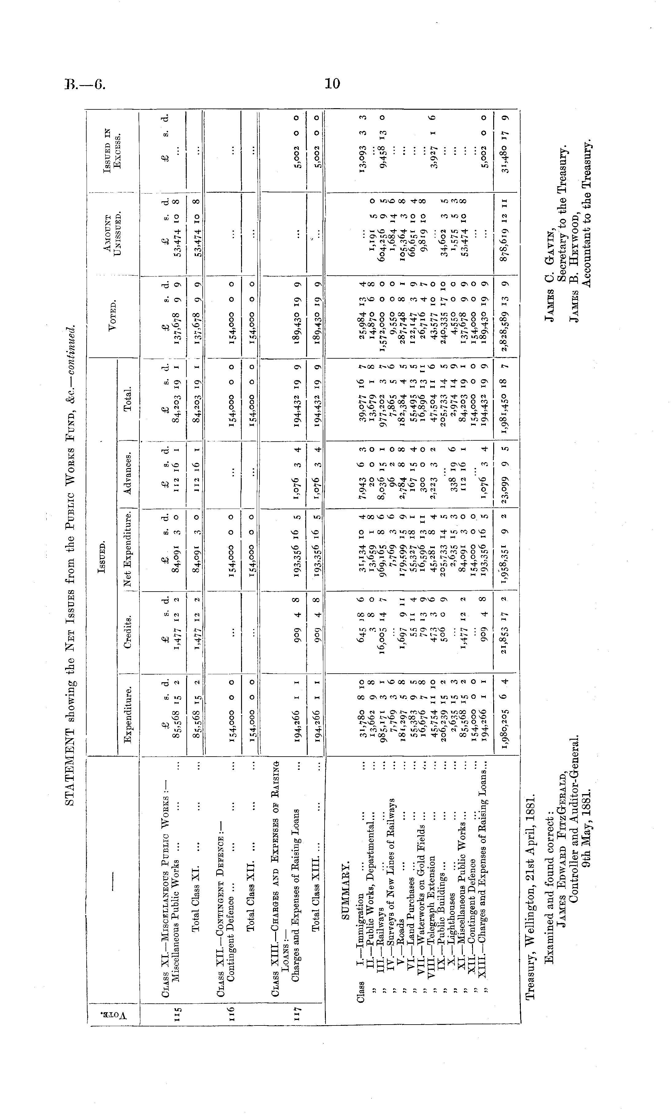 Treasury, "Wellington, 21st April, 1881. Examined and found correct: James C. Gavin, James Edwaed FitzGeeald, Secretary to the Treasury. Controller and Auditor-General. James B. Hevwood, 9th May, 1881. Accountant to the Treasury.