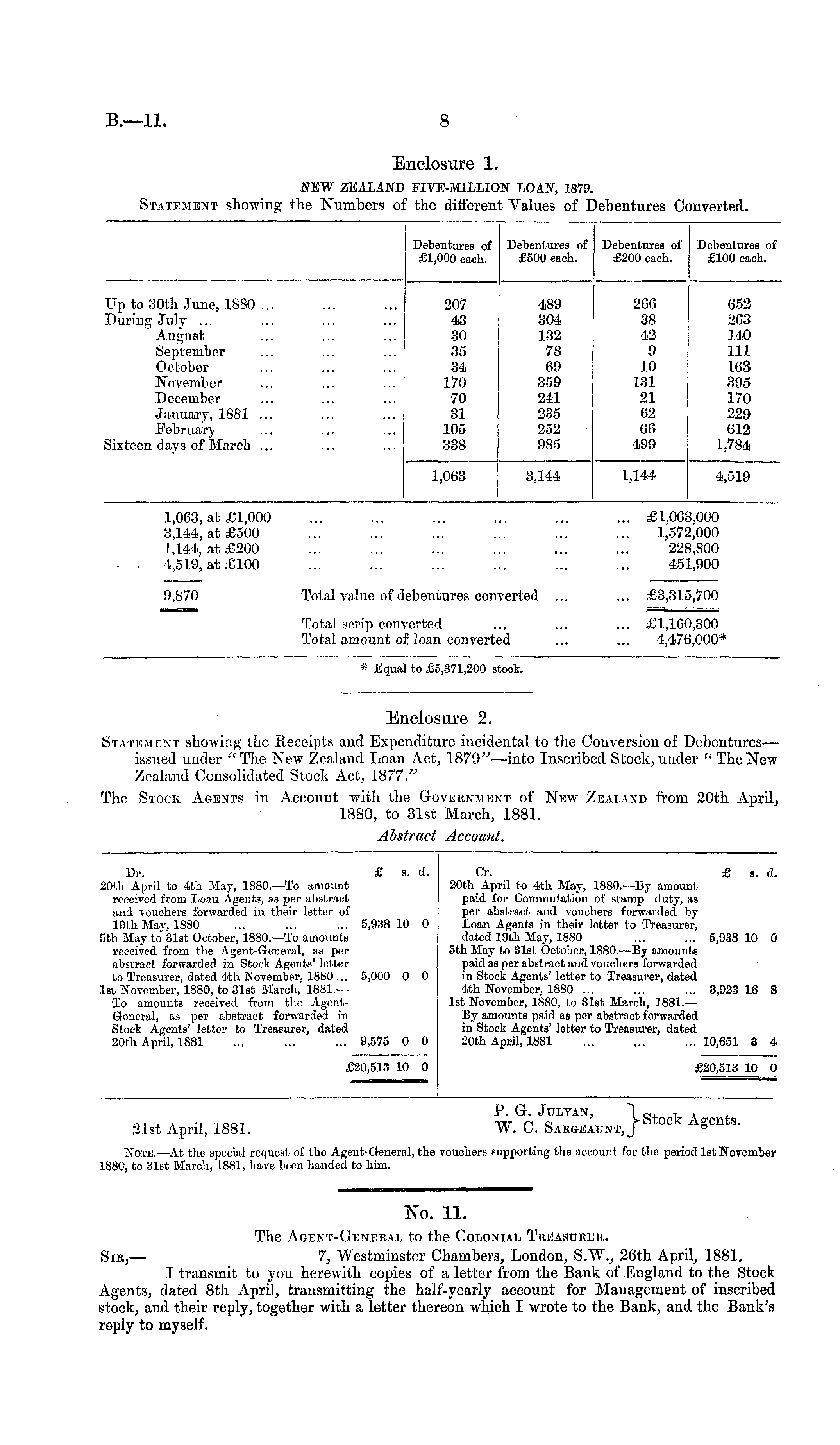 No. 11. The Agent-General to the Colonial Treasurer, Sir, — 7, "Westminster Chambers, London, S.W., 26th April, 1881. I transmit to you herewith copies of a letter from the Bank of England to the Stock Agents, dated Bth April, transmitting the half-yearly account for Management of inscribed stock, and their reply, together with a letter thereon which I wrote to the Bank, and the Bank's reply to myself.
