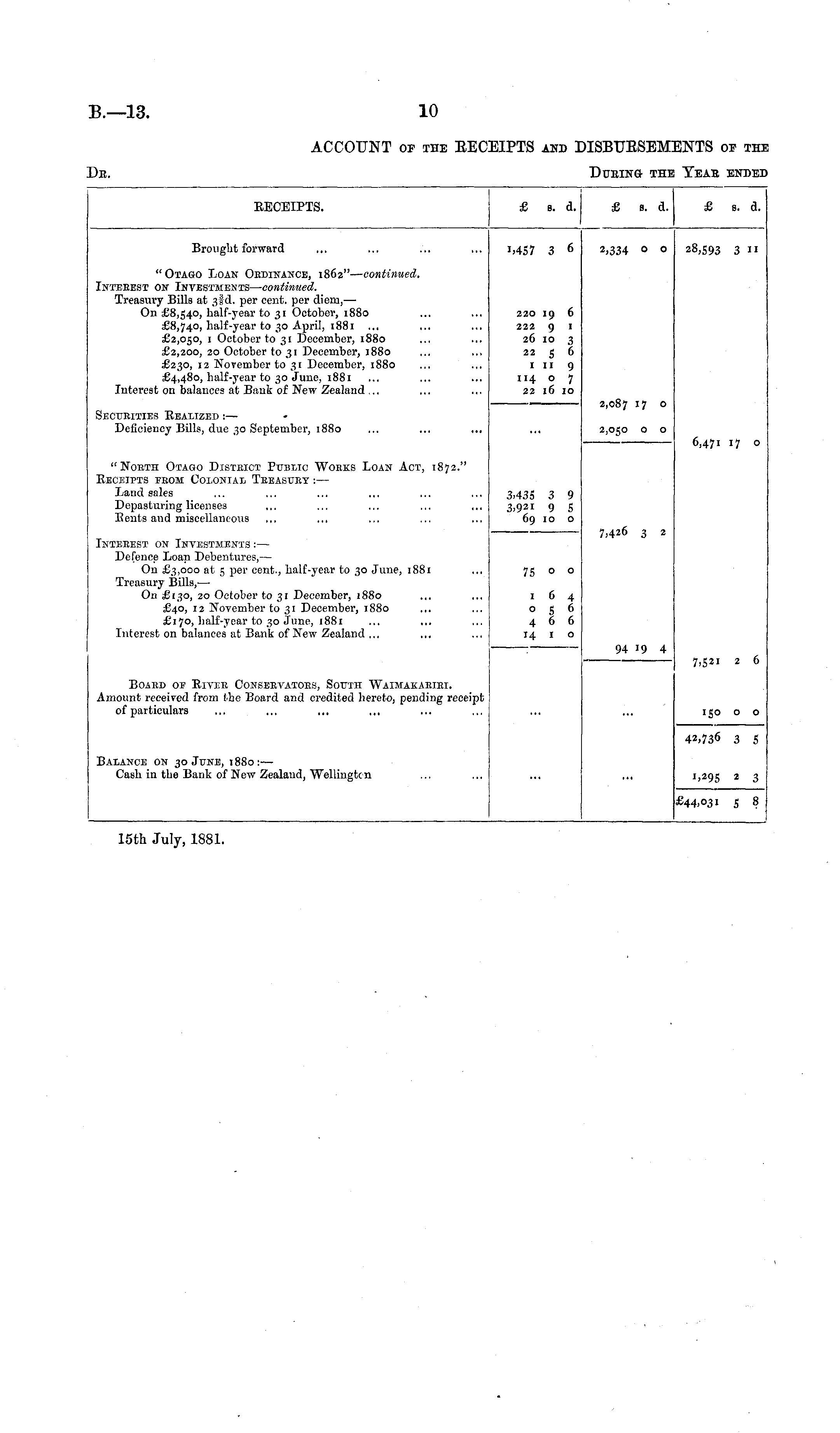 De. UEING THE EAE ENDE RECEIPTS. £ s. d. £ s. d. £ s. d. Brought forward I.4S7 3 6 2,334 ° ° 28,593 3 " "Otago Loan Obdinance, 1862" — continued. Interest on Investments — continued. Treasury Bills at 3!d. per cent, per diem, — On £8,540, half-year to 31 October, 1880 £8,740, half-year to 30 April, 1881 £2,050, 1 October to 31 December, 1880 £2,200, 20 October to 31 December, 1880 £230, 12 November to 31 December, 1880 £4,480, half-year to 30 June, 1881 Interest on balances at Bank of New Zealand 220 19 6 222 9 1 26 10 3 22 s 6 in 9 114 o 7 22 16 10 Securities Realized : — Deficiency Bills, due 30 September, 1880 2,087 l1 ° 2,050 o o 6,471 17 o "Nokth Otaoo Disteict Public Works Loan Act, 1872." Receipts from Colonial Teeasuet : — Land sales Depasturing licenses Bents and miscellaneous 3,435 3 9 3.921 9 5 69 10 o Interest on Investments : — Defence Loan Debentures, — On £3,000 at 5 per cent-, half-year to 30 June, 1881 Treasury Bills, — On £130, 20 October to 31 December, 1880 £40, 12 November to 31 December, 1880 £170, half-year to 30 June, 1881 Interest on balances at Bank of New Zealand ... 7.426 3 2 75 o o 164 056 466 14 1 o 94 19 4 BOARD OS RlVEE CoNSEETATOES, SOUTH WAIMAKAEIEI. Amount received from the Board and credited hereto, pending receipt of particulars 7,521 2 6 150 o o Balance on 30 June, 1880: — Cash in the Bank of New Zealand, Wellington 42.736 3 5 I.29S 2 3 £44,031 5 8