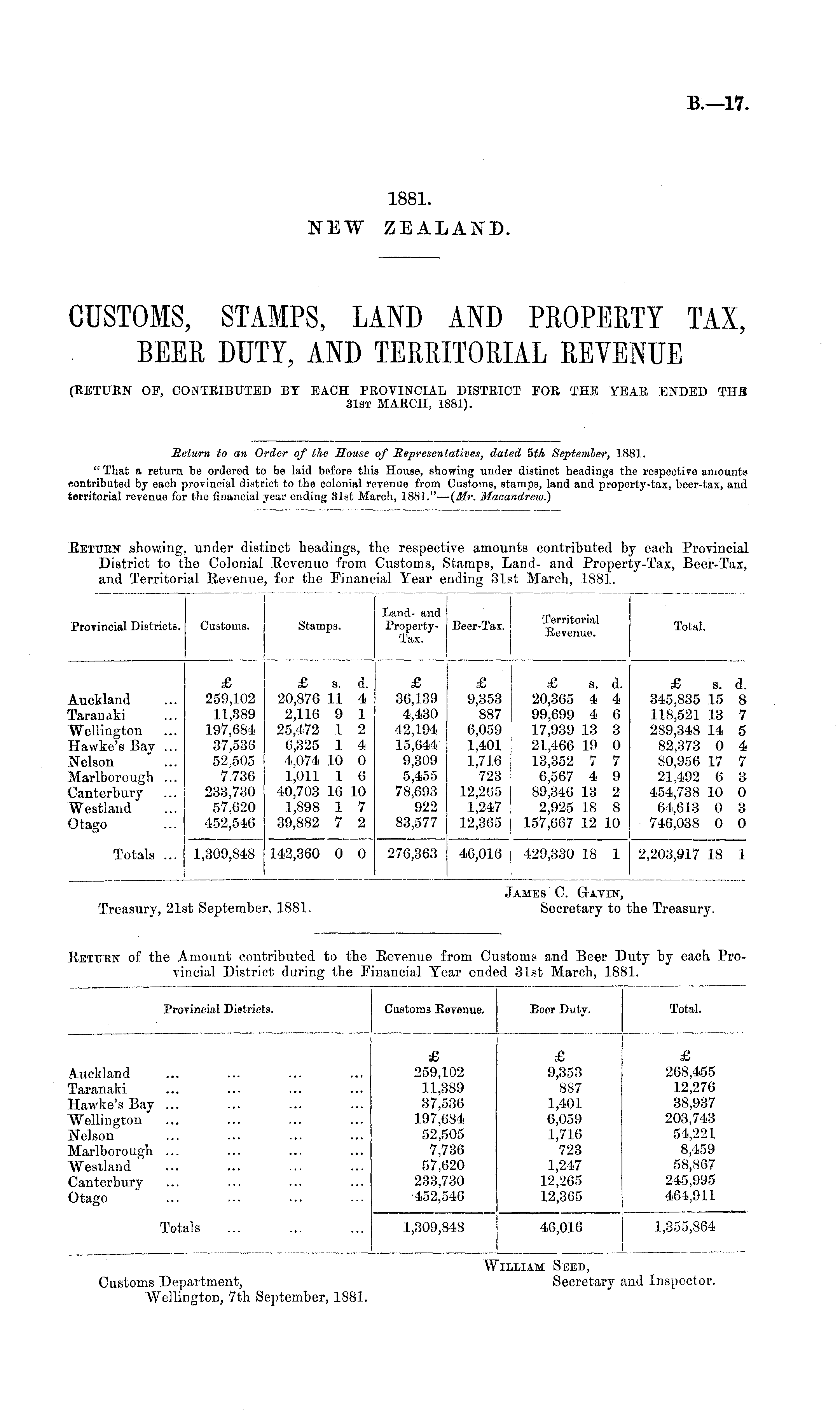 Return to an Order of the Souse of Representatives, dated sth September, 1881. " That a return be ordered to be laid before this House, showing under distinct headings the respective amounts contributed by each provincial district to the colonial revenue from Customs, stamps, land and property-tax, beev-tax, and territorial revenue for the financial year ending 31st March, 1881."— (Mr. Macandrew.)