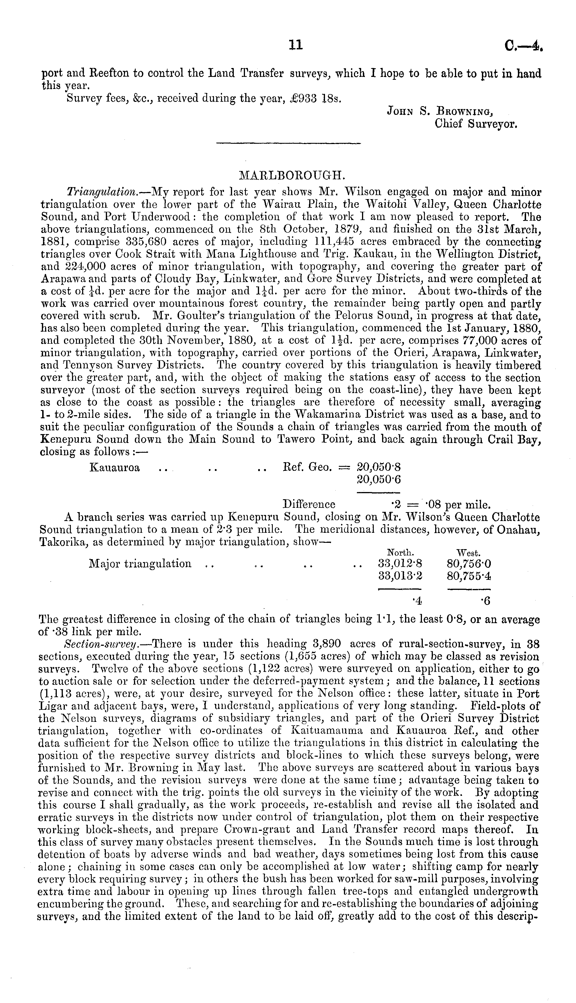 MARLBOROUGH. Tr {angulation. —My report for last year shows Mr. Wilson engaged on major and minor triangulation over the lower part of the Wairau Plain, the Waitohi Valley, Queen Charlotte Sound, and Port Underwood: the completion of that work lam now pleased to report. The above triangulations, commenced on the Bth October, 1879, and finished on the 31st March, 1881, comprise 335,680 acres of major, including 111,445 acres embraced by the connecting triangles over Cook Strait with Mana Lighthouse and Trig. Kaukau, in the Wellington District, and 224,000 acres of minor triangulation, with topography, and covering the greater part of Arapawaand parts of Cloudy Bay, Linkwater, and Gore Survey Districts, and were completed at a cost of Jd. per acre for the major and l£d. per acre for the minor. About two-thirds of the •work was carried over mountainous forest country, the remainder being partly open and partly covered with scrub. Mr. Goulter's triangulation of the Pelorus Sound, in progress at that date, has also been completed during the year. This triangulation, commenced the Ist January, 1880, and completed the 30th November, 1880, at a cost of per acre, comprises 77,000 acres of minor triangulation, with topography, carried over portions of the Orieri, Arapawa, Linkwater, and Tennyson Survey Districts. The country covered by this triangulation is heavily timbered over the greater part, and, with the object of making the stations easy of access to the section surveyor (most of the section surveys required being on the coast-line), they have been kept as close to the coast as possible : the triangles are therefore of necessity small, averaging 1- to 2-mile sides. The side of a triangle in the Wakamarina District was used as a base, and to suit the peculiar configuration of the Sounds a chain of triangles was carried from the mouth of Kenepuru Sound down the Main Sound to Tawero Point, and back again through Crail Bay, closing as follows :— Kauauroa .. .. .. Ref. Geo. = 20,050-8 20,050-6 Difference "2 = '08 per mile. A branch series was carried up Kenepuru Sound, closing on Mr. Wilson's Queen Charlotte Sound triangulation to a mean of 2"3 per mile. The meridional distances, however, of Onahau, Takorika, as determined by major triangulation, show— North. West. Major triangulation .. .. .. .. 33,012-8 80,756-0 33,013-2 80,755-4 ■4 -6 The greatest difference in closing of the chain of triangles being I*l, the least 0 - 8, or an average of -38 link per mile. Section-survey. —There is under this heading 3,890 acres of rural-section-survey, in 38 sections, executed during the year, 15 sections (1,655 acres) of which may be classed as revision surveys. Twelve of the above sections (1,122 acres) were surveyed on application, either to go to auction sale or for selection under the deferred-payment system ; and the balance, 11 sections (1,113 acres), were, at your desire, surveyed for the Nelson office: these latter, situate in Port Ligar and adjacent bays, were, I understand, applications of very long standing. Field-plots of the Nelson surveys, diagrams of subsidiary triangles, and part of the Orieri Survey District triangulation, together with co-ordinates of Kaituamauma and Kauauroa Ref., and other data sufficient for the Nelson office to utilize the triangulations in this district in calculating the position of the respective survey districts and block-lines to which these surveys belong, were furnished to Mr. Browning in May last. The above surveys are scattered about in various bays of the Sounds, and the revision surveys were done at the same time; advantage being taken to revise and connect with the trig, points the old surveys in the vicinity of the work. By adopting this course I shall gradually, as the work proceeds, re-establish and revise all the isolated and erratic surveys in the districts now under control of triangulation, plot them on their respective working block-sheets, and prepare Crown-grant and Land Transfer record maps thereof. In this class of survey many obstacles present themselves. In the Sounds much time is lost through detention of boats by adverse winds and bad weather, days sometimes being lost from this cause alone; chaining in some cases can only be accomplished at low water; shifting camp for nearly every block requiring survey; in others the bush has been worked for saw-mill purposes, involving extra time and labour in opening up lines through fallen tree-tops and entangled undergrowth encumbering the ground. These, and searching for and re-establishing the boundaries of adjoining surveys, and the limited extent of the land to be laid off, greatly add to the cost of this deserip-
