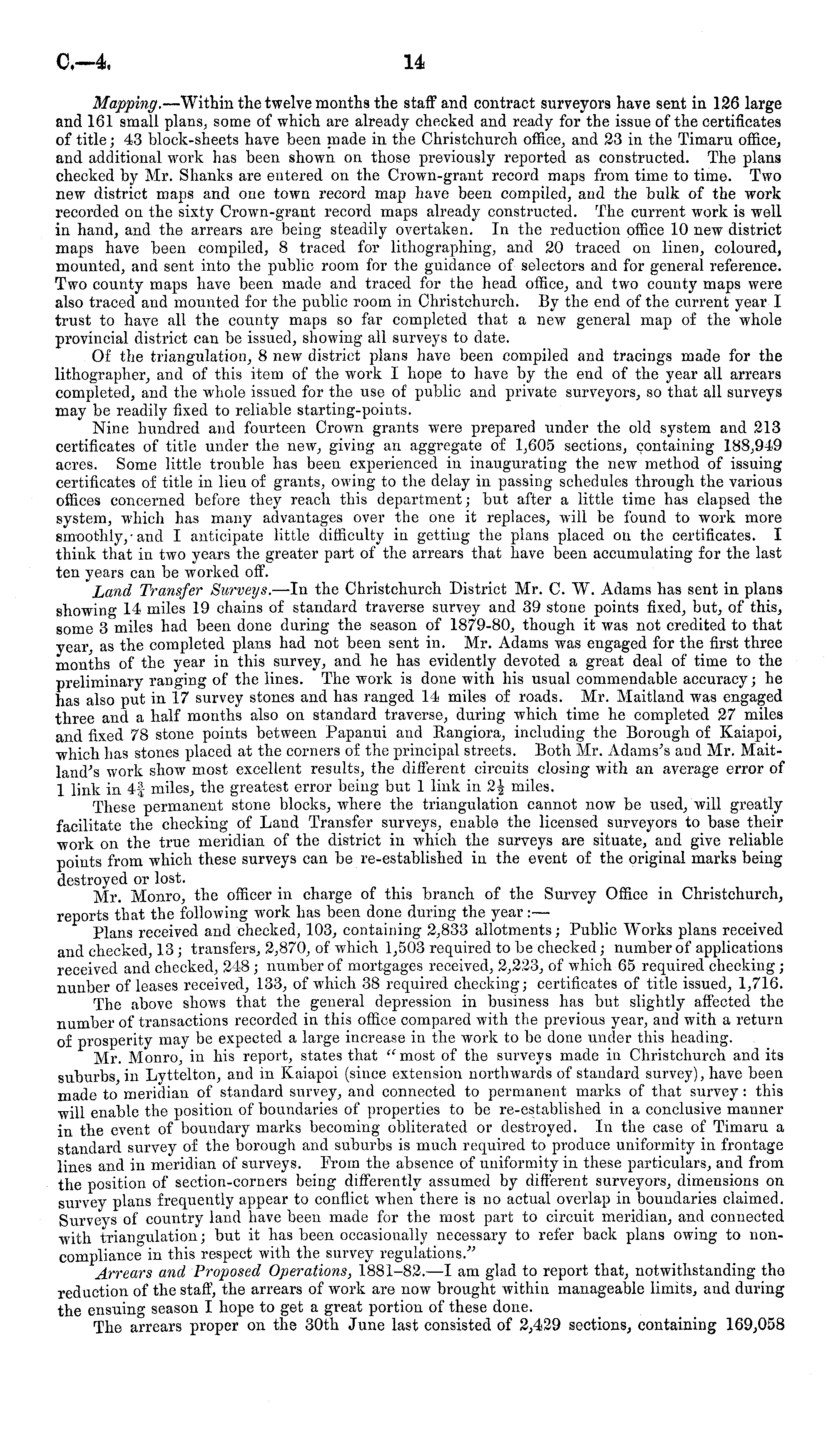 Mapping. —Within the twelve months the staff and contract surveyors have sent in 126 large and 161 small plans, some of which are already checked and ready for the issue of the certificates of title; 43 block-sheets have been made in the Christchurch office, and 23 in the Timaru office, and additional work has been shown on those previously reported as constructed. The plans checked by Mr. Shanks are entered on the Crown-grant record maps from time to time. Two new district maps and one town record map have been compiled, and the bulk of the work recorded on the sixty Crown-grant record maps already constructed. The current work is well in hand, and the arrears are being steadily overtaken. In the reduction office 10 new district maps have been compiled, 8 traced for lithographing, and 20 traced on linen, coloured, mounted, and sent into the public room for the guidance of selectors and for general reference. Two county maps have been made and traced for the head office, and two county maps were also traced and mounted for the public room in Christchurch. By the end of the current year I trust to have all the county maps so far completed that a new general map of the whole provincial district can be issued, showing all surveys to date. Of the trianguiation, 8 new district plans have been compiled and tracings made for the lithographer, and of this item of the work I hope to have by the end of the year all arrears completed, and the whole issued for the use of public and private surveyors, so that all surveys may be readily fixed to reliable starting-points. Nine hundred and fourteen Crown grants were prepared under the old system and 213 certificates of title under the new, giving an aggregate of 1,605 sections, containing 188,949 acres. Some little trouble has been experienced in inaugurating the new method of issuing certificates of title in lieu of grants, owing to the delay in passing schedules through the various offices concerned before they reach this department; but after a little time has elapsed the system, which has many advantages over the one it replaces, will be found to work more sm o othly, ■ and I anticipate little difficulty in getting the plans placed on the certificates. I think that in two years the greater part of the arrears that have been accumulating for the last ten years can be worked off. Land Transfer Surveys. —In the Christchurch District Mr. C. W. Adams has sent in plans showing 14 miles 19 chains of standard traverse survey and 39 stone points fixed, but, of this, some 3 miles had been done during the season of 1879-80, though it was not credited to that year, as the completed plans had not been sent in. Mr. Adams was engaged for the first three months of the year in this survey, and he has evidently devoted a great deal of time to the preliminary ranging of the lines. The work is done with his usual commendable accuracy; he has also put in 17 survey stones and has ranged 14 miles of roads. Mr. Maitland was engaged three and a half months also on standard traverse, during which time he completed 27 miles and fixed 78 stone points between Papanui and Rangiora, including the Borough of Kaiapoi, which has stones placed at the corners of the principal streets. Both Mr. Adams's and Mr. Maitland's work show most excellent results, the different circuits closing with an average error of 1 link in 4| miles, the greatest error being but 1 link in 2^ miles. These permanent stone blocks, where the trianguiation cannot now be used, will greatly facilitate the checking of Land Transfer surveys, enable the licensed surveyors to base their work on the true meridian of the district in which the surveys are situate, and give reliable points from which these surveys can be re-established in the event of the original marks being destroyed or lost. Mr. Monro, the officer in charge of this branch of the Survey Office in Christchurch, reports that the following work has been done during the year:— Plans received and checked, 103, containing 2,833 allotments; Public Works plans received and checked, 13; transfers, 2,870, of which 1,503 required to be checked; number of applications received and checked, 248; number of mortgages received, 2,223, of which 65 required checking ; nunber of leases received, 133, of which 38 required cheeking; certificates of title issued, 1,716. The above shows that the general depression in business has but slightly affected the number of transactions recorded in this office compared with the previous year, and with a return of prosperity may be expected a large increase in the work to be done under this heading. Mr. Monro, in his report, states that " most of the surveys made in Christchurch and its suburbs in Lyttelton, and in Kaiapoi (since extension northwards of standard survey), have been made to meridian of standard survey, and connected to permanent marks of that survey: this will enable the position of boundaries of properties to be re-established in a conclusive manner in the event of boundary marks becoming obliterated or destroyed. In the case of Timaru a standard survey of the borough and suburbs is much required to produce uniformity in frontage lines and in meridian of surveys. From the absence of uniformity in these particulars, and from the position of section-corners being differently assumed by different surveyors, dimensions on survey plans frequently appear to conflict when there is no actual overlap in boundaries claimed. Surveys of country land have been made for the most part to circuit meridian, and connected with trianguiation; but it has been occasionally necessary to refer back plans owing to noncompliance in this respect with the survey regulations." Arrears and Proposed Operations, 1881-82.—1 am glad to report that, notwithstanding the reduction of the staff, the arrears of work are now brought within manageable limits, and during the ensuing season I hope to get a great portion of these done. The arrears prop