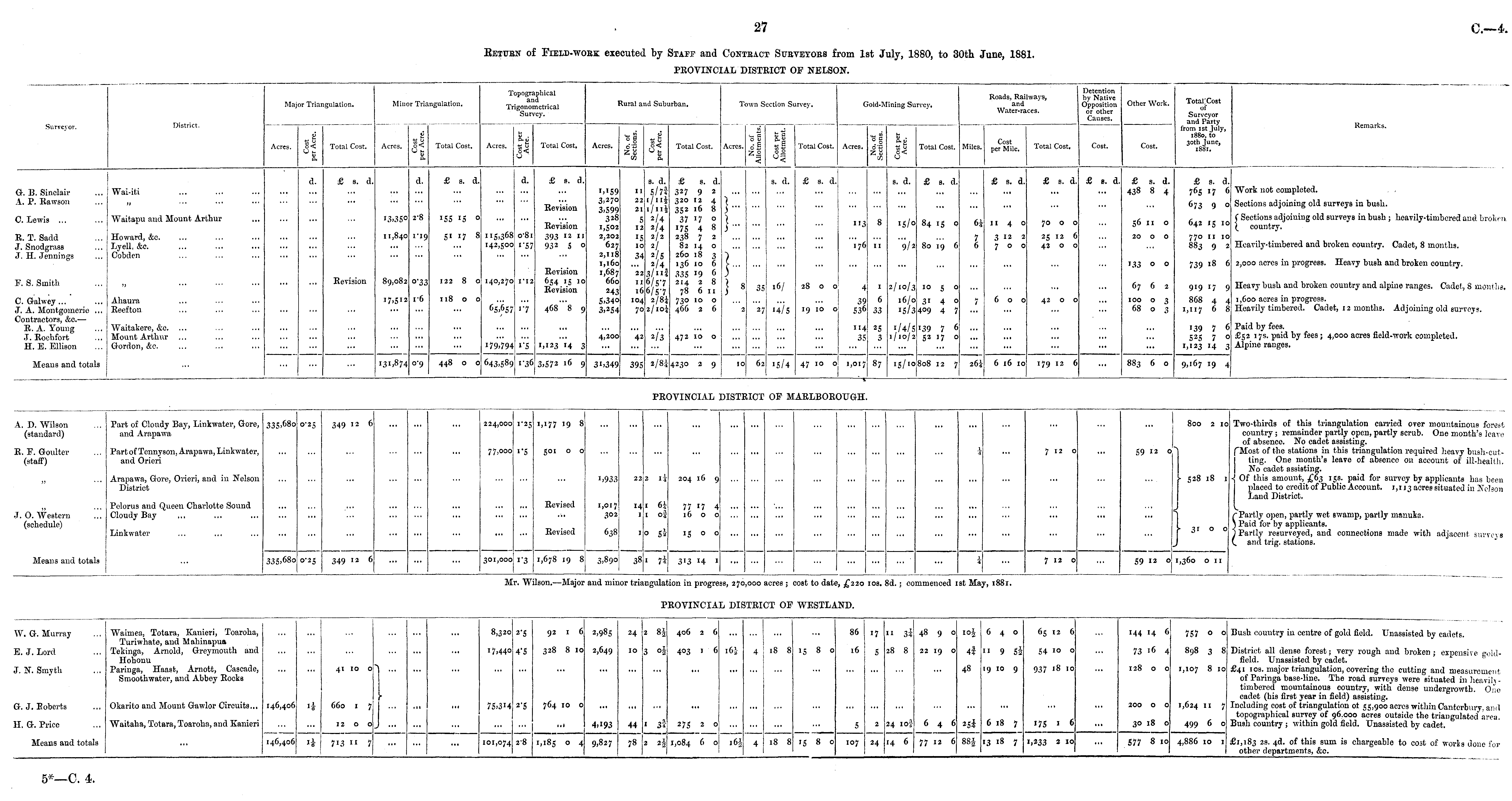Return of Field-work executed by Staff and Contract Surveyors from 1st July, 1880, to 30th June, 1881. PROVINCIAL DISTRICT OF NELSON.