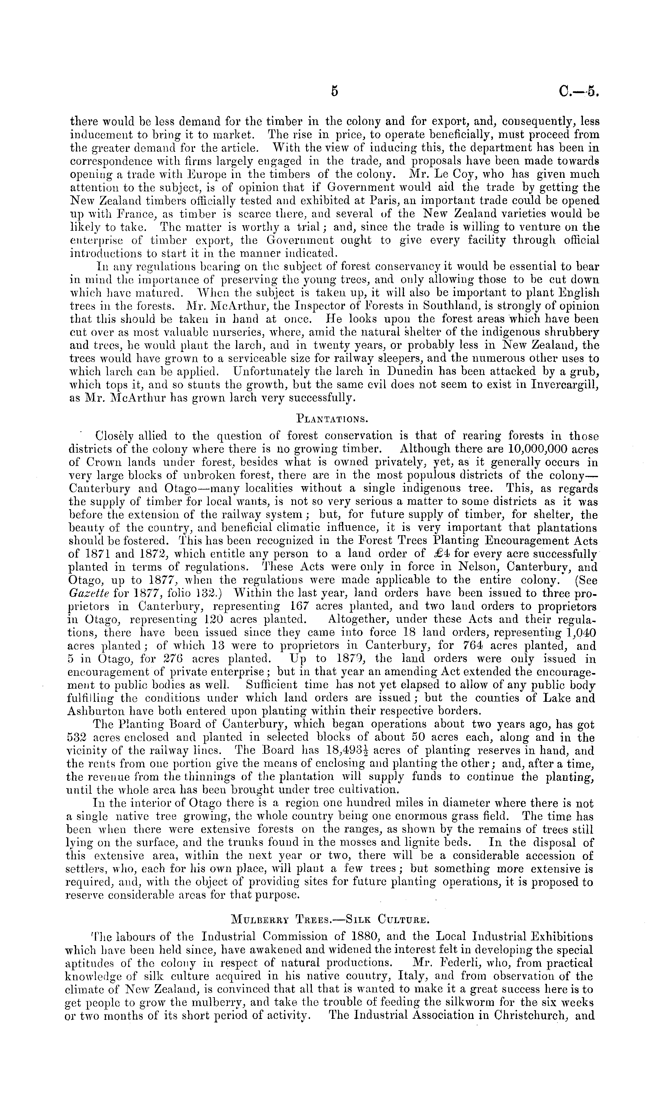 there would be less demand for the timber in the colony and for export, and, consequently, less inducement to bring it to market. The rise in price, to operate beneficially, must proceed from the greater demand for the article. With the view of inducing this, the department has been in correspondence with firms largely engaged in the trade, and proposals have been made towards opening a trade with Europe in the timbers of the colony. Mr. Le Coy, who has given much attention to the subject, is of opinion that if Government would aid the trade by getting the New Zealand timbers officially tested and exhibited at Paris, an important trade could be opened up with France, as timber is scarce there, and several of the New Zealand varieties would be likely to take. The matter is worthy a trial; and, since the trade is willing to venture on the enterprise of timber export, the Government ought to give every facility through official introductions to start it in the manner indicated. In any regulations bearing on the subject of forest conservancy it would be essential to boar in mind the importance of preserving the young trees, and only allowing those to be cut down which have matured. When the subject is taken up, it will also be important to plant English trees in the forests. Mr. McArthur, the Inspector of Porests in Southland, is strongly of opinion that this should be taken in hand at once. He looks upon the forest areas which have been cut over as most valuable nurseries, where, amid the natural shelter of the indigenous shrubbery and trees, he would plant the larch, and in twenty years, or probably less in New Zealand, the trees would have grown to a serviceable size for railway sleepers, and the numerous other uses to which larch can be applied. Unfortunately the larch in Dunedin has been attacked by a grub, which tops it, and so stunts the growth, but the same evil does not seem to exist in Invercargill, as Mr. McArthur has grown larch very successfully. Plantations. Closely allied to the question of forest conservation is that of rearing forests in those districts of the colony where there is no growing timber. Although there are 10,000,000 acres of Crown lands under forest, besides what is owned privately, yet, as it generally occurs in very large blocks of unbroken forest, there are in the most populous districts of the colony— Canterbury and Otago—many localities without a single indigenous tree. This, as regards the supply of timber for local wants, is not so very serious a matter to some districts as it was before the extension of the railway system ; but, for future supply of timber, for shelter, the beauty of the country, and beneficial climatic influence, it is very important that plantations should be fostered. This has been recognized in the Forest Trees Planting Encouragement Acts of 1871 and 1872, which entitle any person to a land order of £4 for every acre successfully planted in terms of regulations. These Acts were only in force in Nelson, Canterbury, and Otago, up to 1877, when the regulations were made applicable to the entire colony. (See Gazette for 1877, folio 132.) Within the last year, land orders have been issued to three proprietors in Canterbury, representing 167 acres planted, and two land orders to proprietors in Otago, representing 120 acres planted. Altogether, under these Acts and their regulations, there have been issued since they came into force 18 land orders, representing 1,040 acres planted; of which 13 were to proprietors in Canterbury, for 764 acres planted, and sin Otago, for 276 acres planted. Up to 1879, the land orders were only issued in encouragement of private enterprise ; but in that year an amending Act extended the encouragement to public bodies as well. Sufficient time has not yet elapsed to allow of any public body fulfilling the conditions under which land orders are issued; but the counties of Lake and Ashburton have both entered upon planting within their respective borders. The Planting Board of Canterbury, which began operations about two years ago, has got 532 acres enclosed and planted in selected blocks of about 50 acres each, along and in the vicinity of the railway lines. The Board has 18,493^ acres of planting reserves in hand, and the rents from one portion give the means of enclosiug and planting the other; and, after a time, the revenue from the thinnings of the plantation will supply funds to continue the planting, until the whole area has been brought under tree cultivation. In the interior of Otago there is a region one hundred miles in diameter where there is not a single native tree growing, the whole country being one enormous grass field. The time has been when there were extensive forests on the ranges, as shown by the remains of trees still lying on the surface, and the trunks found in the mosses and lignite beds. In the disposal of this extensive area, within the next year or two, there w rill be a considerable accession of settlers, who, each for his own place, will plant a few trees; but something more extensive is required, and, with the object of providing sites for future planting operations, it is proposed to reserve considerable areas for that purpose. Mulberry Trees.—Silk Culture. The labours of the Industrial Commission of 1880, and the Local Industrial Exhibitions which have been held since, have awakened and w'ideued the interest felt in developing the special aptitudes of the colony in respect of natural productions. Mr. Federli, who, from practical knowledge of silk culture acquired in his native country, Italy, and from observation of the climate of New Zealand, is convinced that all that is wanted to make it a great success here is to get people to grow the mulberry, and take the trouble of feeding the silkworm for the six weeks or two months of its short period of activity. The Industrial Association in Christchurch, and