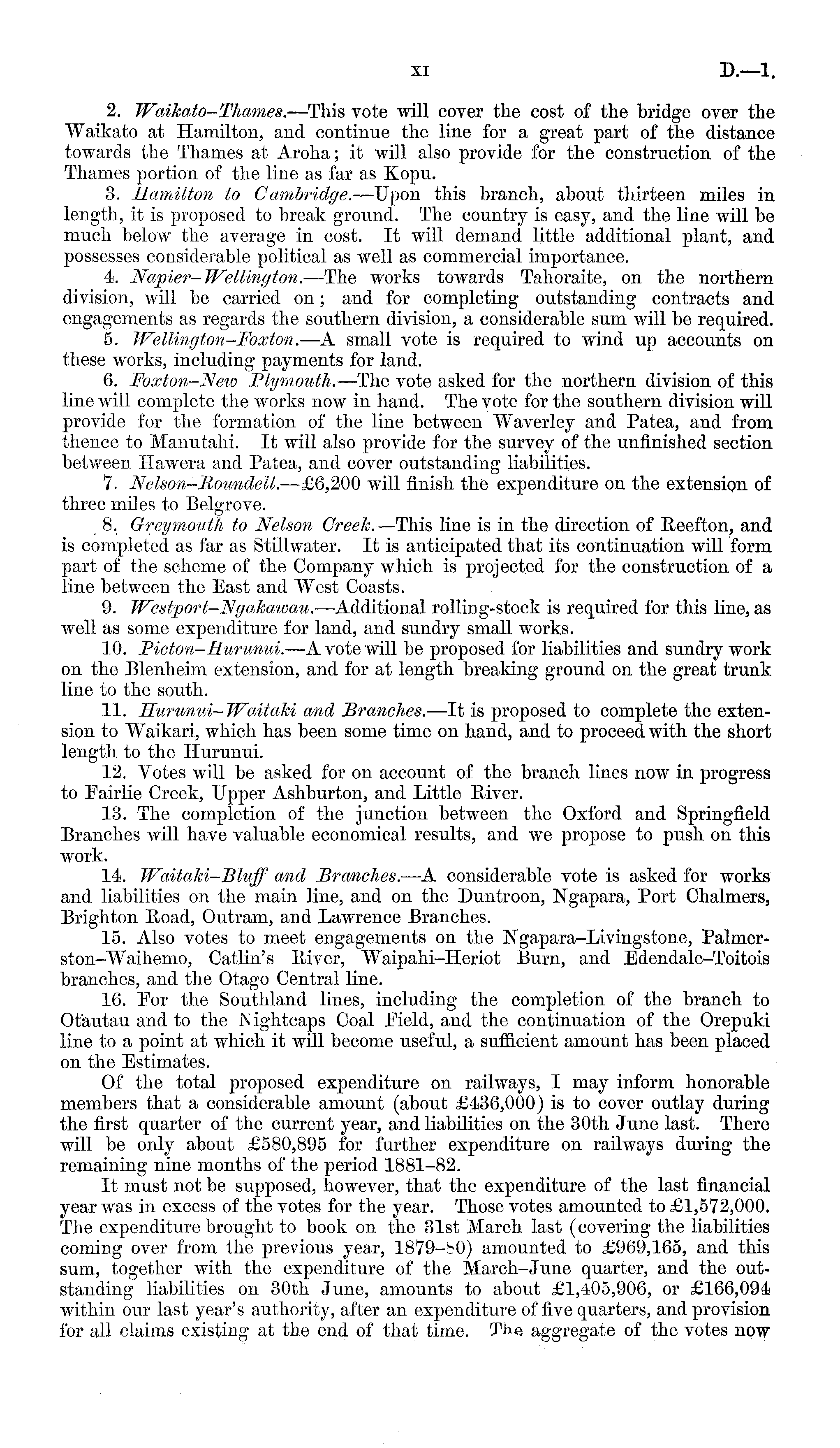 2. Waikato-Thames. —This vote will cover the cost of the bridge over the Waikato at Hamilton, and continue the line for a great part of the distance towards the Thames at Aroha; it will also provide for the construction of the Thames portion of the line as far as Kopu. 3. Hamilton to Cambridge. —Upon this branch, about thirteen miles in length, it is proposed to break ground. The country is easy, and the line will be much below the average in cost. It will demand little additional plant, and possesses considerable political as well as commercial importance. 4. Napier-Wellington. —The works towards Tahoraite, on the northern division, will be carried on; and for completing outstanding contracts and engagements as regards the southern division, a considerable sum will be required. 5. Wellington-Foxton. —A small vote is required to wind up accounts on these works, including payments for land. 6. Foxton-New Plymouth. —The vote asked for the northern division of this line will complete the works now in hand. The vote for the southern division will provide for the formation of the line between Waverley and Patea, and from thence to Manutahi. It will also provide for the survey of the unfinished section between Hawera and Patea, and cover outstanding liabilities. 7. Nelson-Boundell. —£6,2oo will finish the expenditure on the extension of three miles to Belgrove. 8. Greymouth to Nelson Creek. —This line is in the direction of Reefton, and is completed as far as Stillwater. It is anticipated that its continuation will form part of the scheme of the Company which is projected for the construction of a line between the East and West Coasts. 9. Westport-Ngakawau.— Additional rolling-stock is required for this line, as well as some expenditure for land, and sundry small works. 10. Picton-Hurunui. —A vote will be proposed for liabilities and sundry work on the Blenheim extension, and for at length breaking ground on the great trunk line to the south. 11. Hurunui- Waitaki and Branches. —lt is proposed to complete the extension to Waikari, which has been some time on hand, and to proceed with the short length to the Hurunui. 12. Votes will be asked for on account of the branch lines now in progress to Eairlie Creek, Upper Ashburton, and Little River. 13. The completion of the junction between the Oxford and Springfield Branches will have valuable economical results, and we propose to push on this work. 14. Waitaki-Bluff and Branches. —A considerable vote is asked for works and liabilities on the main line, and on the Duntroon, Ngapara, Port Chalmers, Brighton Road, Outram, and Lawrence Branches. 15. Also votes to meet engagements on the Ngapara-Livingstone, Palmer-ston-Waihemo, Catlin's River, Waipahi-Heriot Burn, and Edendale-Toitois branches, and the Otago Central line. 16. Eor the Southland lines, including the completion of the branch to Otautau and to the Nightcaps Coal Eield, and the continuation of the Orepuki line to a point at which it will become useful, a sufficient amount has been placed on the Estimates. Of the total proposed expenditure on railways, I may inform honorable members that a considerable amount (about £436,000) is to cover outlay during the first quarter of the current year, and liabilities on the 30th June last. There will be only about £580,895 for further expenditure on railways during the remaining nine months of the period 1881-82. It must not be supposed, however, that the expenditure of the last financial year was in excess of the votes for the year. Those votes amounted to £1,572,000. The expenditure brought to book on the 31st March last (covering the liabilities coming over from the previous year, 1879-bO) amounted to £969,165, and this sum, together with the expenditure of the March-June quarter, and the outstanding liabilities on 30th June, amounts to about £1,405,906, or £166,094 within our last year's authority, after an expenditure of five quarters, and provision for all claims existing at the end of that time. Tha aggregate of the votes now
