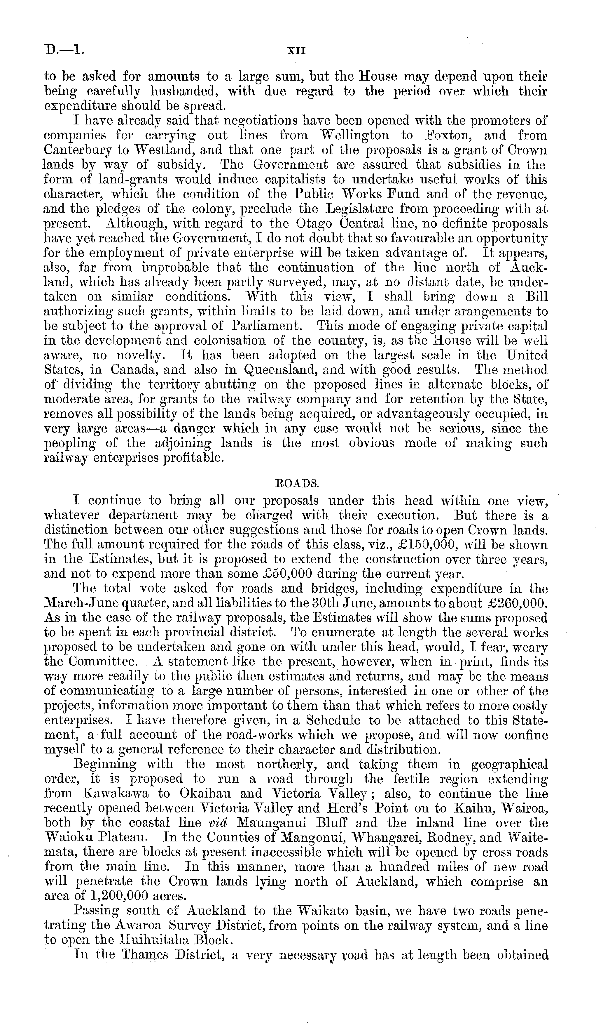 to be asked for amounts to a large sum, but the House may depend upon their being carefully husbanded, with due regard to the period over which their expenditure should be spread. I have already said that negotiations have been opened with the promoters of companies for carrying out lines from Wellington to Eoxton, and from Canterbury to Westland, and that one part of the proposals is a grant of Crown lands by way of subsidy. The Government are assured that subsidies in the form of land-grants would induce capitalists to undertake useful works of this character, which the condition of the Public Works Eund and of the revenue, and the pledges of the colony, preclude the Legislature from proceeding with at present. Although, with regard to the Otago Central line, no definite proposals have yet reached the Government, I do not doubt that so favourable an opportunity for the employment of private enterprise will be taken advantage of. It appears, also, far from improbable that the continuation of the line north of Auckland, which has already been partly surveyed, may, at no distant date, be undertaken on similar conditions. With this view, I shall bring down a Bill authorizing such grants, within limits to be laid down, and under arangements to be subject to the approval of Parliament. This mode of engaging private capital in the development and colonisation of the country, is, as the House will be well aware, no novelty. It has been adopted on the largest scale in the United States, in Canada, and also in Queensland, and with good results. The method of dividing the territory abutting on the proposed lines in alternate blocks, of moderate area, for grants to the railway company and for retention by the State, removes all possibility of the lands being acquired, or advantageously occupied, in very large areas—a danger which in any case would not be serious, since the peopling of the adjoining lands is the most obvious mode of making such railway enterprises profitable. ROADS. I continue to bring all our proposals under this head within one view, whatever department may be charged with their execution. But there is a distinction between our other suggestions and those for roads to open Crown lands. The full amount required for the roads of this class, viz., £150,000, will be shown in the Estimates, but it is proposed to extend the construction over three years, and not to expend more than some £50,000 during the current year. The total vote asked for roads and bridges, including expenditure in the March-June quarter, and all liabilities to the 30th June, amounts to about £260,000. As in the case of the railway proposals, the Estimates will show the sums proposed to be spent in each provincial district. To enumerate at length the several works proposed to be undertaken and gone on with under this head, would, I fear, weary the Committee. A statement like the present, however, when in print, finds its way more readily to the public then estimates and returns, and may be the means of communicating to a large number of persons, interested in one or other of the projects, information more important to them than that which refers to more costly enterprises. I have therefore given, in a Schedule to be attached to this Statement, a full account of the road-works which we propose, and will now confine myself to a general reference to their character and distribution. Beginning with the most northerly, and taking them in geographical order, it is proposed to run a road through the fertile region extending from Kawakawa to Okaihau and Victoria Valley; also, to continue the line recently opened between Victoria Valley and Herd's Point on to Kaihu, Wairoa, both by the coastal line via Maunganui Bluff and the inland line over the Waioku Plateau. In the Counties of Mangonui, Whangarei, Rodney, and Waitemata, there are blocks at present inaccessible which will be opened by cross roads from the main line. In this manner, more than a hundred miles of new road will penetrate the Crown lands lying north of Auckland, which comprise an area of 1,200,000 acres. Passing south of Auckland to the Waikato basin, we have two roads penetrating the Awaroa Survey District, from points on the railway system, and a line to open the Huihuitaha Block. In the Thames District, a very necessary road has at length been obtained