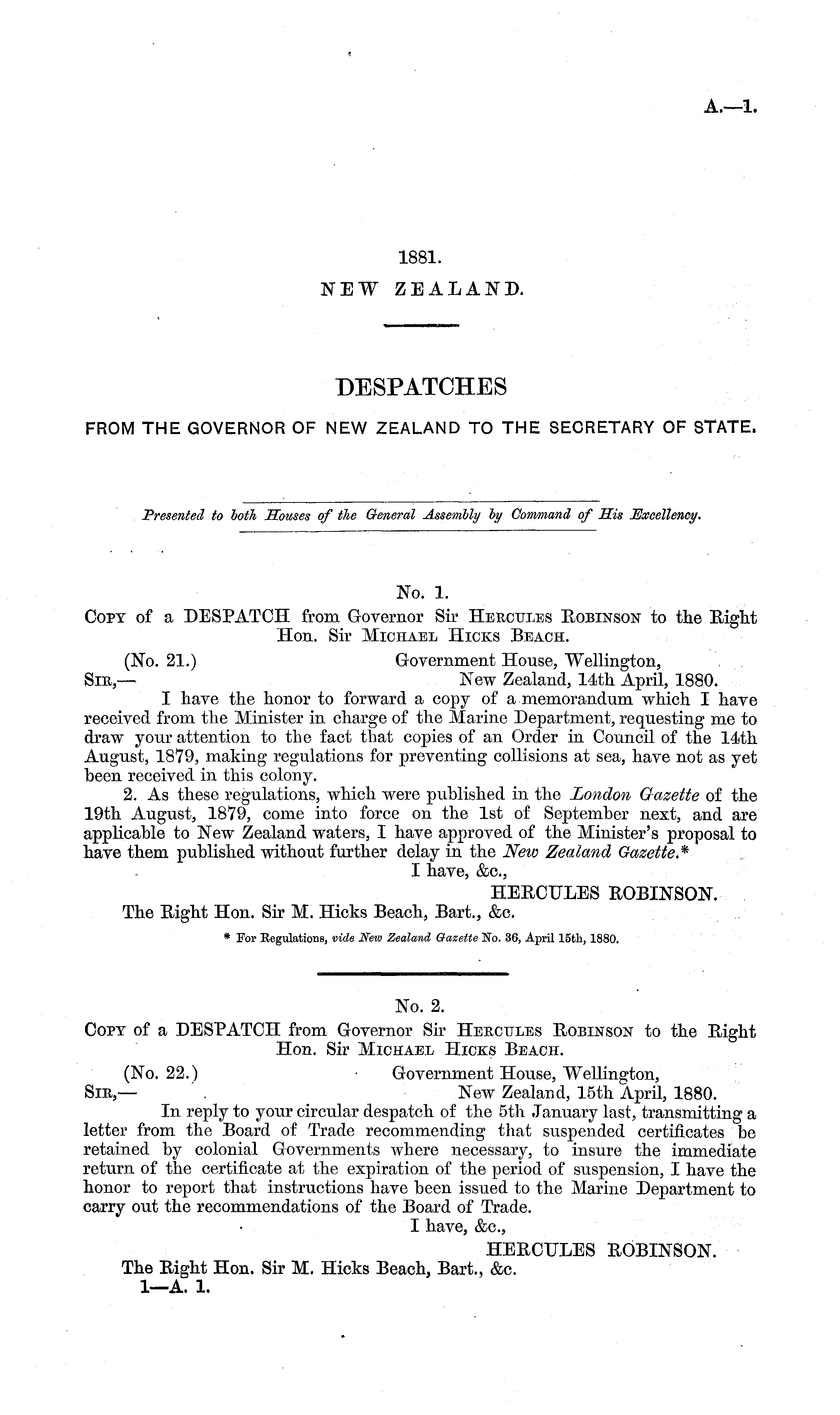 No. 1. Copy of a DESPATCH from Governor Sir Hercules Robinson to the Right Hon. Sir Michael Hicks Beach. (No. 21.) Government House, Wellington, Sir, — New Zealand, 14th April, 1880. I have the honor to forward a copy of a memorandum which I have received from the Minister in charge of the Marine Department, requesting me to draw your attention to the fact that copies of an Order in Council of the 14th August, 1879, making regulations for preventing collisions at sea, have not as yet been received in this colony. 2. As these regulations, which were published in the London Gazette of the 19th August, 1879, come into force on the Ist of September next, and are applicable to New Zealand waters, I have approved of the Minister's proposal to have them published without further delay in the New Zealand Gazette.* I have, &c, HERCULES ROBINSON. The Right Hon. Sir M. Hicks Beach, Bart., &c. * For Regulations, vide Neiv Zealand Gazette No. 36, April 15th, 1880.