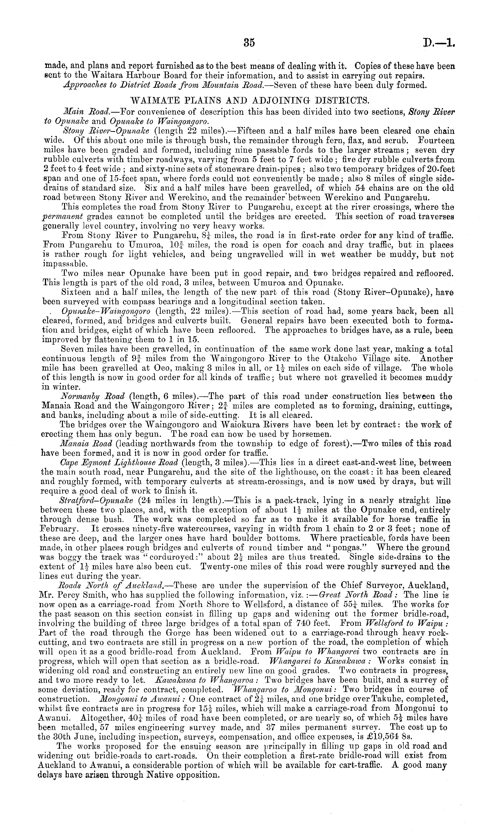 made, and plans and report furnished as to the best means of dealing with it. Copies of these have been sent to the Waitara Harbour Board for their information, and to assist in carrying out repairs. Approaches to District Roads from Mountain Road. —Seven of these have been duly formed. WAIMATE PLAINS AND ADJOINING DISTRICTS. Main Road. —For convenience of description this has been divided into two sections, Stony River to Opunake and Opunake to Waingongoro. Stony River—Opunake (length 22 miles). —Fifteen and a half miles have been cleared one chain wide. Of this about one mile is through bush, the remainder through fern, flax, and scrub. Fourteen miles have been graded and formed, including nine passable fords to the larger streams ; seven dry rubble culverts with timber roadways, varying from 5 feet to 7 feet wide ; five dry rubble culverts from 2 feet to 4 feet wide ; and sixty-nine sets of stoneware drain-pipes ; also two temporary bridges of 20-feet span and one of 15-feet span, where fords could not conveniently be made; also 8 miles of single sidedrains of standard size. Six and a half miles have been gravelled, of which 54 chains are on the old road between Stony River and Werekino, and the remainder'between Werekino and Pungarehu. This completes the road from Stony River to Pungarehu, except at the river crossings, where the permanent grades cannot be completed until the bridges are erected. This section of road traverses generally level country, involving no very heavjr works. From Stony River to Pungarehu, 83: miles, the road is in first-rate order for any kind of traffic. From Pungarehu to Umuroa, 10f miles, the road is open for coach and dray traffic, but in places is rather rough for light vehicles, and being ungravelled will in wet weather be muddy, but not impassable. Two miles near Opunake have been put in good repair, and two bridges repaired and refloored. This length is part of the old road, 3 miles, between Umuroa and Opunake. Sixteen and a half miles, the length of the new part of this road (Stony River-Opunake), have been surveyed with compass bearings and a longitudinal section taken. Oputiake-Waingongoro (length, 22 miles). —This section of road had, some years back, been all cleared, formed, and bridges and culverts built. General repairs have been executed both to formation and bridges, eight of which have been refloored. The approaches to bridges have, as a rule, been improved by flattening them to 1 in 15. Seven miles have been gravelled, in continuation of the same work done last year, making a total continuous length of 9f miles from the Waingongoro River to the Otakeho Village site. Another mile has been gravelled at Oeo, making 3 miles in all, or \\ miles on each side of village. The whole of this length is now in good order for all kinds of traffic; but where not gravelled it becomes muddy in winter. Normanby Road (length, 6 miles). —The part of this road under construction lies between the Manaia Road and the Waingongoro River; 2f miles are completed as to forming, draining, cuttings, and banks, including about a mile of side-cutting. It is all cleared. The bridges over the Waingongoro and Waiokura Rivers have been let by contract: the work of erecting them has only begun. The road can how be used by horsemen. Manaia Road (leading northwards from the township to edge of forest). —Two miles of this road have been formed, and it is now in good order for traffic. Cape Egmont Lighthouse Road (length, 3 miles). —This lies in a direct east-and-west line, between the main south road, near Pungarehu, and the site of the lighthouse, on the coast: it has been cleared and roughly formed, with temporary culverts at stream-crossings, and is now used by drays, but will require a good deal of work to finish it. Stratj"ord-Opunake (24 miles in length). —This is a pack-track, lying in a nearly straight line between these two places, and, with the exception of about \\ miles at the Opunake end, entirely through dense bush. The work was completed so far as to make it available for horse traffic in February. It crosses ninety-five watercourses, varying in width from 1 chain to 2or 3 feet; none of these are deep, and the larger ones have hard boulder bottoms. Where practicable, fords have been made, in other places rough bridges and culverts of round timber and "pongas." Where the ground was boggy the track was "corduroyed:" about 2| miles are thus treated. Single side-drains to the extent of \\ miles have also been cut. Twenty-one miles of this road were roughly surveyed and the lines cut during the year, Roads North, of Auckland. —These are under the supervision of the Chief Surveyor, Auckland, Mr. Percy Smith, who has supplied the following information, viz. : — Great North Road: The line is now open as a carriage-road from North Shore to Wellsford, a distance of 55j- miles. The works for the past season on this section consist in filling up gaps and widening out the former bridle-road, involving the building of three large bridges of a total span of 740 feet. From Wellsford to Waipu : Part of the road through the Gorge has been widened out to a carriage-road through heavy rockcutting, and two contracts are still in progress on a new portion of the road, the completion of which will open it as a good bridle-road from Auckland. From Waipu to Whango.rei two contracts are in progress, which will open that section as a bridle-road. Whangarei to Kawakawa : Works consist in widening old road and constructing an entirely new line on good grades. Two contracts in progress, and two more ready to let. Kawakawa to Whanc/aroa : Two bridges have been built, and a survey of some deviation, ready for contract, completed. Whangaroa to Mongonui: Two bridges in course of construction. Mongonui to Awanui: One contract of 2i miles, and one bridge overTakuhe, completed, whilst five contracts are in progress for 15i miles, which will make a carriage-road from Mongonui to