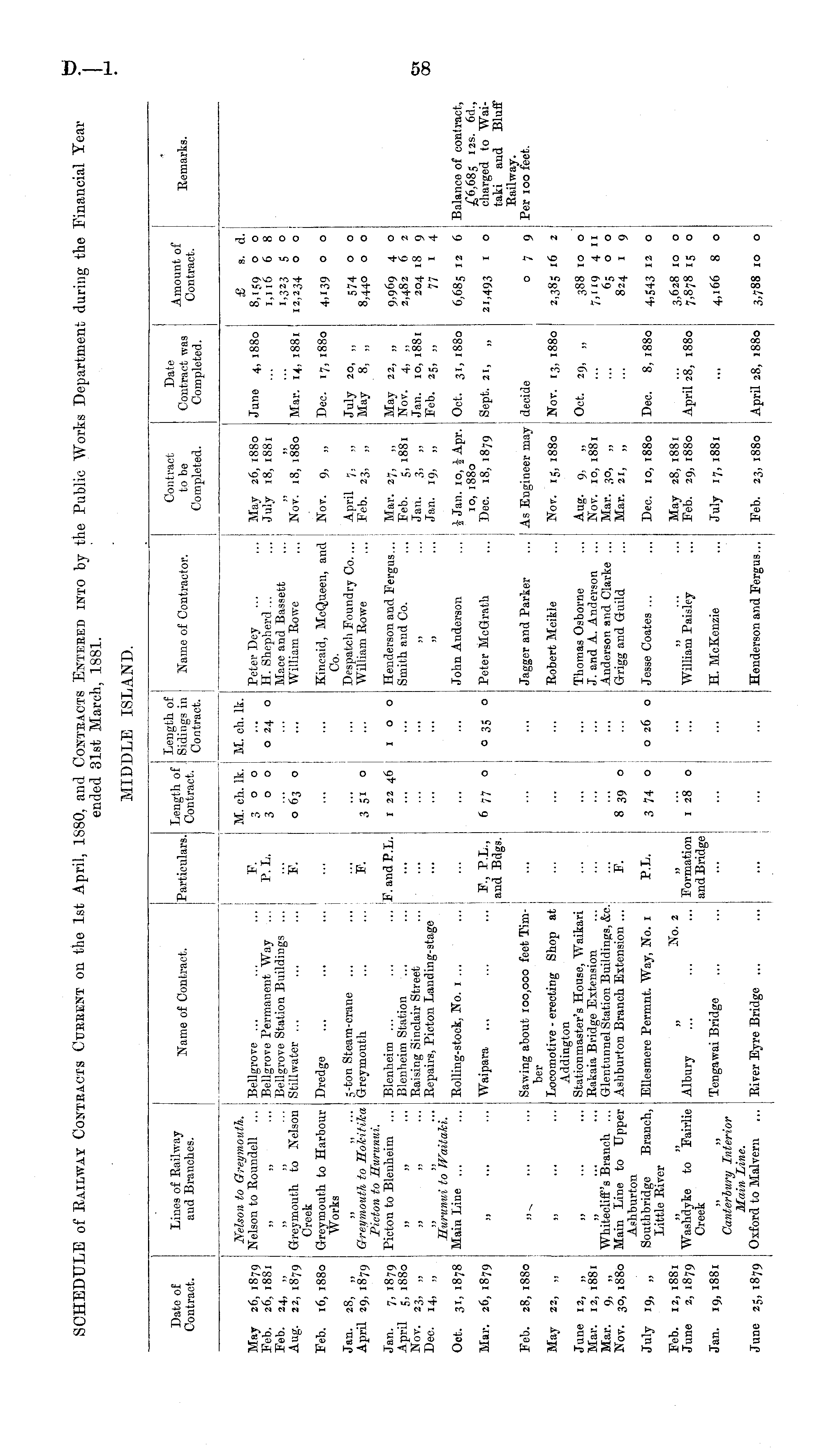 SCHEDULE of Railway Contracts Current on the 1st April, 1880, and Contracts Entered into by the Public Works Department during the Financial Year ended 31st March, 1881. MIDDLE ISLAND.