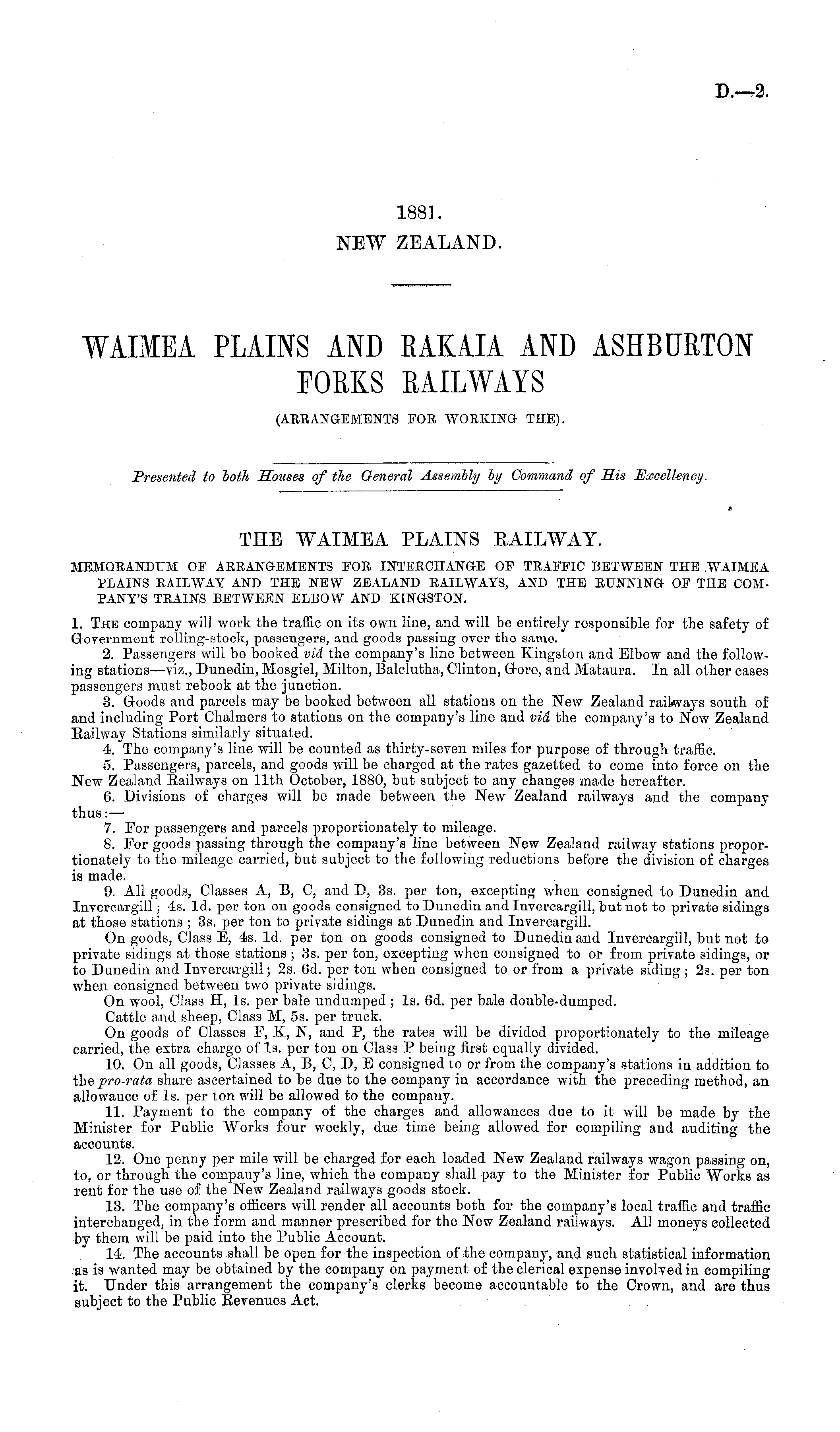 THE WAIMEA PLAINS RAILWAY. MEMORANDUM OF ARRANGEMENTS FOR INTERCHANGE OF TRAFFIC BETWEEN THE WAIMEA PLAINS RAILWAY AND THE NEW ZEALAND RAILWAYS, AND THE RUNNING OF THE COMPANY'S TRAINS BETWEEN ELBOW AND KINGSTON. 1. The company will work the traffic on its own line, and will be entirely responsible for the safety of Government rolling-stock, passengers, and goods passing over the same. 2. Passengers will be booked vid the company's line between Kingston and Elbow and the following stations —viz., Duneclin, Mosgiel, Milton, Balclutha, Clinton, Gore, and Mataura. In all other cases passengers must rebook at the junction. 3. Goods and parcels may be booked between all stations on the New Zealand railways south of and including Port Chalmers to stations on the company's line and vid the company's to New Zealand Railway Stations similarly situated. 4. The company's line will be counted as thirty-seven miles for purpose of through traffic. 5. Passengers, parcels, and goods will be charged at the rates gazetted to come into force on the New Zealand Railways on 11th October, 1880, but subject to any changes made hereafter. 6. Divisions of charges will be made between the New Zealand railways and the company thus: — 7. For passengers and parcels proportionately to mileage. 8. For goods passing through the company's line between New Zealand railway stations proportionately to the mileage carried, but subject to the following reductions before the division of charges is made. 9. All goods, Classes A, B, C, and D, 3s. per ton, excepting when consigned to Dunedin and Invereargill; 4s. Id. per ton on goods consigned to Duneclin and Invercargill, but not to privato sidings at those stations ; 3s. per ton to private sidings at Dunedin and Invercargill. On goods, Class E, 4s. Id. per ton on goods consigned to Dunedin and Invercargill, but not to private sidings at those stations ; 3s. per ton, excepting when consigned to or from private sidings, or to Dunedin and Invercargill; 2s. 6d. per ton when consigned to or from a private siding ; 2s. per ton when consigned between two private sidings. On wool, Class H, Is. per bale undumped ; Is. 6d. per bale double-dumped. Cattle and sheep, Class M, ss. per truck. On goods of Classes F, X, N, and P, the rates will be divided proportionately to the mileage carried, the extra charge of Is. per ton on Class P being first equally divided. 10. On all goods, Classes A, B, C, D, E consigned to or from the company's stations in addition to the pro-rata share ascertained to be due to the company iv accordance with the preceding method, an allowance of Is. per ton will be allowed to the company. 11. Payment to the company of the charges and allowances due to it will be made by the Minister for Public "Works four weekly, due time being allowed for compiling and auditing the accounts. 12. One penny per mile will be charged for each loaded New Zealand railways wagon passing on, to, or through the company's line, which the company shall pay to the Minister for Public "Works as rent for the use of the New Zealand railways goods stock. 13. The company's officers will render all accounts both for the company's local traffic and traffic interchanged, in the form and manner prescribed for the New Zealand railways. All moneys collected by them will be paid into the Public Account. 14. The accounts shall be open for the inspection of the company, and such statistical information as is wanted may be obtained by the company on payment of the clerical expense involved in compiling it. Under this arrangement the company's clerks become accountable to the Crown, and are thus subject to the Public Revenues Act.