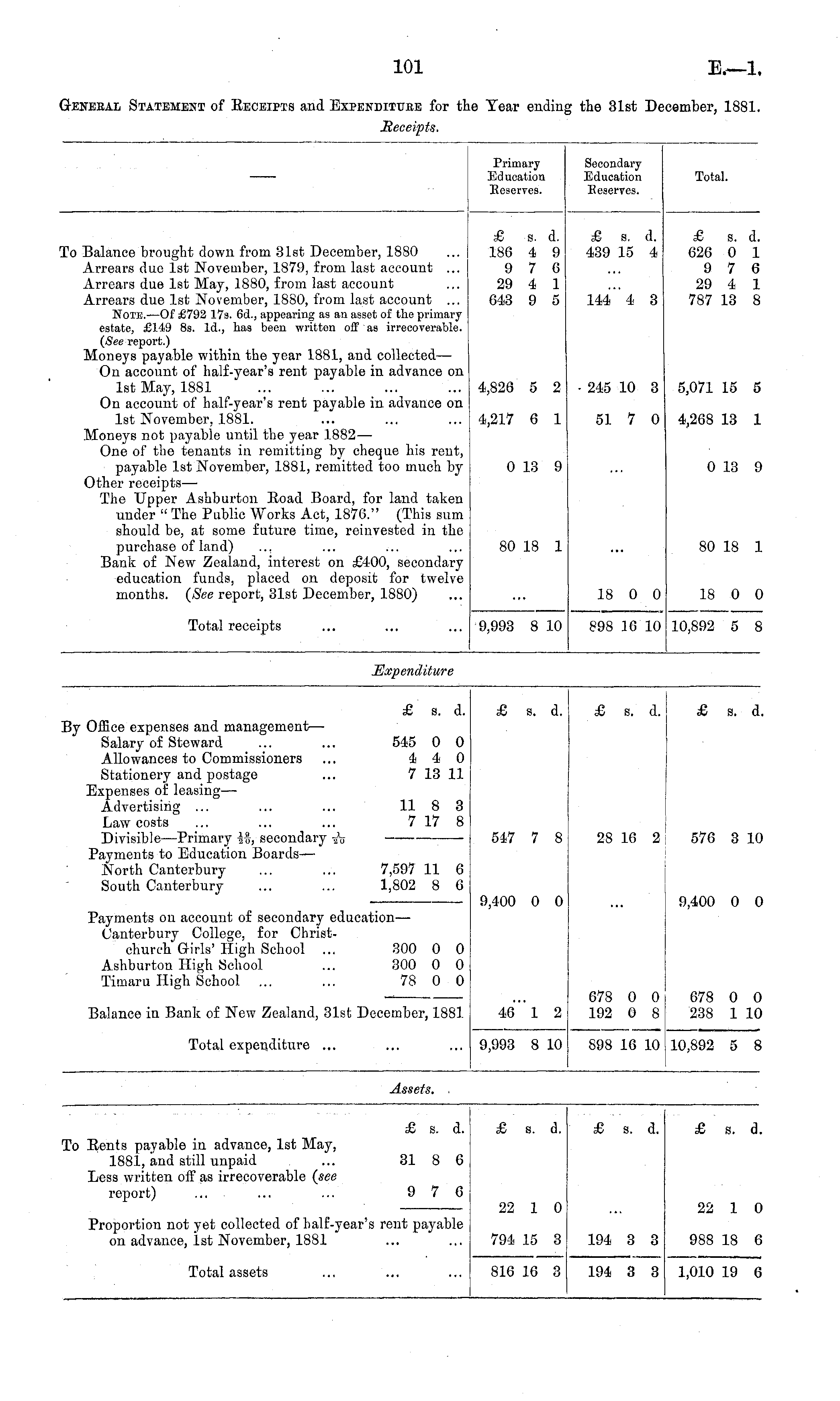 Primary Education Reserves. Secondary Education Eeserves. Total. 'o Balance brought down from 31st December, 1880 Arrears due 1st November, 1879, from last account ... Arrears due 1st May, 1880, from last account Arrears due 1st November, 1880, from last account ... Note.—Of £792 17s. 6d., appearing as an asset of tlie primary estate, £149 8s. Id., has been written off as irrecoverable. (See report.) Moneys payable within the year 1881, and collected — On account of half-year's rent payable in advance on 1st May, 1881 On account of half-year's rent payable in advance on 1st November, 1881. Moneys not payable until the year 1882— One of the tenants in remitting by cheque Ms rent, payable 1st November, 1881, remitted too much by Other receipts — The Upper Ashburton Eoad Board, for land taken under " The Public Works Act, 1876." (This sum should be, at some future time, reinvested in the purchase of land) Bank of New Zealand, interest on £400, secondary education funds, placed on deposit for twelve months. (See report, 31st December, 1880) £ s. d. 186 4 9 9 7 6 29 4 1 643 9 5 £ s. d. 439 15 4 £ s. d. 626 0 1 9 7 6 29 4 1 787 13 8 144 4 3 4,826 5 2 • 245 10 3 5,071 15 5 4,217 6 1 51 7 0 4,268 13 1 0 18 9 0 13 9 80 18 1 80 18 1 18 0 0 18 0 0 Total receipts 9,993 8 10 898 16 10 10,892 5