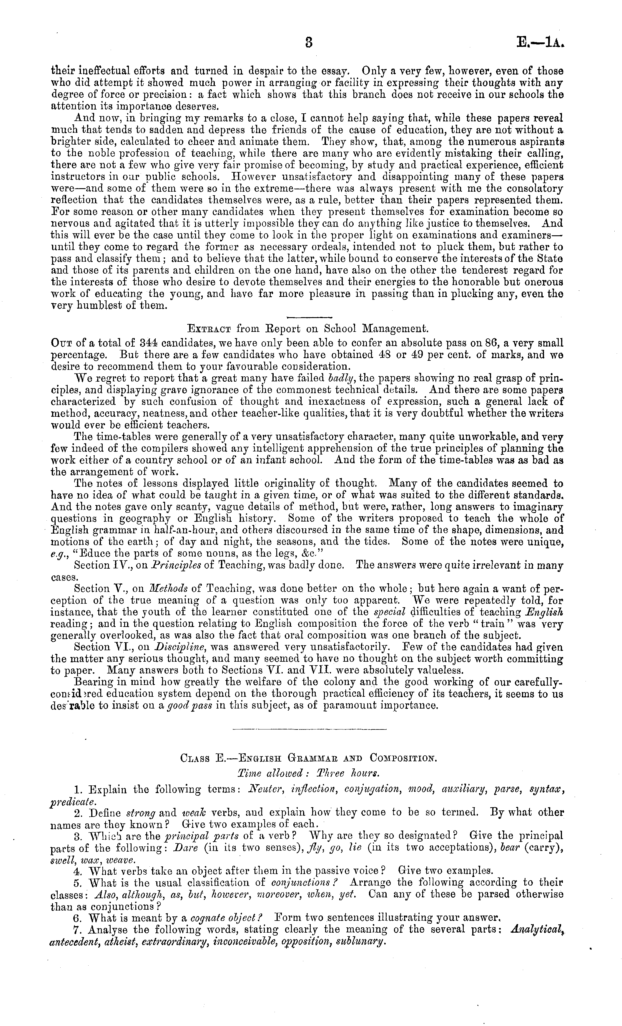 Class E.—English Grammar and Composition. Time allowed: Three hours. 1. Explain the following terms: Neuter, inflection, conjugation, mood, auxiliary, parse, syntax, predicate. 2. Define strong and weak verbs, and explain how they come to be so termed. By what other names are they known? Give two examples of each. 3. Which are the principal parts of a verb? Why are they so designated? Give the principal parts of the following: Dare (in its two senses), j^y, go, lie (in its two acceptations), Sear (carry), swell, wax, weave. 4. What verbs take an object after them in the passive voice ? Give two examples. 5. What is the usual classification of conjunctions? Arrange the following according to their classes; Also, although, as, but, however, moreover, when, yet. Can any of these be parsed otherwise than as conjunctions ? 6. What is meant by a cognate object? Porm two sentences illustrating your answer. 7. Analyse the following words, stating clearly the meaning of the several parts: Analytical^ antecedent, atheist, extraordinary, inconceivable, opposition, sublunary.